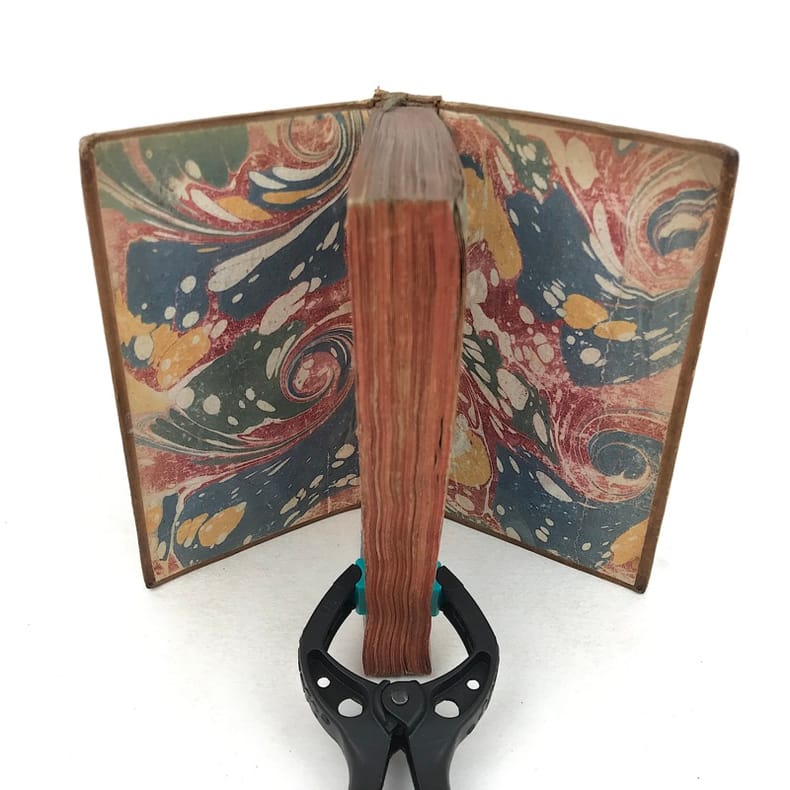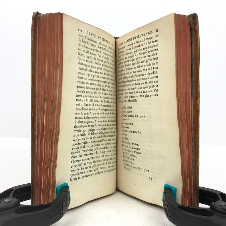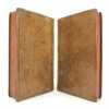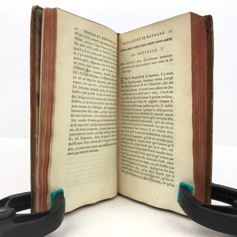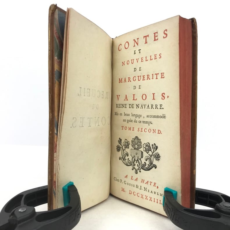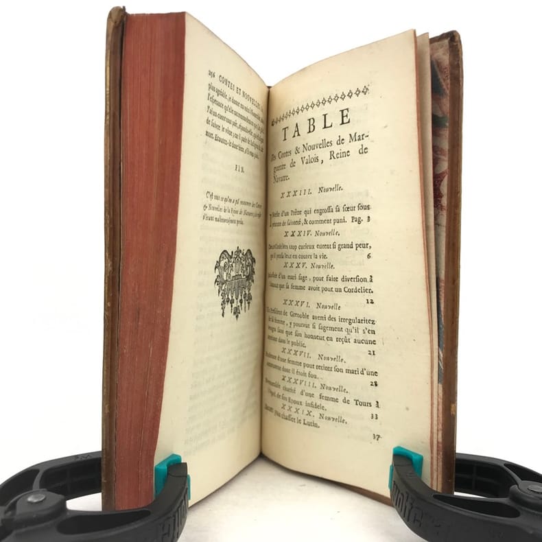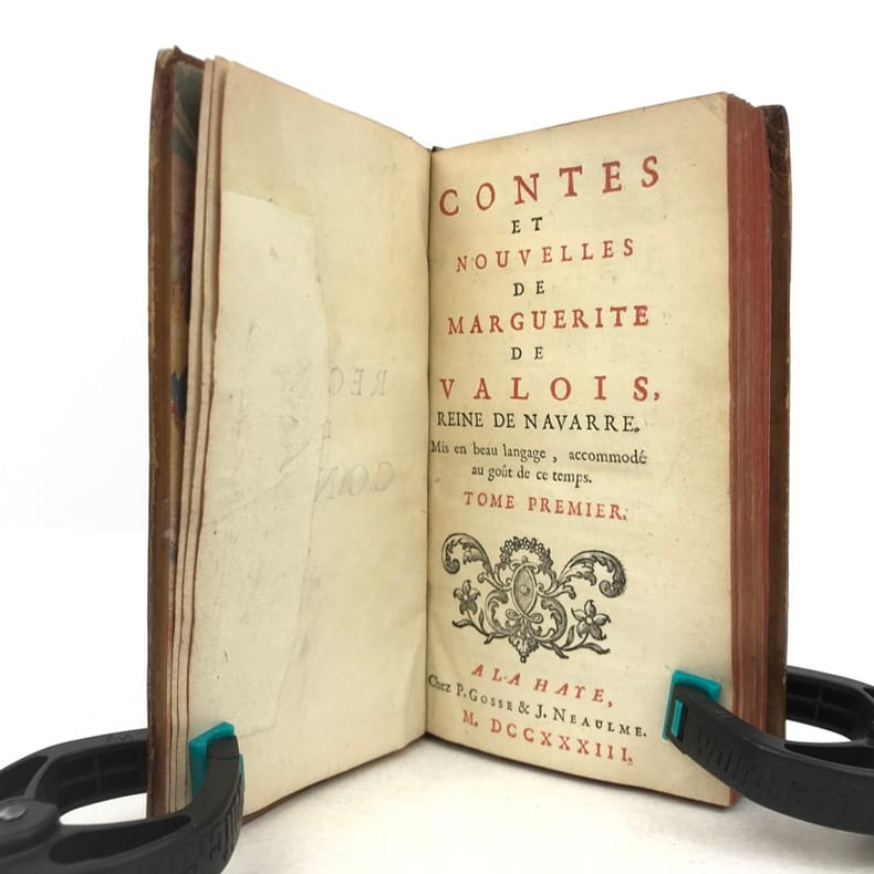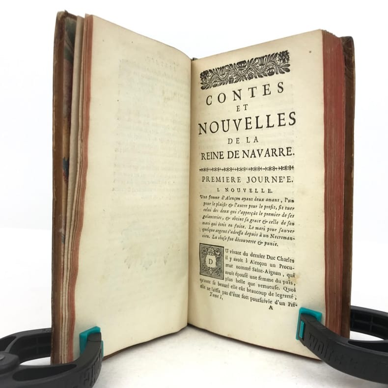 2 volumes in-16 (14 x 8 cm), veau fauve (reliure de l’époque), dos lisse orné, pièces de titre et de tomaison en maroquin rouge et fauve, filet à froid encadrant les plats, filet doré sur les coupes, tranches rouges, titre en rouge et noir, [20]-321-[7] ; [4]-256-[6] pages (complet). Un coin usé, accroc à la coiffe de tête du tome I, quelques taches sur les plats, quelques fines rousseurs. État très correct tout de même. Nouvelle édition. Nouvelle édition des “contes et nouvelles” de Marguerite de Navarre (1492-1549), sœur du roi de France François Ier, comprenant principalement son célèbre Heptaméron. Ce dernier se présente sous la forme d’un recueil inachevé de 72 nouvelles, dont le récit se déroule sur sept journées, la huitième étant incomplète.Agréable exemplaire. Vendu 02/10/2025