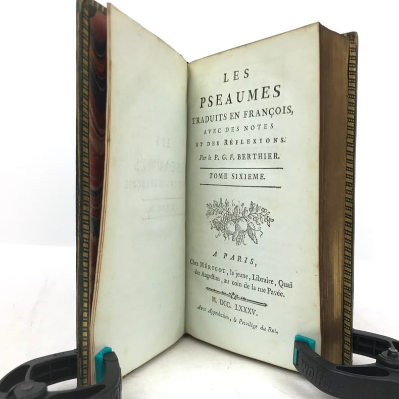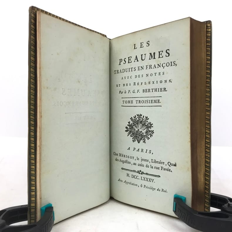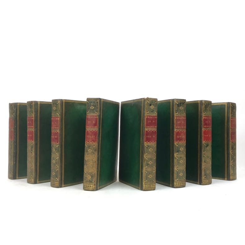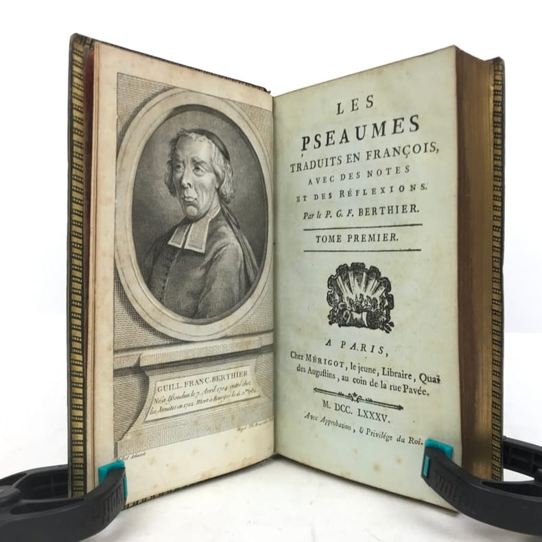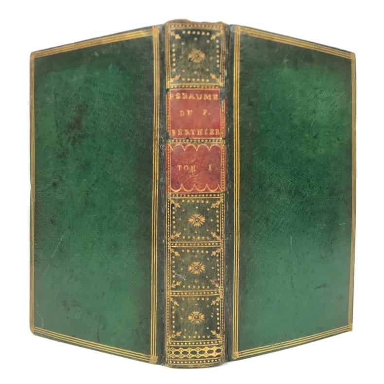 8 volumes in-12 ( 16,5 x 9,5 cm), maroquin vert émeraude (reliure de l’époque), dos lisses joliment ornés aux petits fers, pièces de titre et de tomaisons en maroquin rouge, triple filet doré en encadrement sur les plats avec fleuron aux angles, roulette dorée intérieure, tranches dorées, petite note manuscrite au verso de la garde colorée, [4]-lviii-[2]-508 ; [4]-522-[4] ; [4]-519-[3] ; [4]-519-[3] ; [4]-520-[2] ; [4]-567-[1] ; [4]-600-[2] ; [4]-689-[3] pages (complet). Reliures inégalement insolées, petits frottements aux dos, aux charnières, sur les chants, aux coiffes, certaines avec accident, coins émoussés, quelques pâles rousseurs éparses sans gêne de lecture. État correct. Première édition en français avec notes et des réflexions, illustrée d’un portrait-frontispice de l’auteur gravé sur cuivre par Rousselet d’après Malbel.Guillaume François Berthier (1704 -1782), jésuite français écrivain et polémiste. Il professa les humanités au collège royal de Blois, la philosophie à Rennes et à Rouen, puis la théologie à Paris ; il devint rédacteur du Journal de Trévoux à partir de 1745, fonction qu'il exerça jusqu'à la suppression des Jésuites en 1762. Il eut de vifs démêlés avec Voltaire et avec les encyclopédistes, dont il avait hardiment censuré les écrits. À la fin de 1762, le Dauphin le fit nommer garde de la Bibliothèque royale, et adjoint à l'éducation du duc de Berry (Louis XVI) et de Monsieur (Louis XVIII). Plaisant exemplaire sur papier vergé avec certains cahiers légèrement vert d’eau, non justifié.