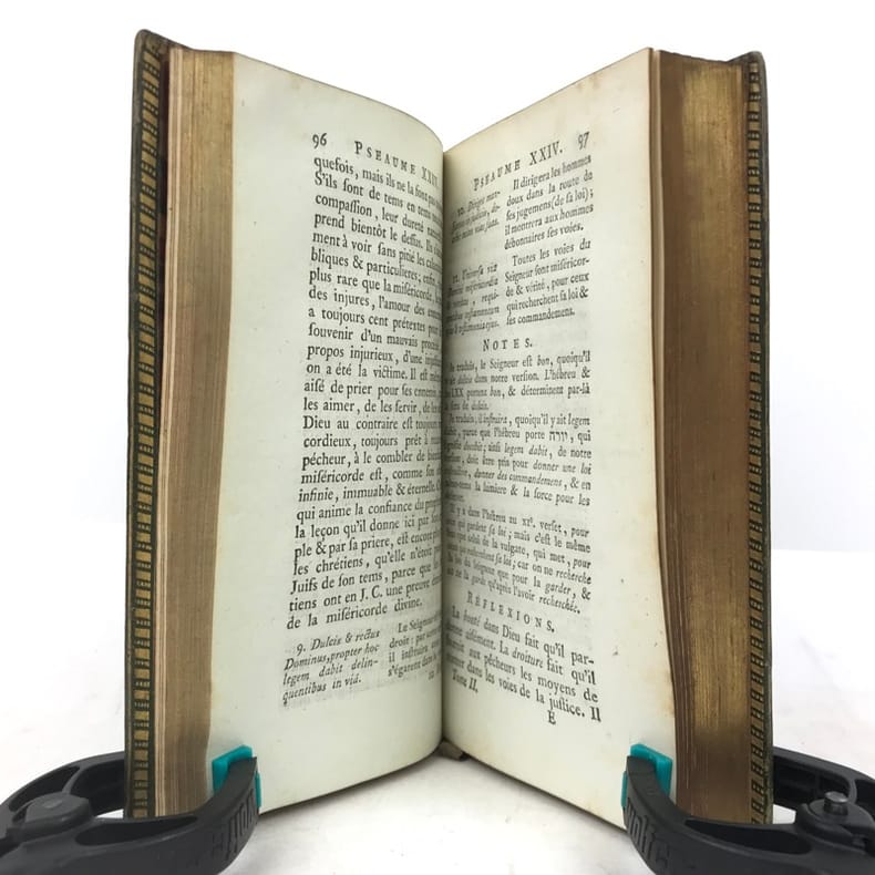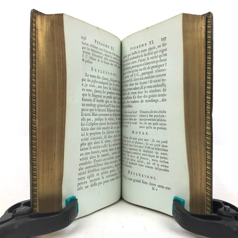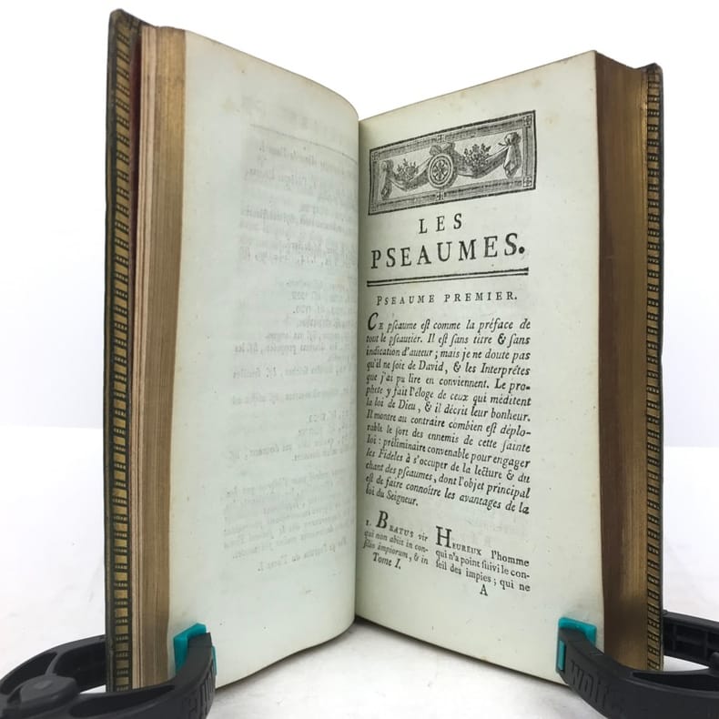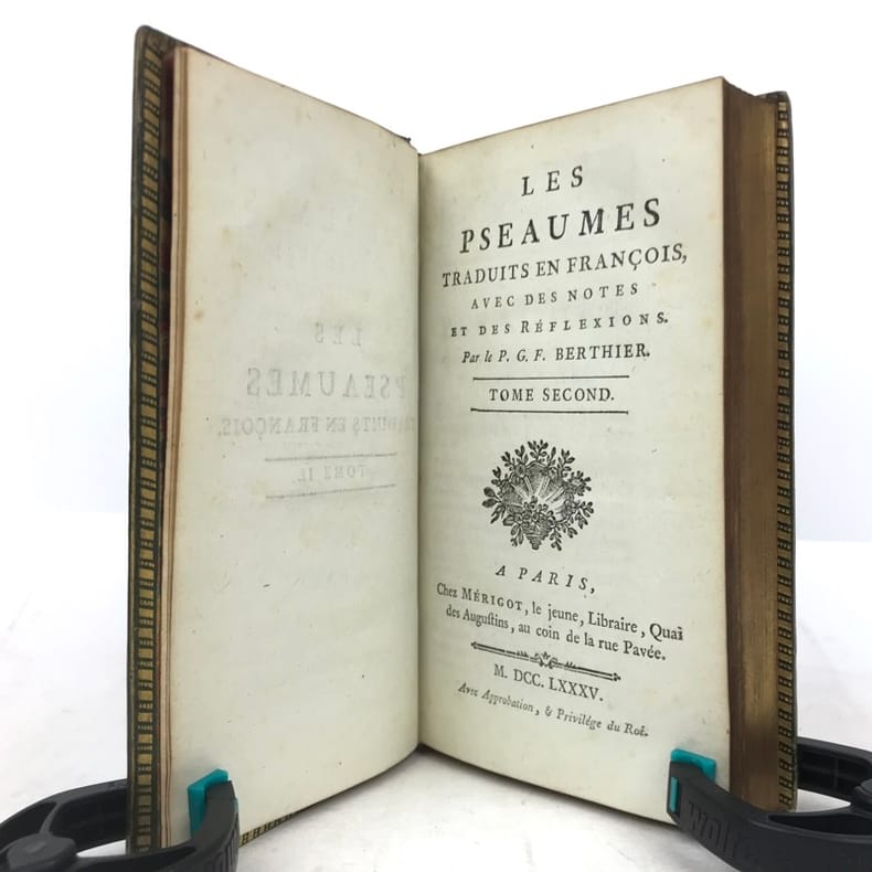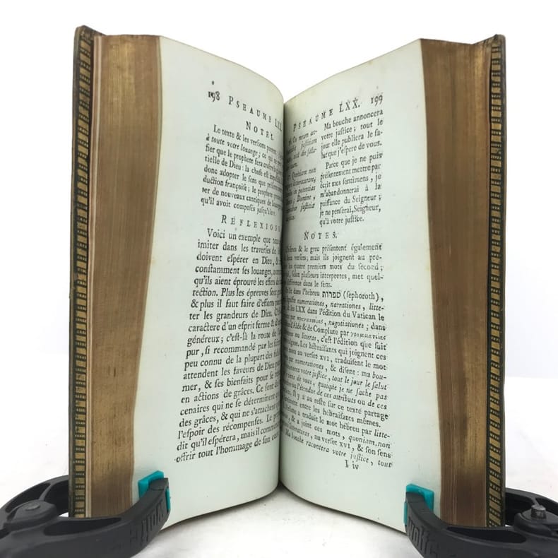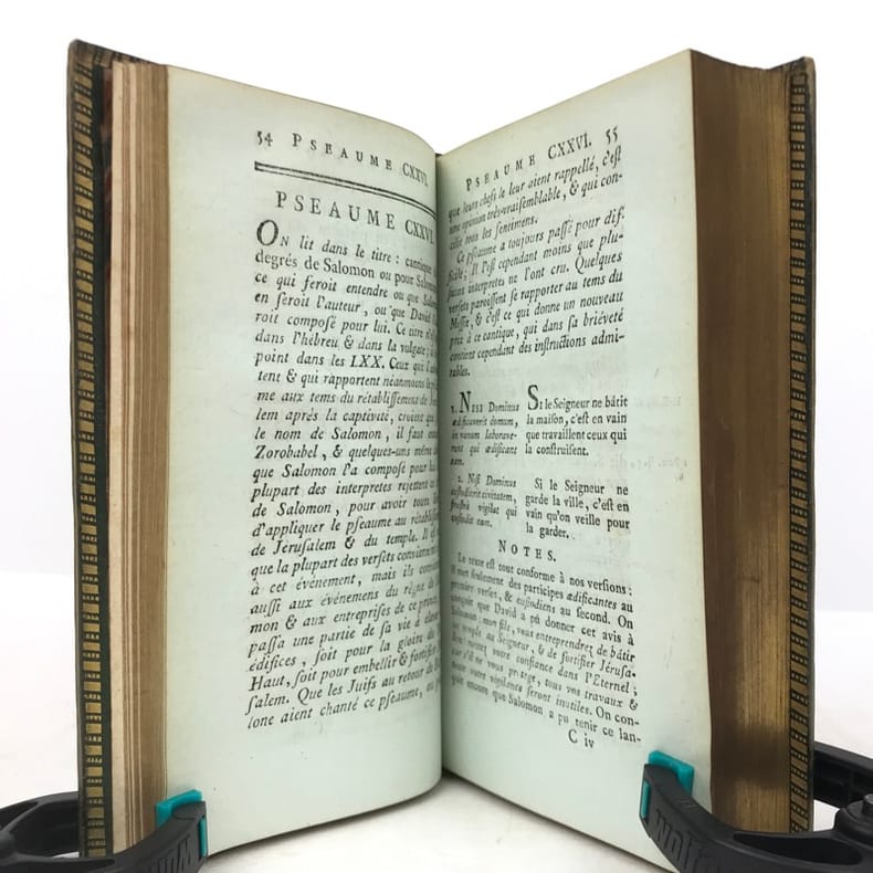 8 volumes in-12 ( 16,5 x 9,5 cm), maroquin vert émeraude (reliure de l’époque), dos lisses joliment ornés aux petits fers, pièces de titre et de tomaisons en maroquin rouge, triple filet doré en encadrement sur les plats avec fleuron aux angles, roulette dorée intérieure, tranches dorées, petite note manuscrite au verso de la garde colorée, [4]-lviii-[2]-508 ; [4]-522-[4] ; [4]-519-[3] ; [4]-519-[3] ; [4]-520-[2] ; [4]-567-[1] ; [4]-600-[2] ; [4]-689-[3] pages (complet). Reliures inégalement insolées, petits frottements aux dos, aux charnières, sur les chants, aux coiffes, certaines avec accident, coins émoussés, quelques pâles rousseurs éparses sans gêne de lecture. État correct. Première édition en français avec notes et des réflexions, illustrée d’un portrait-frontispice de l’auteur gravé sur cuivre par Rousselet d’après Malbel.Guillaume François Berthier (1704 -1782), jésuite français écrivain et polémiste. Il professa les humanités au collège royal de Blois, la philosophie à Rennes et à Rouen, puis la théologie à Paris ; il devint rédacteur du Journal de Trévoux à partir de 1745, fonction qu'il exerça jusqu'à la suppression des Jésuites en 1762. Il eut de vifs démêlés avec Voltaire et avec les encyclopédistes, dont il avait hardiment censuré les écrits. À la fin de 1762, le Dauphin le fit nommer garde de la Bibliothèque royale, et adjoint à l'éducation du duc de Berry (Louis XVI) et de Monsieur (Louis XVIII). Plaisant exemplaire sur papier vergé avec certains cahiers légèrement vert d’eau, non justifié.
