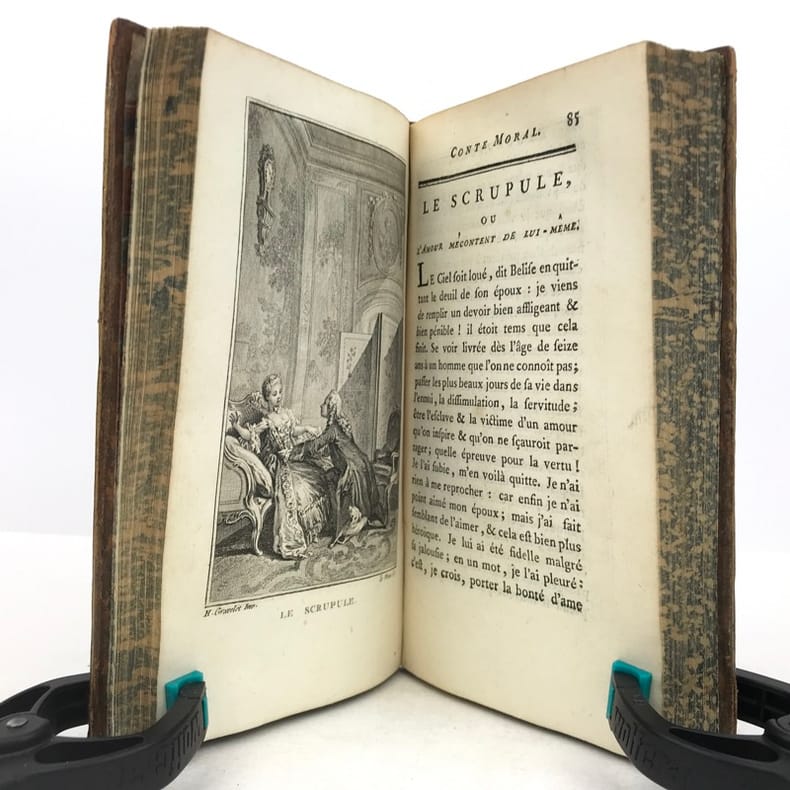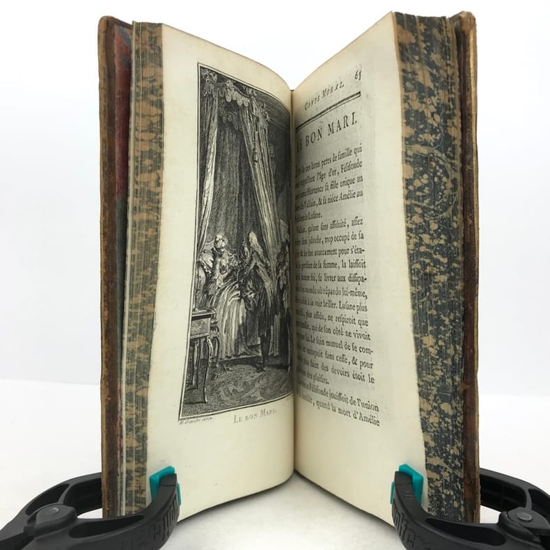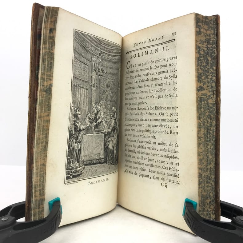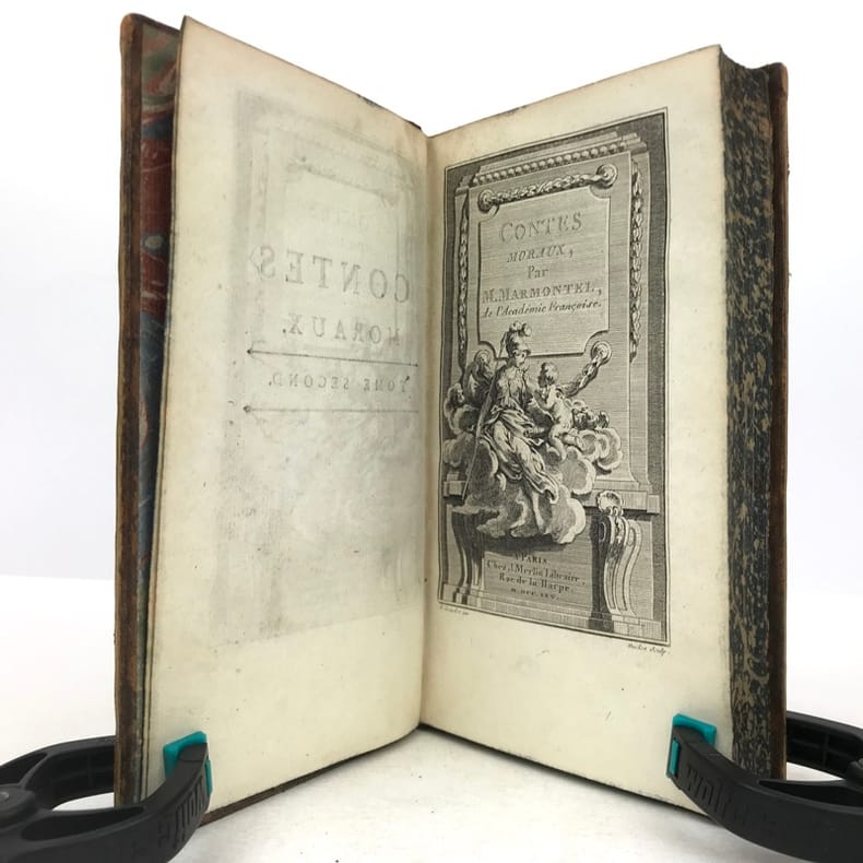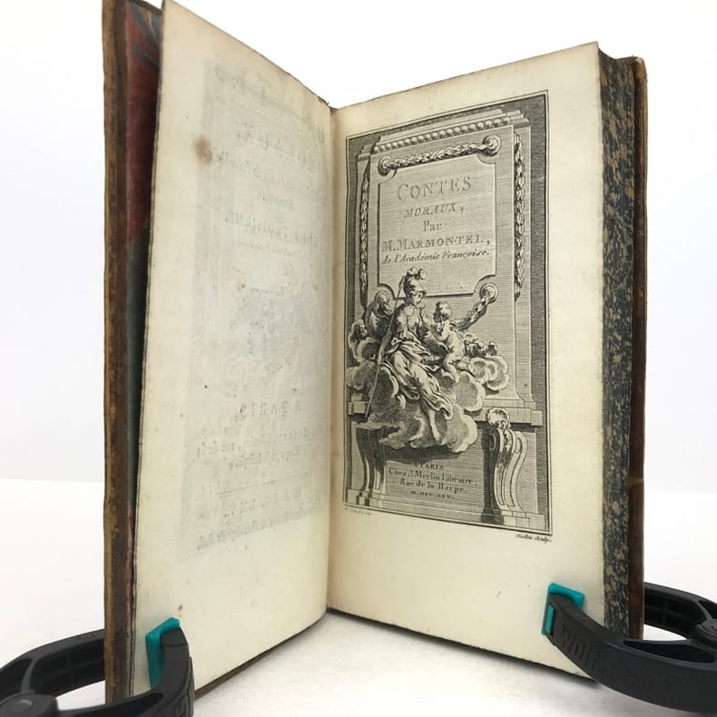 1765 Couverture rigide. A Paris, chez J. Merlin, 1765. 3 volumes in-12 (17,5 x 10,5 cm), reliure plein veau marbré, dos lisse orné de fleurons dorés, triple filet doré d'encadrement sur les plats, filet doré sur les coupes, tranches marbrées, coins émoussés, coiffes arasées, manques au dos et aux charnières. Tome I : Feuillet de faux titre non chiffré, faux-titre, portrait frontispice, titre gravé, xvj pages, feuillet de table non chiffré, 345 pages, 9 figures ; Tome II : feuillet de faux-titre non chiffré, titre gravé, feuillet de table non chiffré, 376 pages, 9 figures ; Tome III : feuillet de titre non chiffré, titre gravé, feuillet de table non chiffré, 312 pages, 5 figures. Rousseurs éparses et quelques marques de brûlures à la cire, feuillets bruni. En tout, comme l'indique Cohen (686), un portrait par Cochin, gravé par Saint-Aubin, un titre par Gravelot, gravé par Duclos, répété dans chaque volume, 23 figures par Gravelot, gravées par Baquoy, Legrand, Le Mire, Le Veau, de Longueil, Pasquier, Rousseau et Voyez. Exemplaire du 2ème tirage sans les errata. Les "Contes moraux" de Marmontel sont une série de récits courts qui explorent les mœurs et les valeurs de la société du XVIIIe siècle. Chaque conte met en scène des personnages de différentes classes sociales confrontés à des dilemmes moraux ou à des situations révélatrices de leur caractère. L'auteur utilise l'ironie et l'humour pour critiquer les vices et les travers de son époque tout en proposant des leçons de vertu. À sa parution, les "Contes moraux" ont connu un grand succès et ont contribué à la renommée de Marmontel. Ils ont influencé de nombreux écrivains et penseurs de l'époque des Lumières en France et ailleurs. Les contes sont encore étudiés aujourd'hui pour leur valeur littéraire et leur pertinence morale. Malgré les défauts de la reliure, exemplaire intéressant avec un texte en assez bon état et un bon état général des planches.
