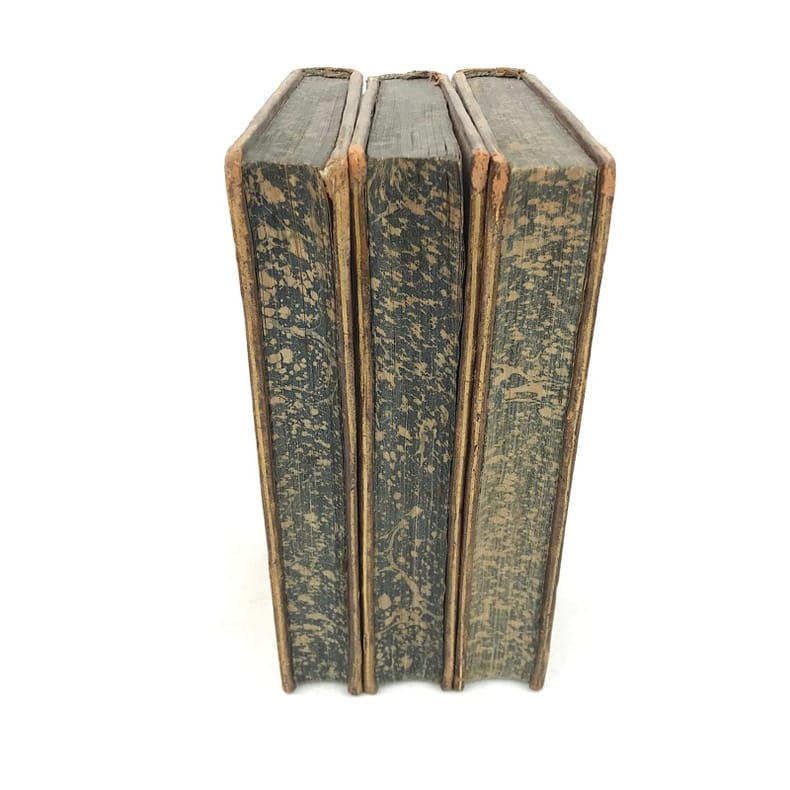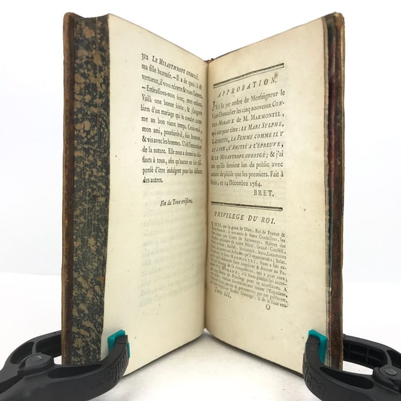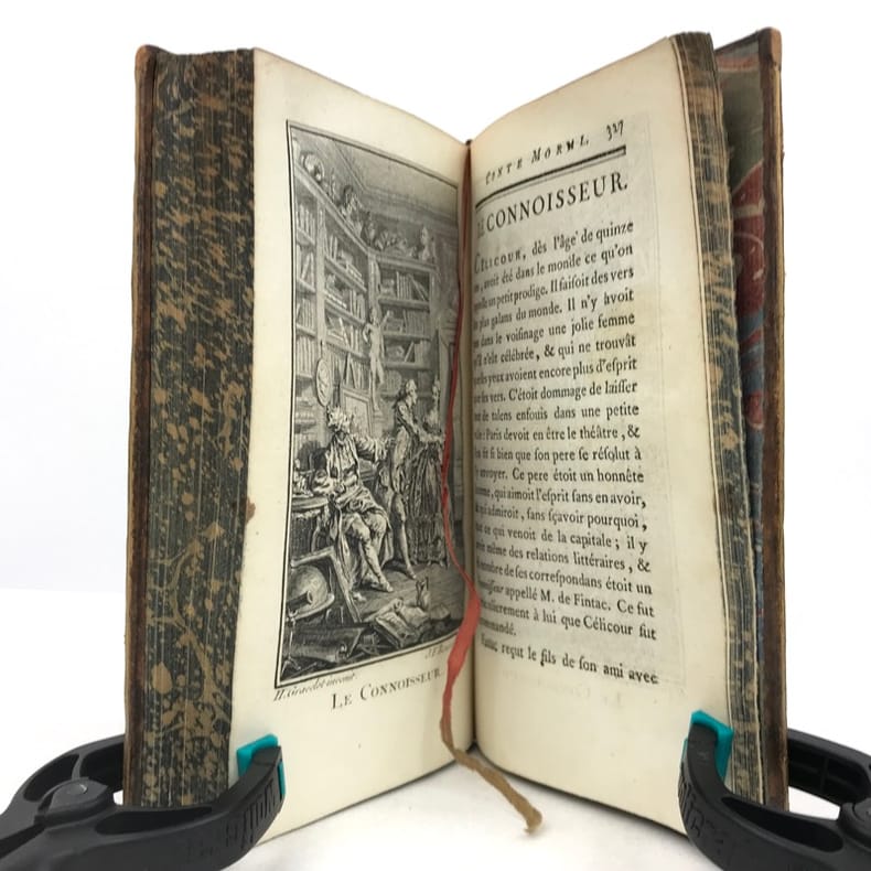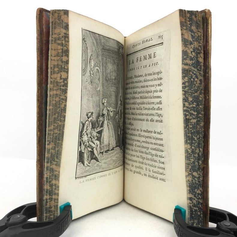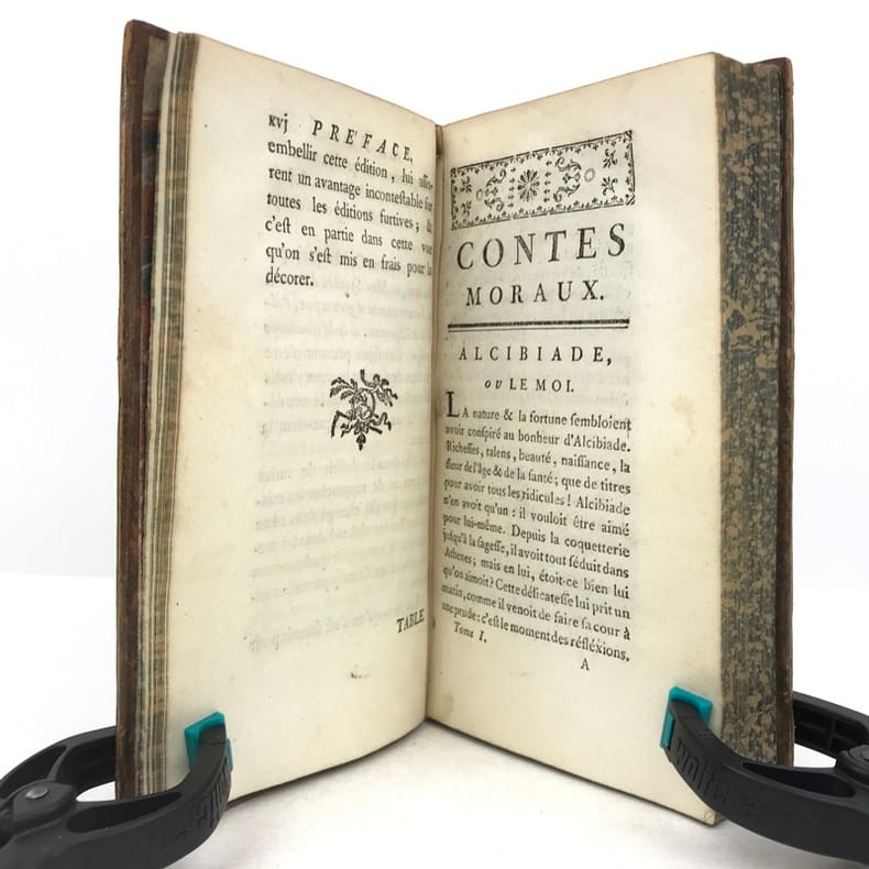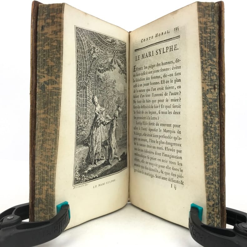 1765 Couverture rigide. A Paris, chez J. Merlin, 1765. 3 volumes in-12 (17,5 x 10,5 cm), reliure plein veau marbré, dos lisse orné de fleurons dorés, triple filet doré d'encadrement sur les plats, filet doré sur les coupes, tranches marbrées, coins émoussés, coiffes arasées, manques au dos et aux charnières. Tome I : Feuillet de faux titre non chiffré, faux-titre, portrait frontispice, titre gravé, xvj pages, feuillet de table non chiffré, 345 pages, 9 figures ; Tome II : feuillet de faux-titre non chiffré, titre gravé, feuillet de table non chiffré, 376 pages, 9 figures ; Tome III : feuillet de titre non chiffré, titre gravé, feuillet de table non chiffré, 312 pages, 5 figures. Rousseurs éparses et quelques marques de brûlures à la cire, feuillets bruni. En tout, comme l'indique Cohen (686), un portrait par Cochin, gravé par Saint-Aubin, un titre par Gravelot, gravé par Duclos, répété dans chaque volume, 23 figures par Gravelot, gravées par Baquoy, Legrand, Le Mire, Le Veau, de Longueil, Pasquier, Rousseau et Voyez. Exemplaire du 2ème tirage sans les errata. Les "Contes moraux" de Marmontel sont une série de récits courts qui explorent les mœurs et les valeurs de la société du XVIIIe siècle. Chaque conte met en scène des personnages de différentes classes sociales confrontés à des dilemmes moraux ou à des situations révélatrices de leur caractère. L'auteur utilise l'ironie et l'humour pour critiquer les vices et les travers de son époque tout en proposant des leçons de vertu. À sa parution, les "Contes moraux" ont connu un grand succès et ont contribué à la renommée de Marmontel. Ils ont influencé de nombreux écrivains et penseurs de l'époque des Lumières en France et ailleurs. Les contes sont encore étudiés aujourd'hui pour leur valeur littéraire et leur pertinence morale. Malgré les défauts de la reliure, exemplaire intéressant avec un texte en assez bon état et un bon état général des planches.