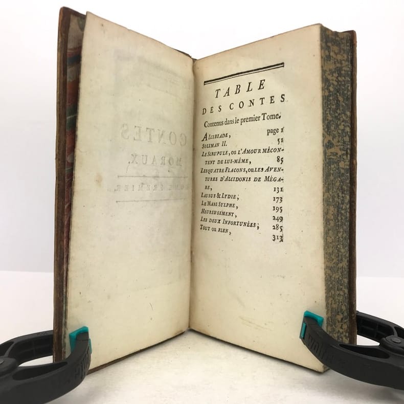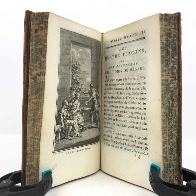 Rare édition avignonnaise, imprimée la même année que l'originale parisienne. 15 contes et L'Apologie du théâtre. La Suite des contes moraux possède son propre titre, à l'adresse de Paris, Lesclapart, 1762. Elle renferme Le bon mari ; Le connoisseur ; L'école des pères. Cette Suite... rare, non signalée, s'inscrit entre l'édition originale et la seconde édition (1765), toutes deux données par Lesclapart. - Exemplaire un peu fané, coiffes arrachées, intérieur des volumes correct, traces d'ex-libris.