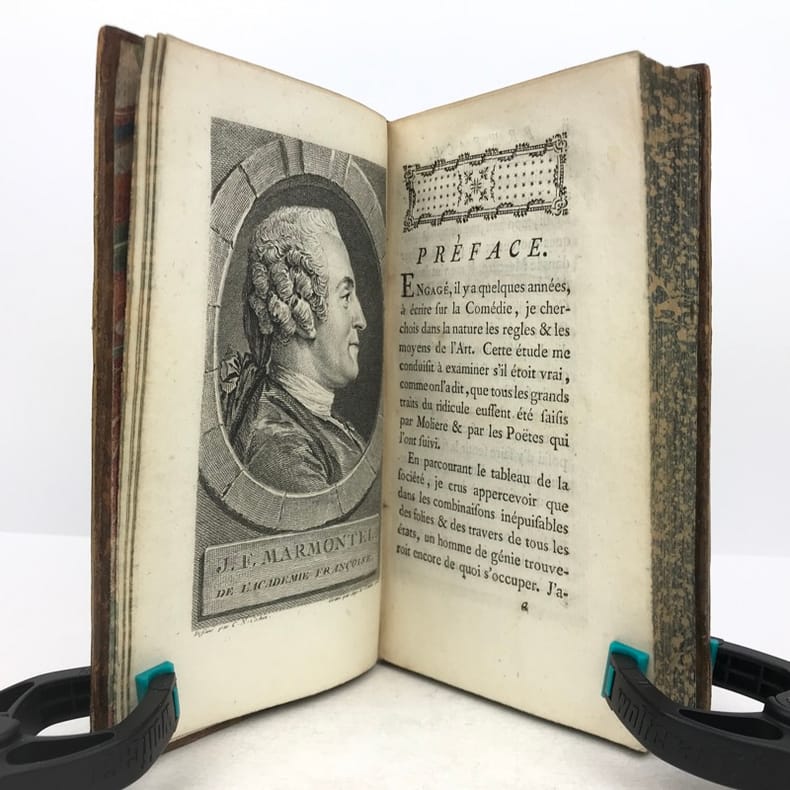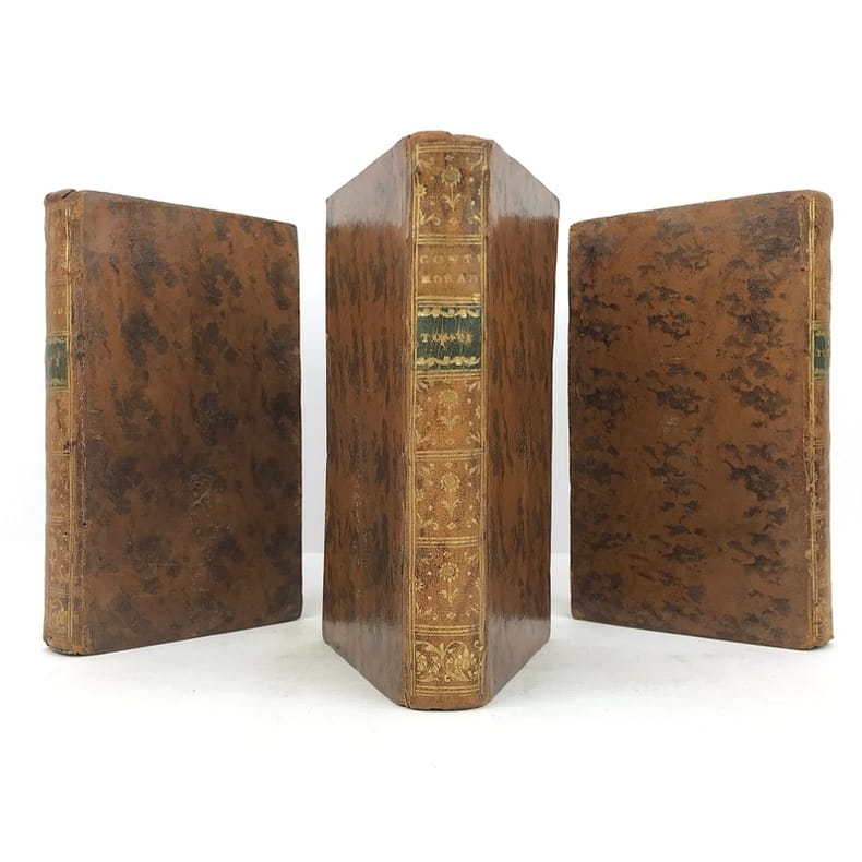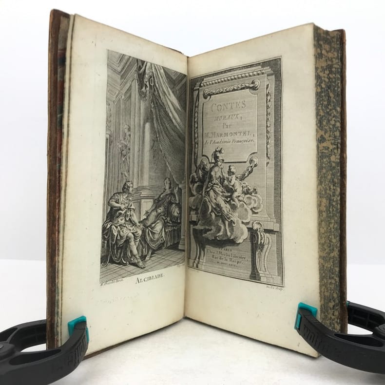 3 volumes in-12 (17 x 9,5 cm), basane marbrée (reliure de l’époque), dos lisse orné, pièces de titre et de tomaison en basane fauve et verte, filet doré sur les coupes, tranches marbrées, ex-libris de F. M. Caye, [4]-xvi-345-[1] ; [4]-376 ; [4]-312-[4] pages (complet). Légers frottements aux coins, quelques fines rousseurs éparses. État très correct. Nouvelle édition, illustrée de 3 titres gravés, d’un portrait en frontispice et de 23 planches hors-texte gravées sur cuivre, certaines par Gravelot. Jean-François Marmontel (1723-1799) est un écrivain, encyclopédiste, historien, conteur, romancier, grammairien et poète, dramaturge, philosophe français. Proche de Voltaire durant plusieurs décennies, il est à son l'image l'auteur de Contes moraux, inspirés par les jeunes couples et les relations matrimoniales du XVIIIe siècle. Agréable exemplaire.