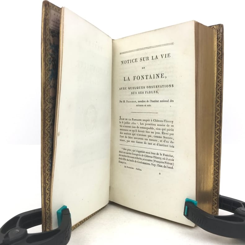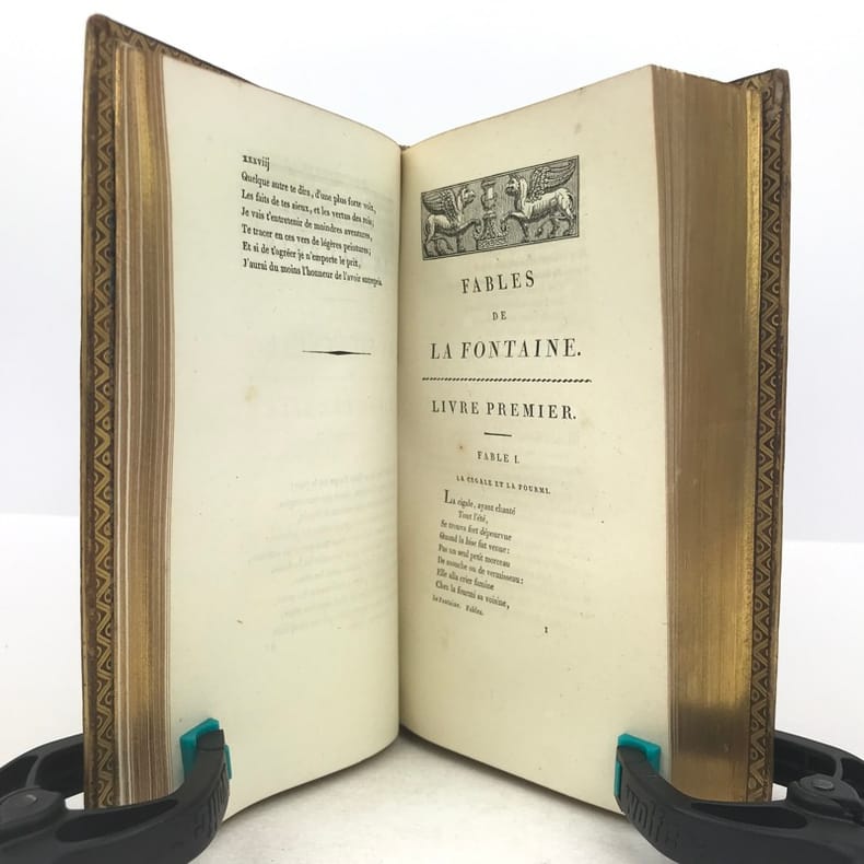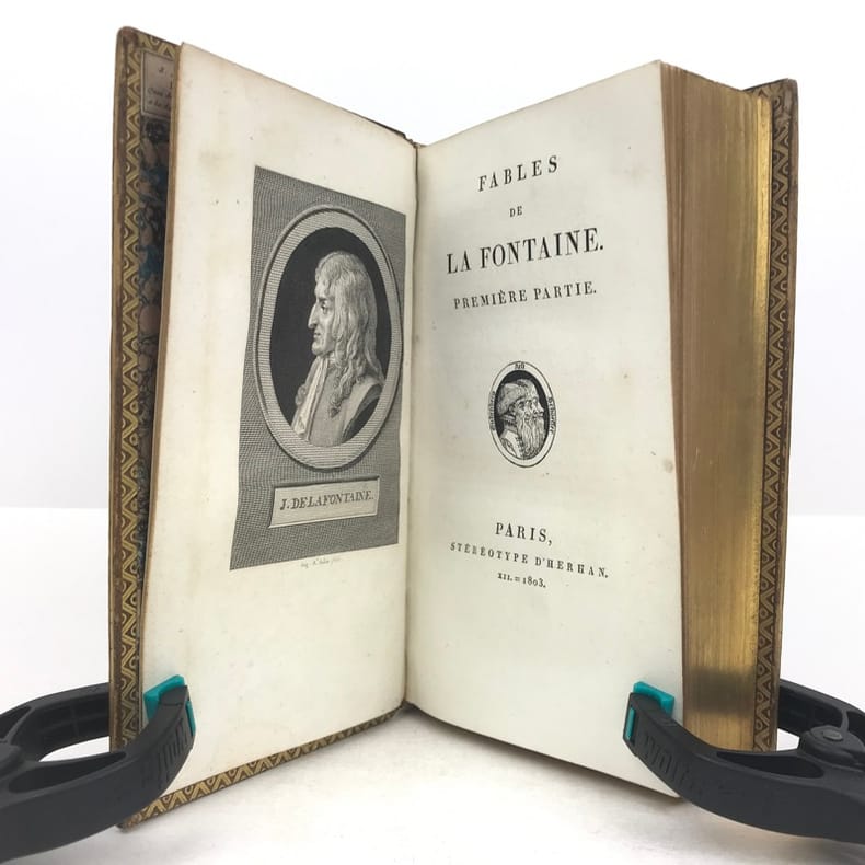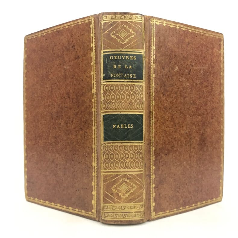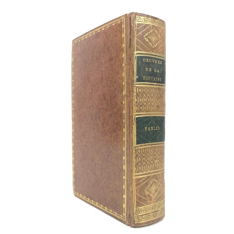 1 volume in-12 (17 cm x 9,5 cm), veau moucheté fauve (reliure d’époque), dos lisse à motifs dorés, pièce de titre et de tomaison vertes, roulette dorée en encadrement des plats, tranches dorées, roulette intérieure dorée, ex-libris de J.J. Blaise contrecollé sur le contreplat. lii-xxxviii-402-[1]-1 bl. pages. Galerie au mors, claires rousseurs, cahiers des pages 145 à 152 reliés à l’envers. Bon état. Nouvelle édition illustrée d’un portrait de l’auteur en frontispice. Premier volume de l'édition stéréotype des œuvres de la Fontaine publiée par Antoine-Augustin Renouard, en dix volumes. Ce volume contient une partie des fables de l'auteur. De La Fontaine, on ne retient souvent que les Fables. Elles sont le chef-d'œuvre de l'écrivain, l'aboutissement d'un cheminement poétique, un espace de liberté et d'invention. On connaît moins sa poésie élégiaque et ses récits poétiques qui mêlent la prose aux vers. Ses Contes sont célèbres pour leur versification irrégulière et leur parfum sulfureux. Amoureux de la forme, La Fontaine est toujours en quête de renouvellement poétique. Ses Contes (publiés jusqu'en 1685) et ses Fables (dernier livre en 1694) restent pour tout le XVIIIe siècle une référence obligée et un modèle inépuisable. Bel exemplaire.