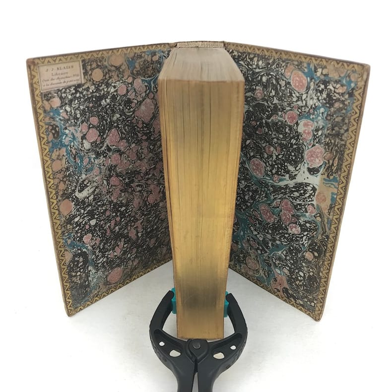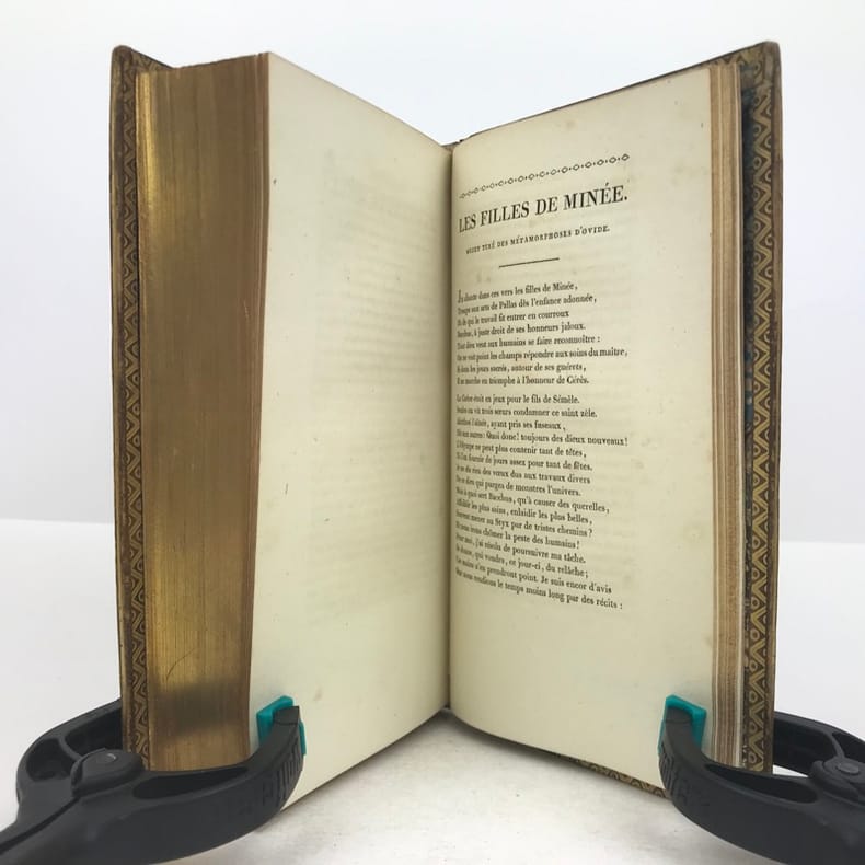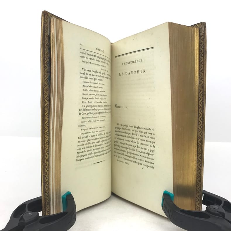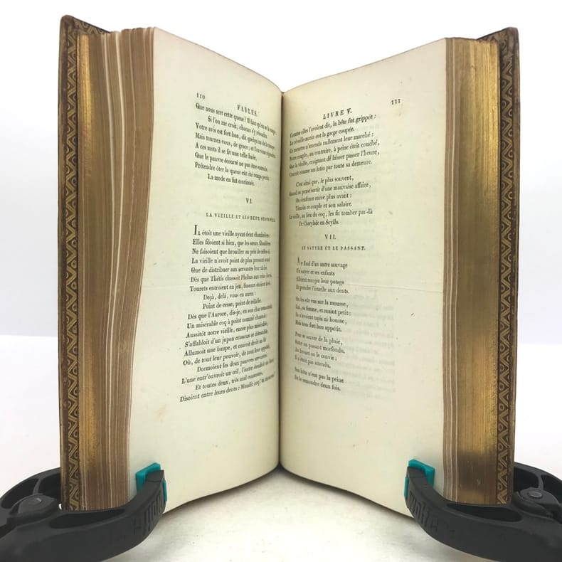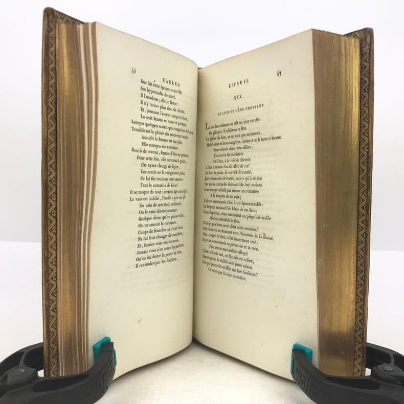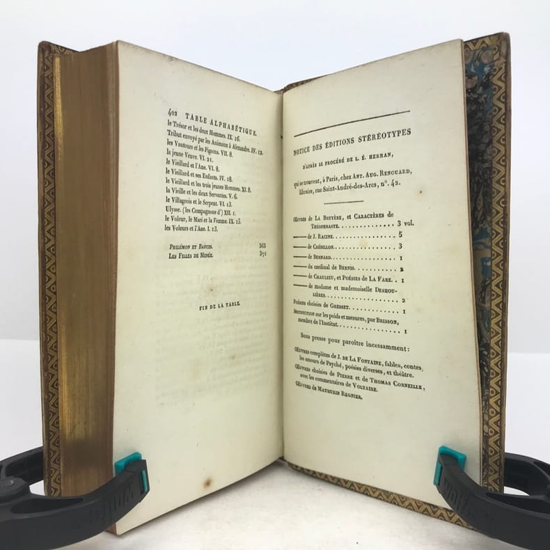 1 volume in-12 (17 cm x 9,5 cm), veau moucheté fauve (reliure d’époque), dos lisse à motifs dorés, pièce de titre et de tomaison vertes, roulette dorée en encadrement des plats, tranches dorées, roulette intérieure dorée, ex-libris de J.J. Blaise contrecollé sur le contreplat. lii-xxxviii-402-[1]-1 bl. pages. Galerie au mors, claires rousseurs, cahiers des pages 145 à 152 reliés à l’envers. Bon état. Nouvelle édition illustrée d’un portrait de l’auteur en frontispice. Premier volume de l'édition stéréotype des œuvres de la Fontaine publiée par Antoine-Augustin Renouard, en dix volumes. Ce volume contient une partie des fables de l'auteur. De La Fontaine, on ne retient souvent que les Fables. Elles sont le chef-d'œuvre de l'écrivain, l'aboutissement d'un cheminement poétique, un espace de liberté et d'invention. On connaît moins sa poésie élégiaque et ses récits poétiques qui mêlent la prose aux vers. Ses Contes sont célèbres pour leur versification irrégulière et leur parfum sulfureux. Amoureux de la forme, La Fontaine est toujours en quête de renouvellement poétique. Ses Contes (publiés jusqu'en 1685) et ses Fables (dernier livre en 1694) restent pour tout le XVIIIe siècle une référence obligée et un modèle inépuisable. Bel exemplaire.