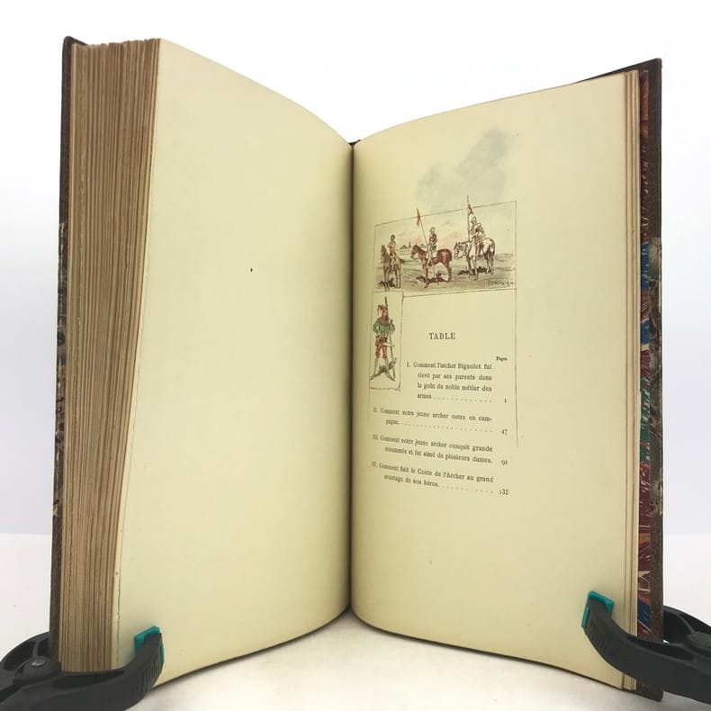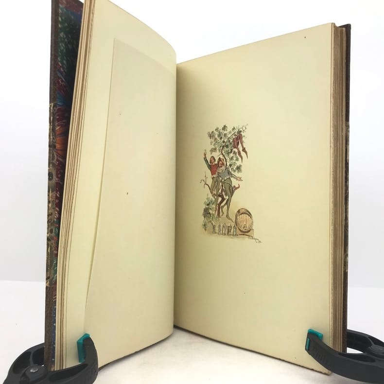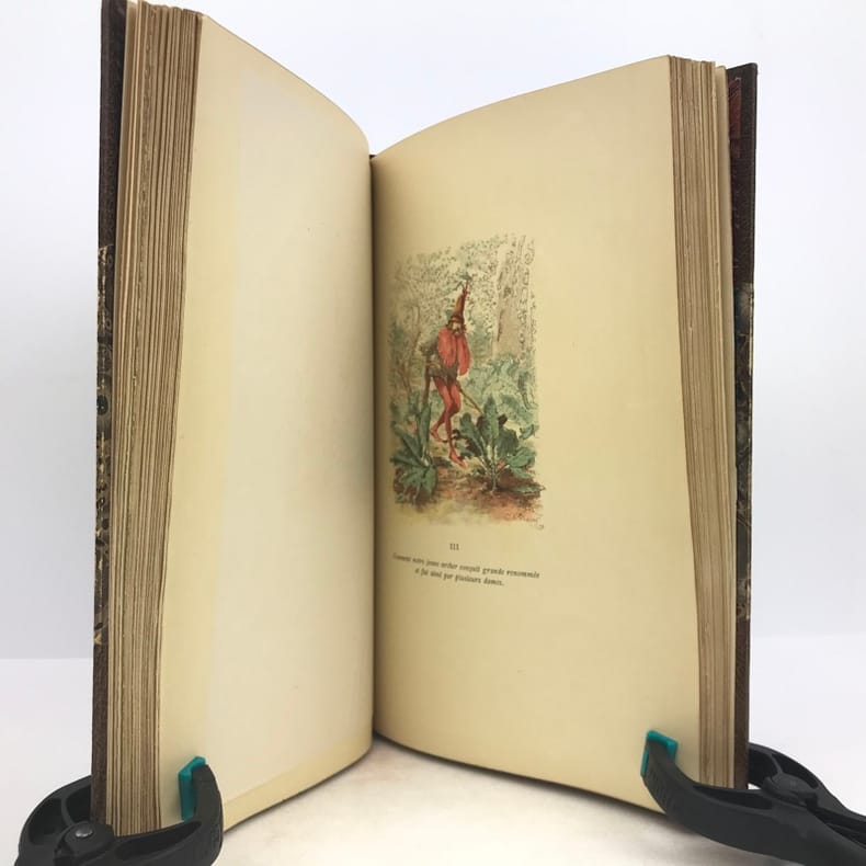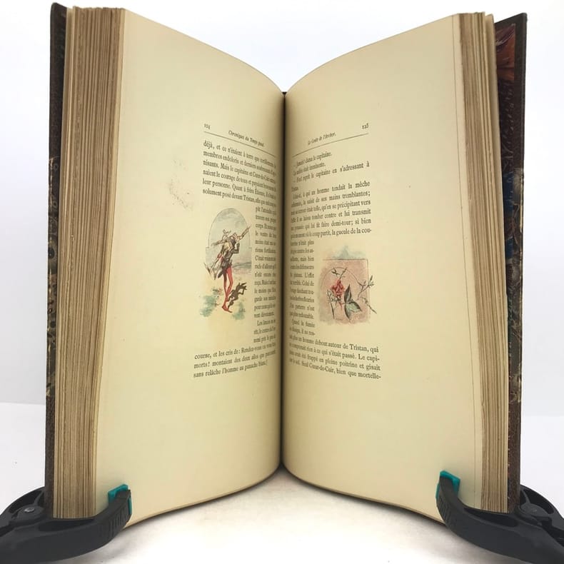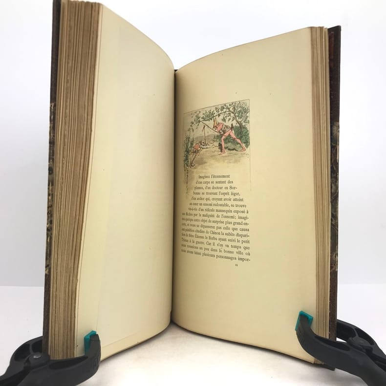 A. Lahure & E. Rouveyre & G. Blond 1883, In-8 relié demi-basane brun, titre et ornements dorés sur le dos, tête dorée, couverture illustrée en couleurs conservée, VI-196 pages. Impression chromotypographique, 45 compositions en couleurs dans le texte.- 820g.- Quelques minimes piqûres sur les pages de garde et faux-titre, sinon exemplaire bien frais, reliure solide et agréable.