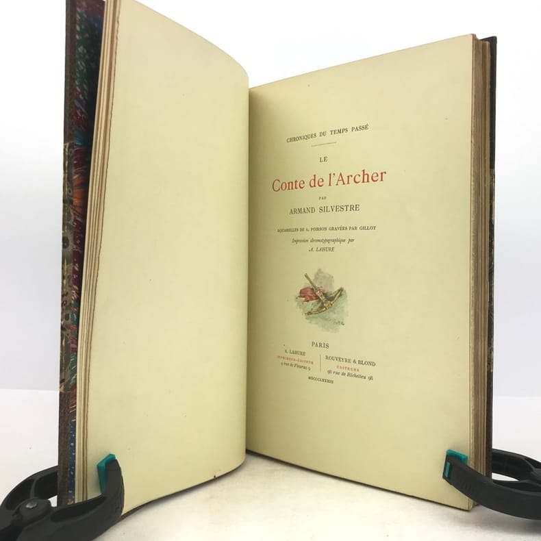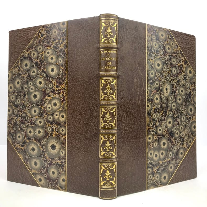 1 volume in-8 (23 cm x 15 cm), demi-maroquin brun à coins (reliure de l’époque), dos à nerfs orné de motifs dorés, tête dorée, couverture conservée. [6]-193-[4]-1 bl. pages (complet). Très bon état. ÉDITION ORIGINALE illustrée d’un frontispice ainsi que de nombreuses aquarelles in-texte en couleur de A. Poirson, gravées par Gillot. Paul-Armand Silvestre est un écrivain français, romancier, poète, conteur, librettiste et critique d'art (1837-1901). À partir de 1866, il publie des recueils de vers. Il figure également dans Le Parnasse contemporain (1869 et 1876). Comme critique d'art et de théâtre, Il collabore activement à des journaux tels que l'Opinion nationale, le Journal officiel, L'Estafette et la Grande Revue de Paris et de Saint-Petersbourg. Bel exemplaire.