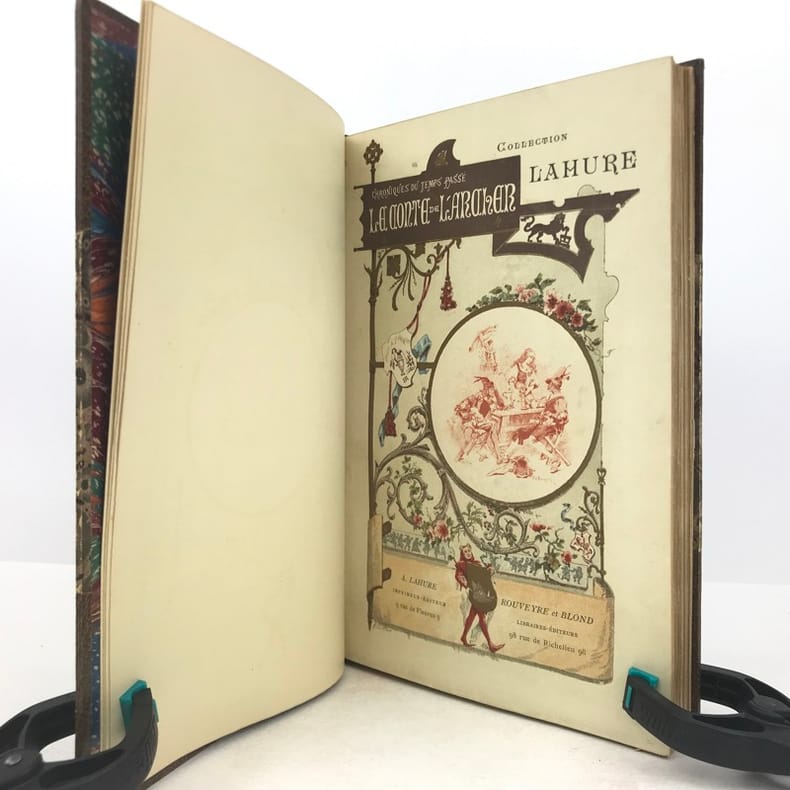 A. Lahure, Rouveyre et Blond, coll. « Collection Lahure » 1883 Aquarelles de Armand Poirson gravées par Gillot. In-8, broché sous couverture rempliée illustrée en couleurs, 193 pp., 46 compositions en couleurs dont 6 hors-texte. Dos cassé, manque en pied de dos, couverture poussiéreuse, intérieur assez frais. A relier.