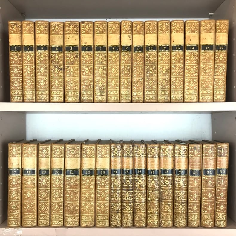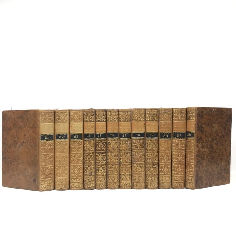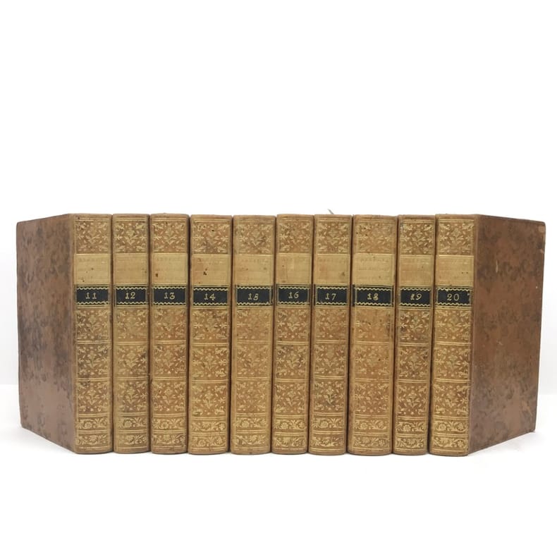 Paris, Hôtel de Thou, Laporte, 1780-1786, 23 vol. in 8, rel. d'ép. plein veau brun marbré, dos à nerfs ornés de fers dorés, pièces de titres et de tomaisons de maroquin vert, encadrements de triple-filets dorés sur les plats, quelques épidermures sur les plats, sinon bel ex. bien complets des tomes 22 et 23 qui sont parus 6 ans plus tard.