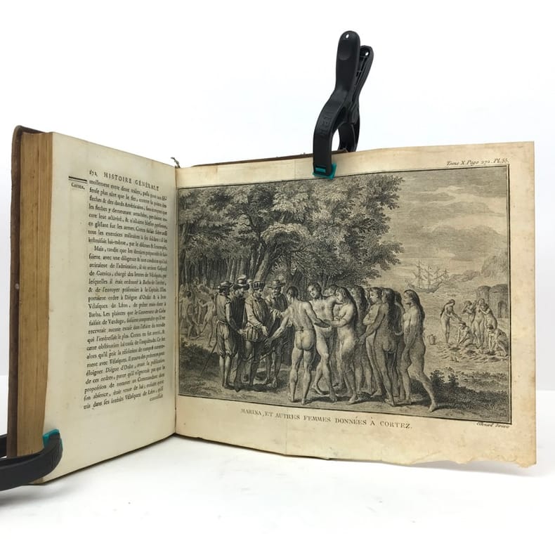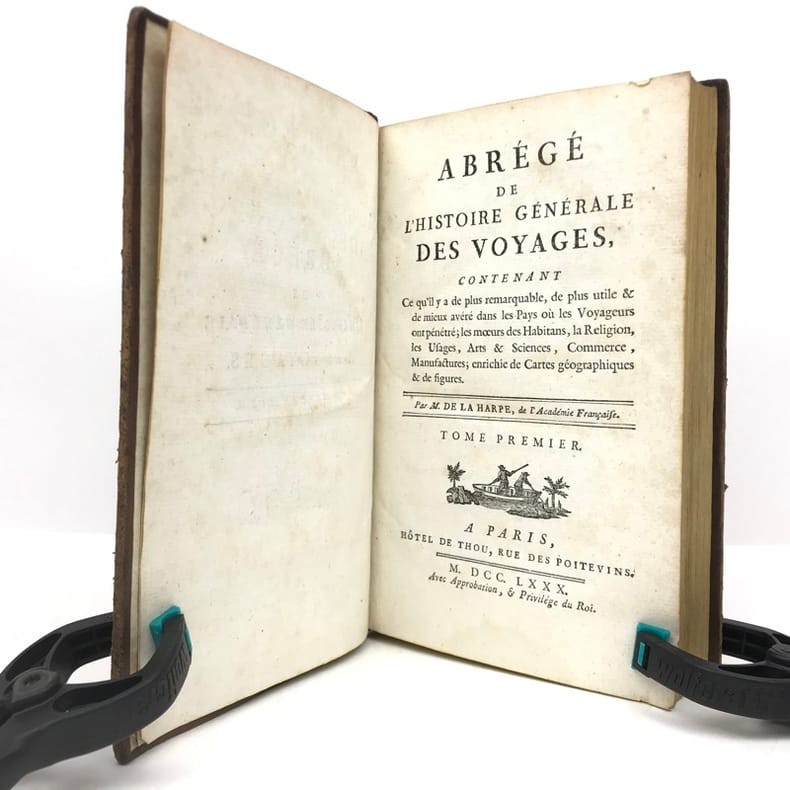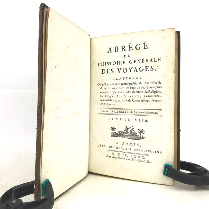 32 volumes in-8 (19,5 x 12,5 cm), basane marbrée pour les 23 premiers et les 3 derniers volumes, et veau marbré pour les 6 volumes (reliure légèrement dépareillée de l’époque), dos lisses ornés avec décor légèrement différent, pièces de titres de veau crème et pièces de tomaison de veau noir, tranches jaunes, ex-libris manuscrit sur les premiers feuillets blancs des 4 premiers volumes, xxiv-lii-lxxxiv-350-8pl. ; [4]-465-4pl. ; [4]-506-10pl. ; [4]-545-[5bl.]-7pl. ; [4]-674-[4]-6pl. ; [4]-527-[3]-2pl. ; [4]-525-[1bl.]-6pl. ; [4]-494-8pl. ; [4]-419-2pl. ; [4]-487-[1bl.]-2 pl. ; [4]-503-[1bl.]-3pl. ; [4]-481-[1bl.]-3pl. ; [4]-493-[1bl.]-1pl. ; [4]-572-2pl. ; [4]-637-[1bl.]-1pl. ; [4]-532 ; [4]-510-4pl. ; [4]-660-1pl. ; [4]-438-[2]-4pl. , [4]-490-[1]-4pl. ; [4]-671-[1bl.]-4pl. ; [4]-56-558-2 pl. ; [4]-616-4pl. ; [4]-viii-487-[1bl.]-2pl. ; [4]-471-[1bl.]-2pl. ; [4]-532 ; [4]-527-[1bl.]-2pl. ; [4]-527-[1bl.]-2pl. ; [4]-583-[1bl.]-2pl. ; [4]-xvi-495-[1bl.]-2pl. ; [4]-548-2pl. ; vi-420 pages (complet du texte). Manque un atlas in-4 et 4 feuillets dans la table générale. Reliures légèrement frottées sur les dos, les plats, les chants et les coins, dos légèrement éclaircis et certains tachés, épidermures sur certains plats, quelques pâles rousseurs éparses, certaines planches plus courtes en gouttière, petites taches d’encre et quelques mouillures marginales à quelques feuillets, rare manque de papier marginale ou angulaire sans manque de texte, restaurations avec atteinte au texte à un feuillet du tome 9 sans manque, petites déchirures dans la marge interne de quelques feuillets du tome 19 sans atteinte au texte, plusieurs feuillets roussis dans les 3 derniers tomes, manque 4 feuillets dans la table générale du dernier tome, (cahier G, pp.105 à 112). État très correct tout de même. Belle édition illustrée de 103 planches hors texte de vues, costumes, scènes de genre, etc., certaines dépliantes, composées de 82 planches dans la première partie et de 7 planches dans le Voyage de Cook, gravées par Benard, et de 11 planches et de 3 cartes dépliantes dans le Supplément, gravées par Blanchard. Cet Abrégé des voyages est un extrait de la volumineuse compilation donnée par l'abbé Prévost, publiée de 1747 à 1780. L'auteur, Jean-François de La Harpe (1739-1803), écrivain et critique français, d’origine suisse, y a réuni les faits essentiels des voyages les plus fameux depuis les premières découvertes jusqu'à celles de la fin du dix-huitième siècle. Il a divisé son abrégé en cinq parties : les voyages d'Afrique, ceux d'Asie, ceux d'Amérique, ceux vers les pôles et les voyages autour du monde, puis a ajouté les voyages modernes dont ceux du capitaine Cook (tomes 22 et 23), ces 2 derniers et les 9 volumes de Supplément, (tomes 24 à 32), sont de l'abbé Delpuech de Comeiras. Bon exemplaire.