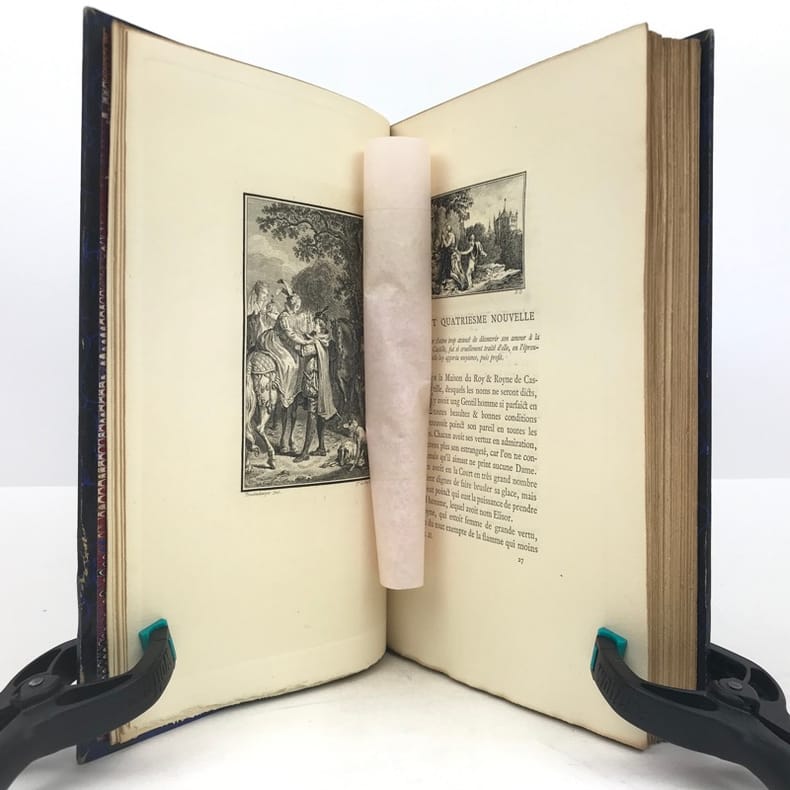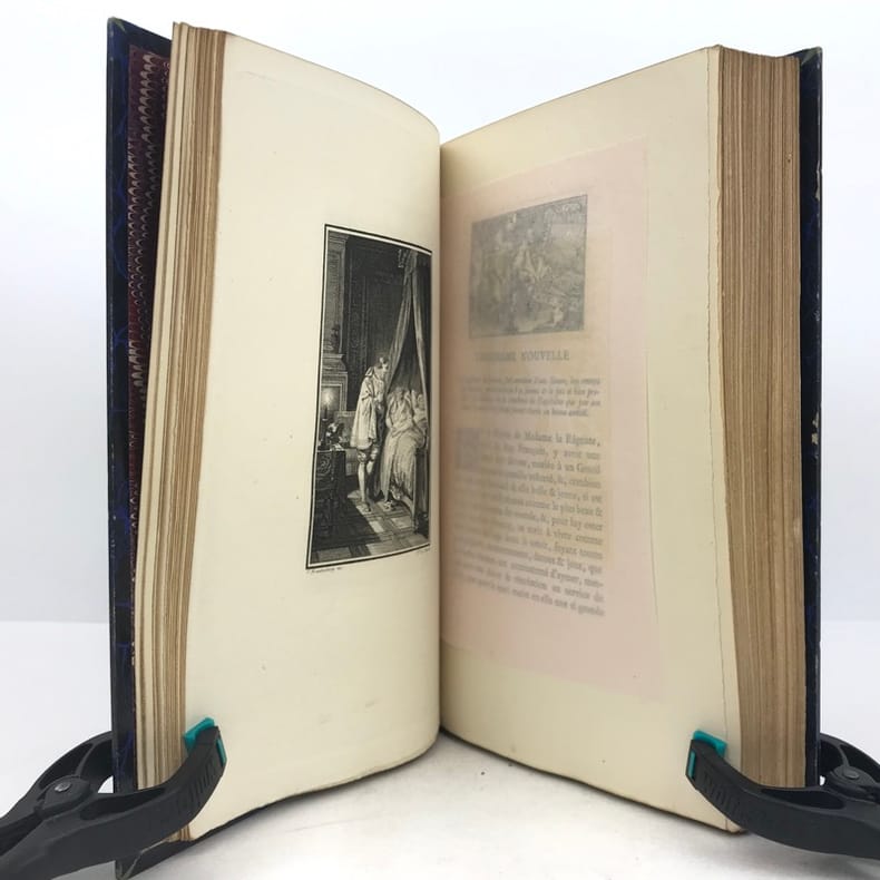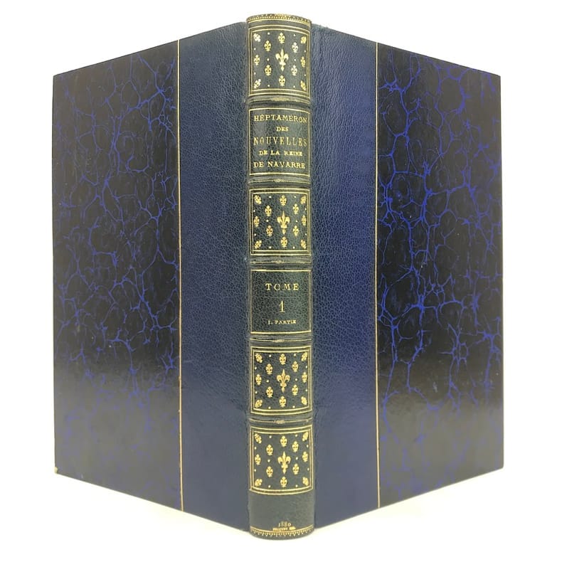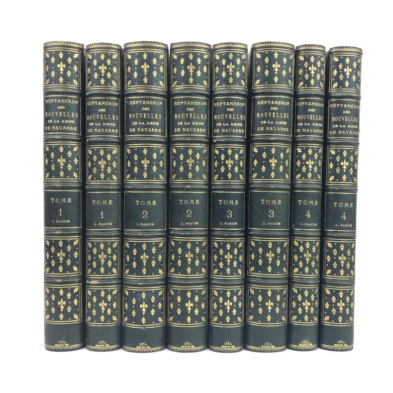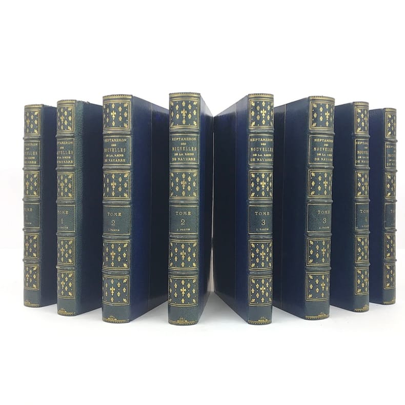 4 tomes en 8 volumes in-8 (22,5 x 14 cm), demi maroquin bleu (reliure de l’époque signée Becquet), couverture conservée, dos à nerfs orné et fleurdelysé, filet doré en bordure, tranche de tête dorée, [4]-232 ; [4]-233 à 396-[2] ; [4]-208 ; [4]-209 à 384-[2] ; [4]-144 ; [4]-145 à 328-[2] ; [4]-176 ; [4]-177 à 366-[2] pages (complet). Rares rousseurs. Bon état. Nouvelle édition illustrée d’un portrait en frontispice, d’un titre gravé, de trois autres frontispices, de 73 gravures hors-texte réalisées par Joseph de Longueil et Sigmund Freudenberger, et enfin d’une lettre fac-similée. Tirage limité à 395 exemplaires, celui-ci 1/50 sur papier Whatman avec deux suites (état noir sur papier teinté et état bistre sur Whatman), (n° 274). Exemplaire ENRICHI d'un second portrait en frontispice avec 3 suites (état noir, état en sanguine et état bleu sur papier fin). Belle édition illustrée de la principale œuvre de Marguerite de Navarre (1492-1549), sœur du roi de France François Ier. Cet Heptaméron se présente sous la forme d’un recueil inachevé de 72 nouvelles, dont le récit se déroule sur sept journées, la huitième étant incomplète. Bel exemplaire.