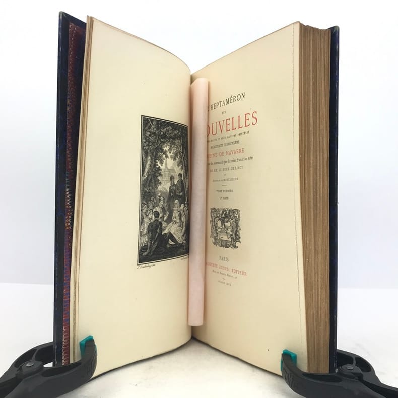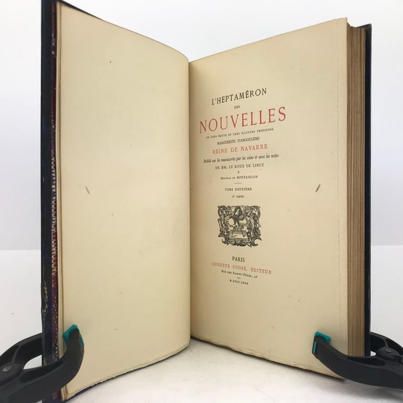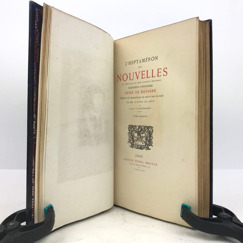 Bonne édition de l’Heptaméron. Cette édition imprimée par Jouaust pour l’éditeur Auguste Eudes reprend celle donnée par la Société des Bibliophiles françois en 1853-1854. Le texte est accompagné d’une importante préface, de notes et d’un glossaire par les historiens Anatole de Montaiglon et Antoine Le Roux de Lincy. Le dernier volume comprend les farces et des poésies inédites. Exemplaire du tirage ordinaire sur beau papier vergé, fabriqué spécialement pour cette édition avec un filigrane aux armes et à la devise de Marguerite d’Augoulême L’illustration se compose d’un portrait de Marguerite d’Angoulême, dessiné et gravé par T. de Mare, d’un frontispice gravé par Eichler d’après Dunter, de 76 figures hors texte gravées par de Longueil, Eichler, Le Roy, Halbou, Thiébault, etc. d’après Freudenberg, une planche en chromolithographie (armoiries de Marguerite de Navarre) et un fac-simile sur double page. Les nombreux bandeaux et culs-de-lampe ont été gravés par Champollion. C’est vers la fin de sa vie, retirée de la cour, que Marguerite de Navarre (Angoulême, 1492- Odos-en-Bigorre, 1549) composa l’Heptaméron, recueil de 72 nouvelles. Brantôme raconte que la reine Catherine et la duchesse de Savoie, qui en avaient aussi composées, les brûlèrent par dépit en voyant celles de Marguerite. Les aventures galantes, les séductions de filles novices, les stratagèmes employés pour tromper les tuteurs et les jaloux, voilà les pivots sur lesquels roulent généralement toutes les nouvelles. Bel exemplaire établi par Saillier, relieur à Boulogne-sur-Seine au début du XXe siècle. Vicaire, V, 511-513. Fléty, 158.