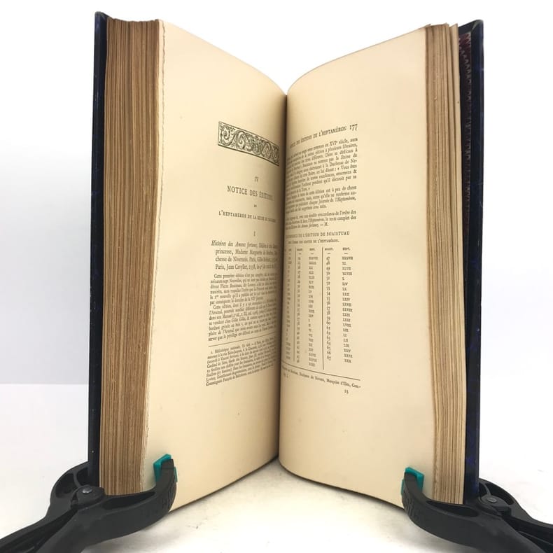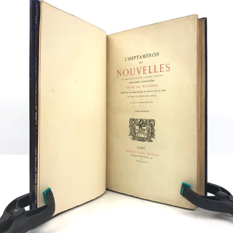 1880 Paris, Eudes, 1880, 4 tomes reliés en 8 volumes in 8°, demi-'chagrin cerise à coins, dos à nerfs, têtes dorées, couvertures et dos conservés Bel exemplaire de ce "tirage d'amateur" à 395 exemplaires seulement, celui-ci un des 100 sur papier Van Gelder Zonnen, fabriqué exprès pour cette édition avec filigrane aux armes, emblèmes et devise de Marguerite de Navarre, avec 2 suites de gravures hors-texte dont une en noir sur papier teinté et la seconde en bistre sur papier Van Gelder. (Vicaire, V, 511).
