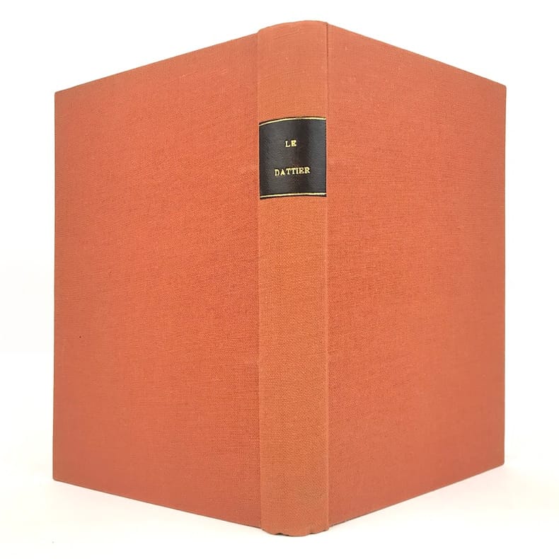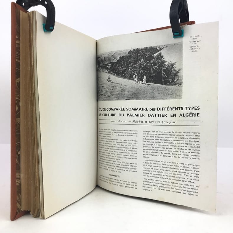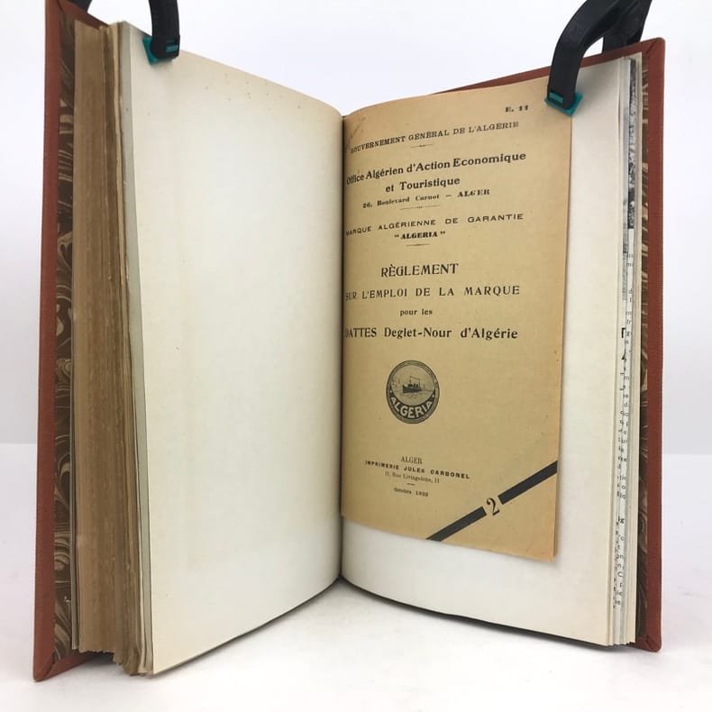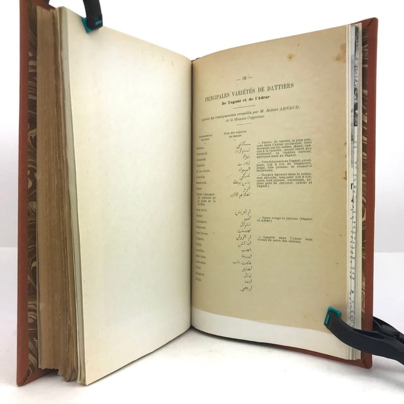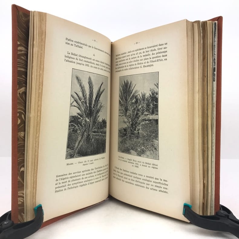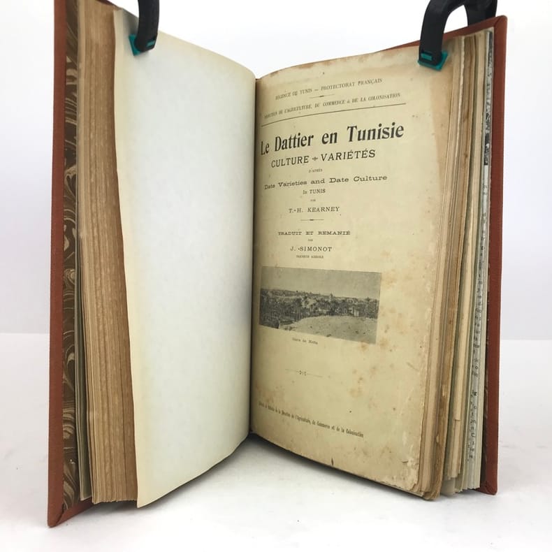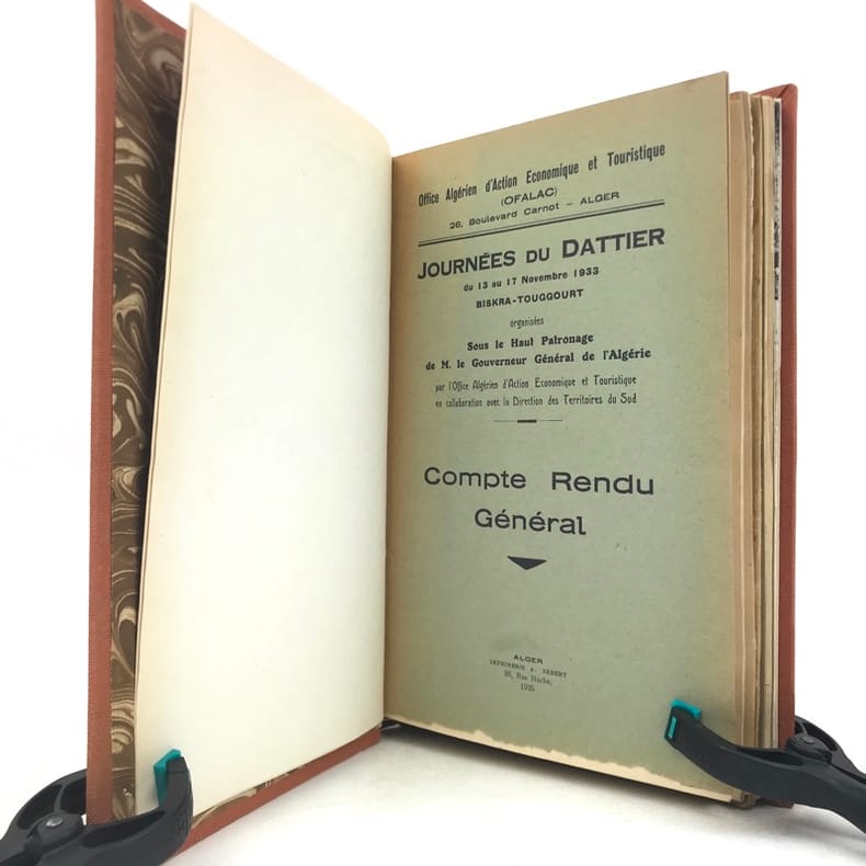 8 ouvrages en 1 volume in-8 (24 x 16 cm), toile brique (reliure moderne), pièce de titre noire, couvertures conservées, cachets à plusieurs feuillets, envoi autographe sur la dernière couverture. 276 - 79 - pages / pp. 251 à 290 / 18 pages / pp. 117 à 121-1bl. / [6]-8 / 9-1bl. pages / pp. 374 à 382-1b. (textes paraissent bien complets). Quelques rousseurs à certains feuillets un peu abîmés sans gêne de lecture au 3e volume. État très correct. Important manuel consacré aux dattiers orné de nombreuses reproductions photographiques et tableaux in-texte. Compte rendu général de conférences qui ont eu lieu lors de la “Journée du dattier”, organisée sous le haut patronage de M. le gouverneur général de l’Algérie par l’office algérien d’action économique et touristique en collaboration avec la direction des territoires du sud. Second ouvrage par Kearney, texte traduit et remanié par l’ingénieur agronome, J. Simonot. Texte extrait du bulletin de la direction de l’agriculture, du commerce et de la colonisation; illustré de 10 planches hors texte de reproductions photographiques. Le troisième document est un extrait du supplément au bulletin de l’office du gouvernement général de l’Algérie en 1912. Texte en italien pour le quatrième ouvrage, extrait d’un bulletin d’information économique italien orné de 8 planches dépliantes. Texte en anglais pour le cinquième texte, par Paul Popenoe, réimpression d’un article extrait d’une revue géographique de 1926. Avec une note autographe manuscrite sur la couverture : With The compliments of the author. Règlement établi par le gouvernement général de l’Algérie avec l’office algérien d’action économique et touristique. Rapport présenté par M. Lancronier lors de la Semaine du dattier, au sujet du Palmier-dattier à Laghouat et au M’Zab. On a relié in fine un article en 5 feuillets recto-verso extraits d’une revue “Fruits d’Outre-mer” de 1947, d’un plus grand format, les marges ont été repliées. Bel ensemble.