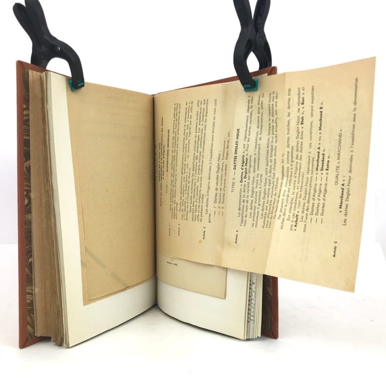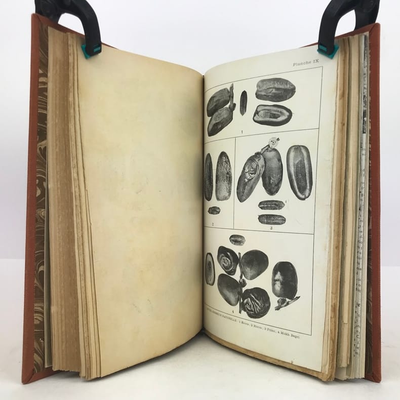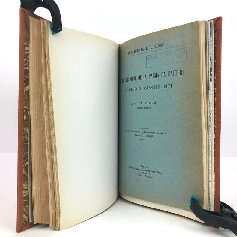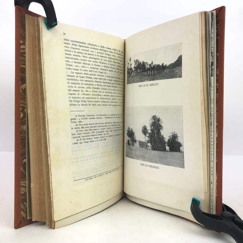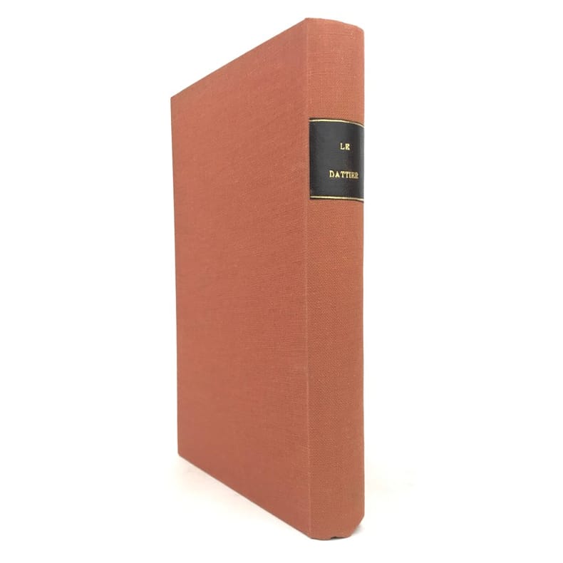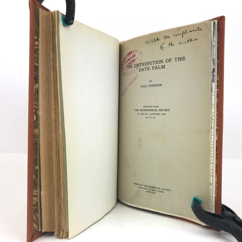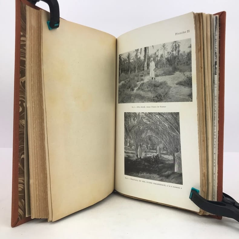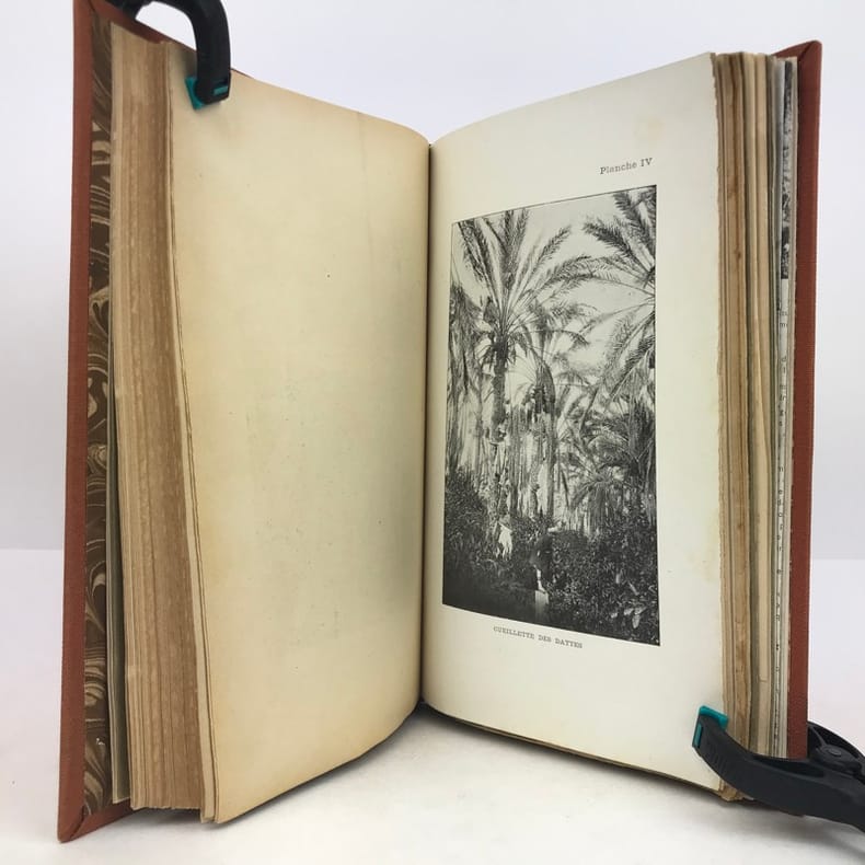 8 ouvrages en 1 volume in-8 (24 x 16 cm), toile brique (reliure moderne), pièce de titre noire, couvertures conservées, cachets à plusieurs feuillets, envoi autographe sur la dernière couverture. 276 - 79 - pages / pp. 251 à 290 / 18 pages / pp. 117 à 121-1bl. / [6]-8 / 9-1bl. pages / pp. 374 à 382-1b. (textes paraissent bien complets). Quelques rousseurs à certains feuillets un peu abîmés sans gêne de lecture au 3e volume. État très correct. Important manuel consacré aux dattiers orné de nombreuses reproductions photographiques et tableaux in-texte. Compte rendu général de conférences qui ont eu lieu lors de la “Journée du dattier”, organisée sous le haut patronage de M. le gouverneur général de l’Algérie par l’office algérien d’action économique et touristique en collaboration avec la direction des territoires du sud. Second ouvrage par Kearney, texte traduit et remanié par l’ingénieur agronome, J. Simonot. Texte extrait du bulletin de la direction de l’agriculture, du commerce et de la colonisation; illustré de 10 planches hors texte de reproductions photographiques. Le troisième document est un extrait du supplément au bulletin de l’office du gouvernement général de l’Algérie en 1912. Texte en italien pour le quatrième ouvrage, extrait d’un bulletin d’information économique italien orné de 8 planches dépliantes. Texte en anglais pour le cinquième texte, par Paul Popenoe, réimpression d’un article extrait d’une revue géographique de 1926. Avec une note autographe manuscrite sur la couverture : With The compliments of the author. Règlement établi par le gouvernement général de l’Algérie avec l’office algérien d’action économique et touristique. Rapport présenté par M. Lancronier lors de la Semaine du dattier, au sujet du Palmier-dattier à Laghouat et au M’Zab. On a relié in fine un article en 5 feuillets recto-verso extraits d’une revue “Fruits d’Outre-mer” de 1947, d’un plus grand format, les marges ont été repliées. Bel ensemble.