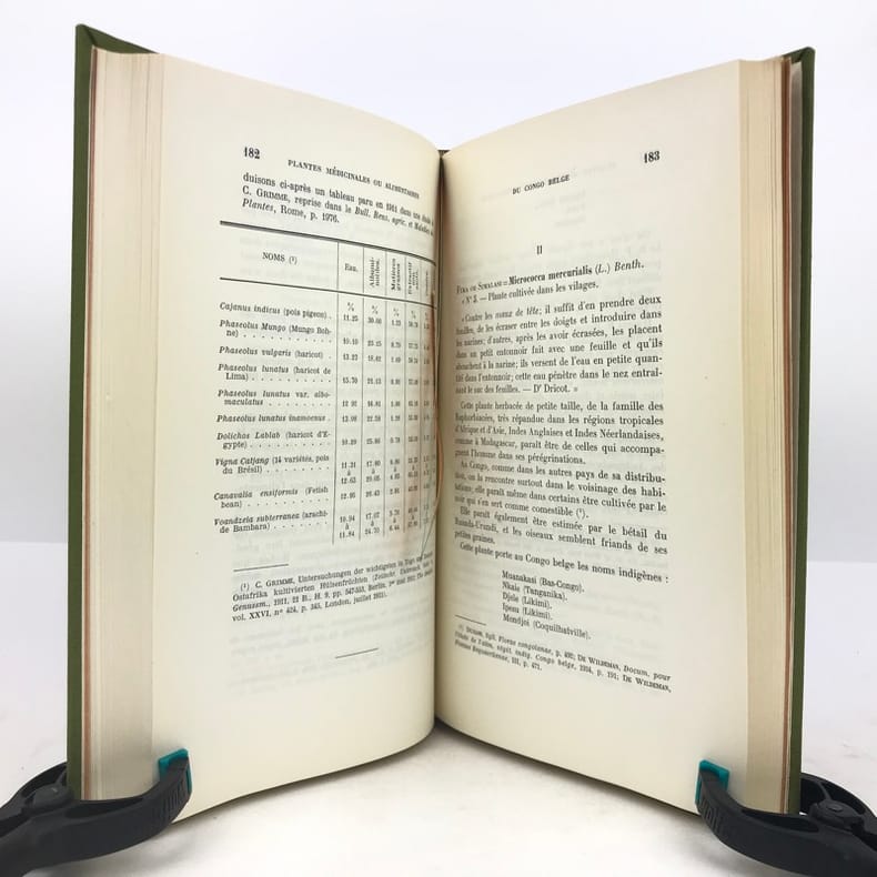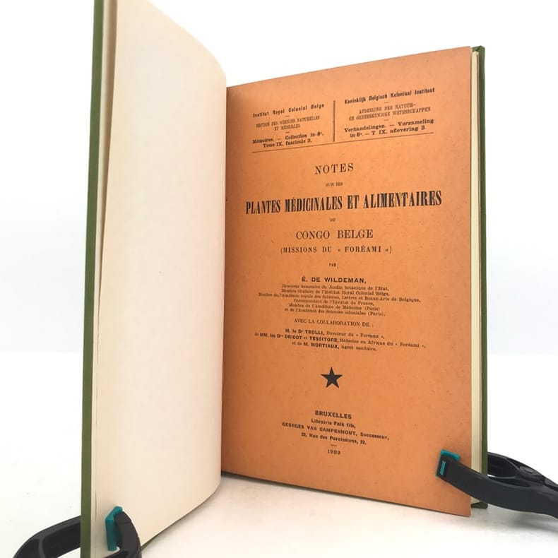 1 volume in-8 (24 x 16 cm), bradel toile verte (reliure moderne), pièce de titre noire, couverture et dos conservés. vi-356-[4] pages (complet). Bon état. Mémoire présenté à la séance du 18 mars 1939 à l’Institut Royal Colonial Belge, section des sciences naturelles et médicales. Émile De Wildeman (1866-1947), botaniste belge, spécialiste de la flore congolaise et plus spécifiquement des plantes vasculaires et des algues. Il a décrit entre 2 000 à 3 000 espèces végétales d'Afrique. Il fut directeur du Jardin botanique de l'État à Bruxelles de 1912 à 1931. Bon exemplaire.