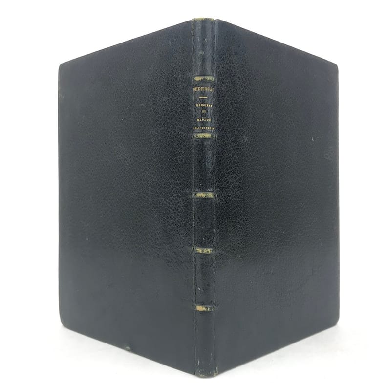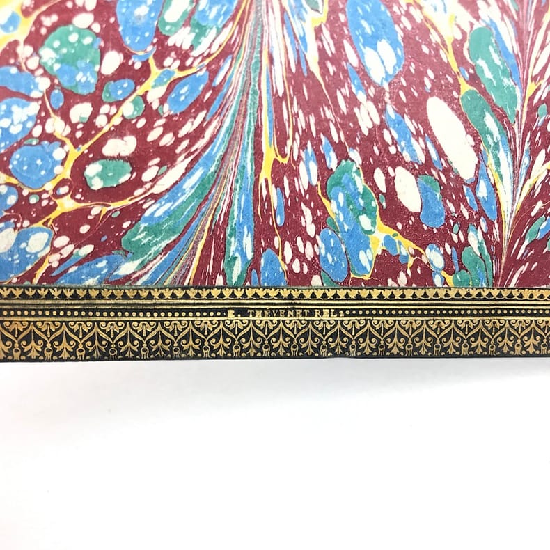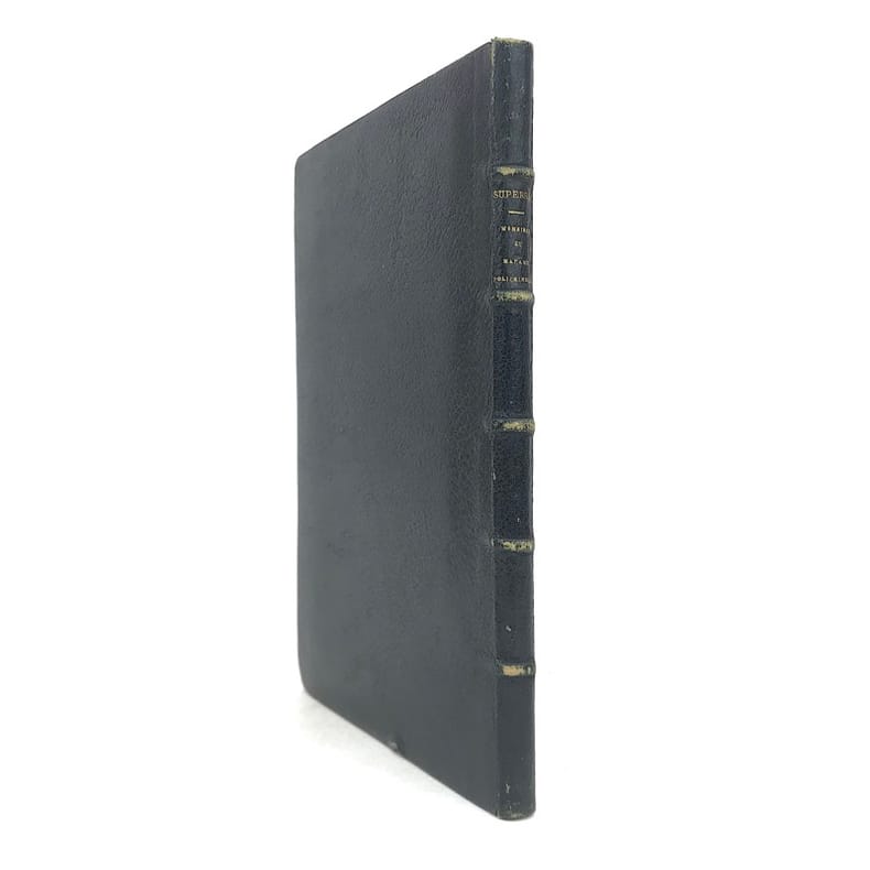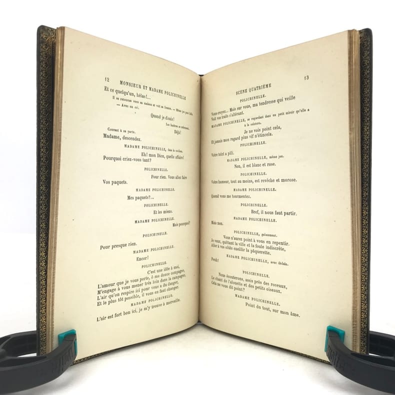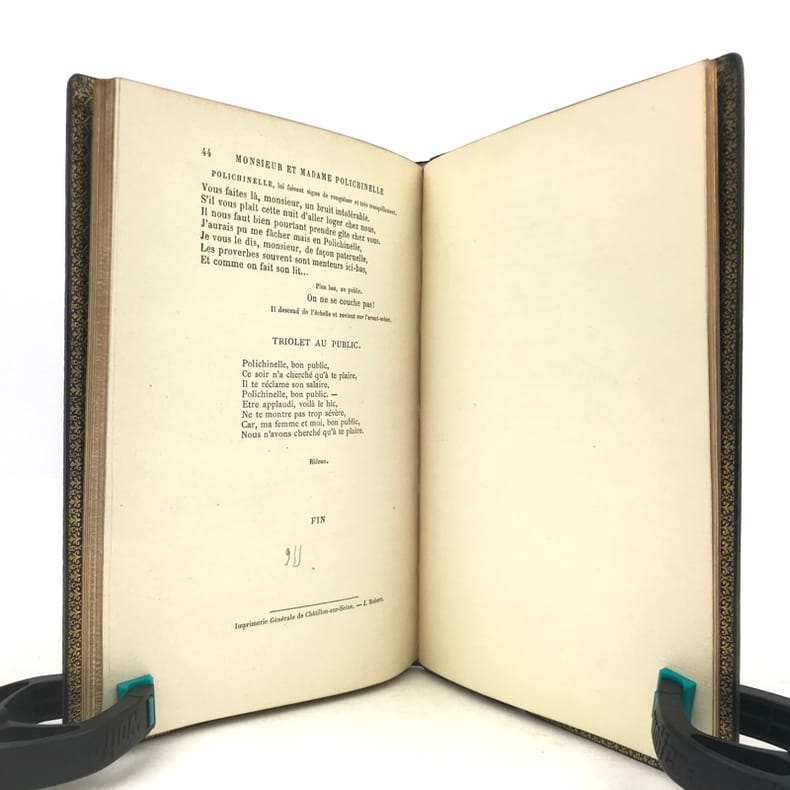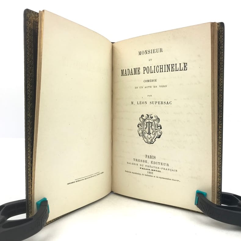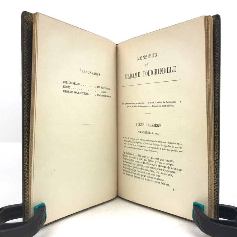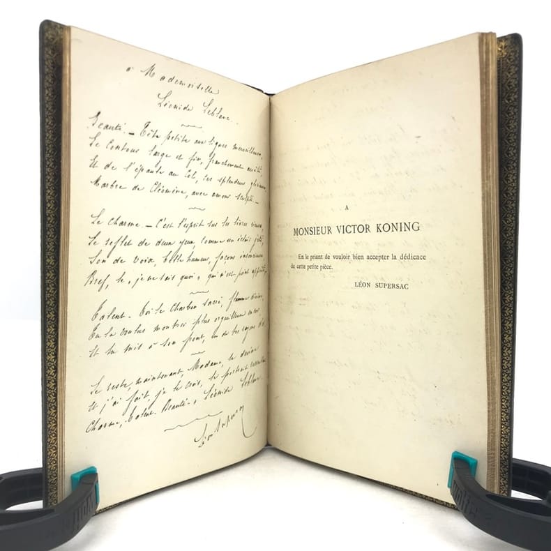 1 volume in-12 (18 cm x 12 cm), maroquin noir (reliure signée E. Thevenet), dos à nerfs, dentelle intérieure dorée, envoi autographe de l'auteur au verso du titre. [6]-44 pages (complet). Nerfs frottés. Bon état. ÉDITION ORIGINALE. Comédie en un acte en vers, représentée pour la première fois à Paris, sur le Théâtre du Gymnase, le 23 janvier 1881. Exemplaire portant un long et bel envoi adressé à Mademoiselle Léonide Leblanc. Agréable exemplaire.