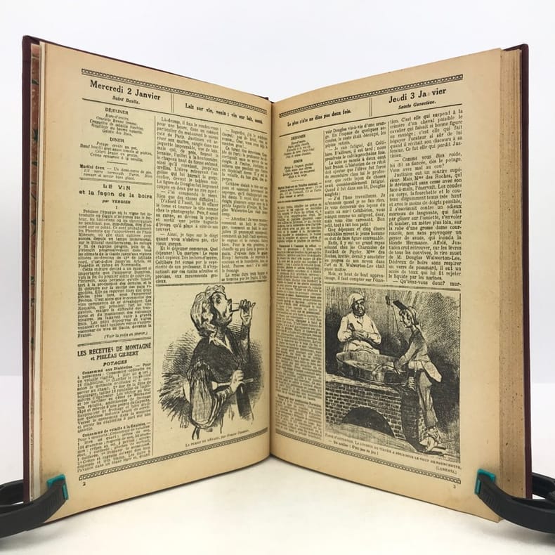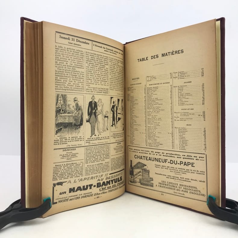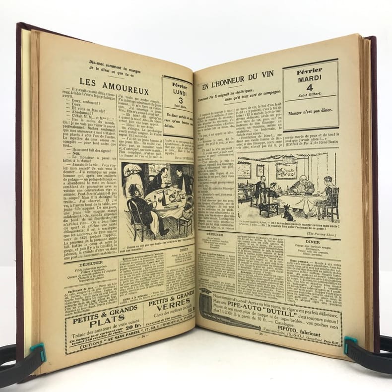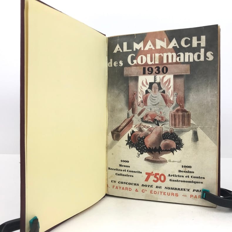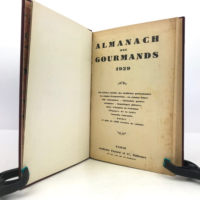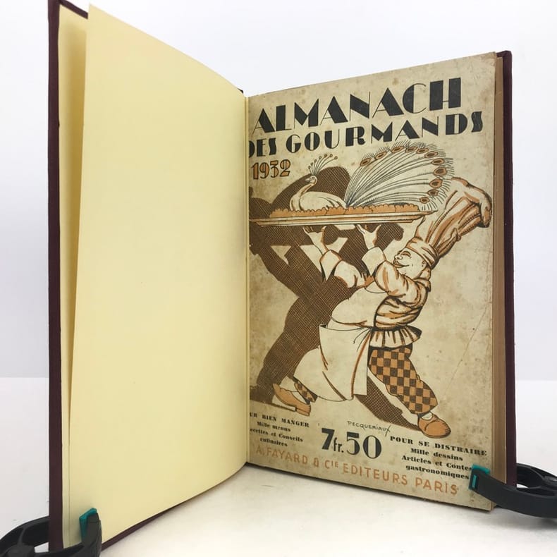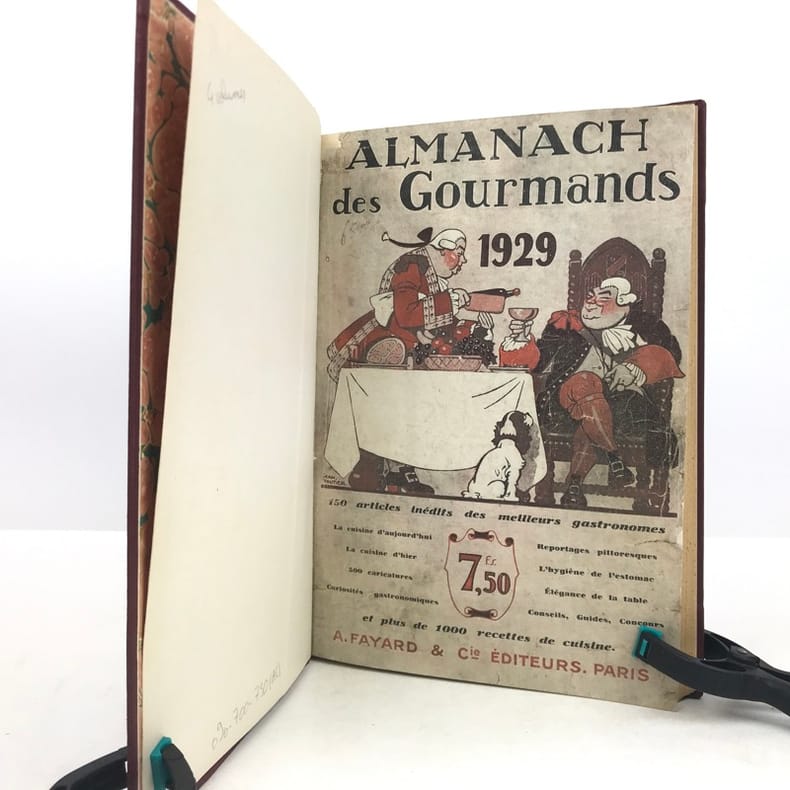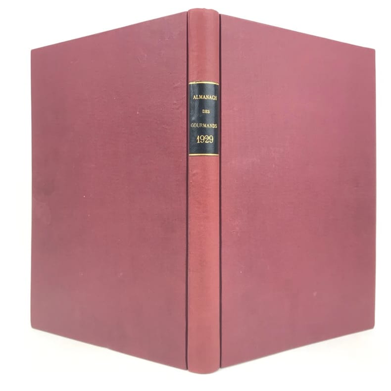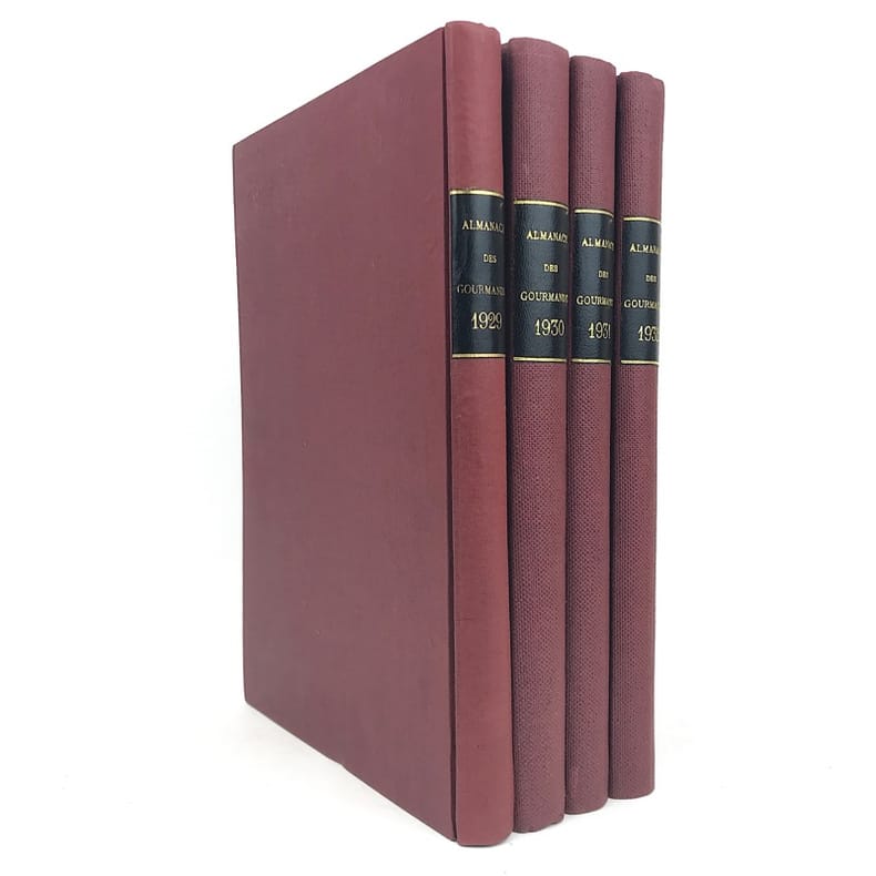4 volumes in-4 (27 x 18 cm), bradel toile lie-de-vin (reliure moderne), pièces de titre noires, premières de couvertures illustrées conservées. x-373-[1] ; [2]-viii-374 ; 383-[1] ; 378 pages (paraît bien complet). 2 couvertures restaurées et doublées, ainsi que quelques feuillets restaurés dans les marges avec petits manques marginaux et angulaires, un cahier en double dans l’album n°3, plusieurs feuillets brunis. État très correct. Collection complète de ces almanachs consacrés à la cuisine, aux boissons et à l’humour, composés de nombreux articles par Ali-Bab, Des Ombiaux, Derys, Curnonsky, Pomiane, Montagné, Elder, etc., et de très nombreuses recettes de cuisine. Nombreuses caricatures in-texte par Dubout, Chas Laborde, Falké, Benjamin Rabier, Hellé, Faivre, etc. Bel exemplaire.