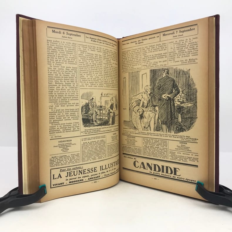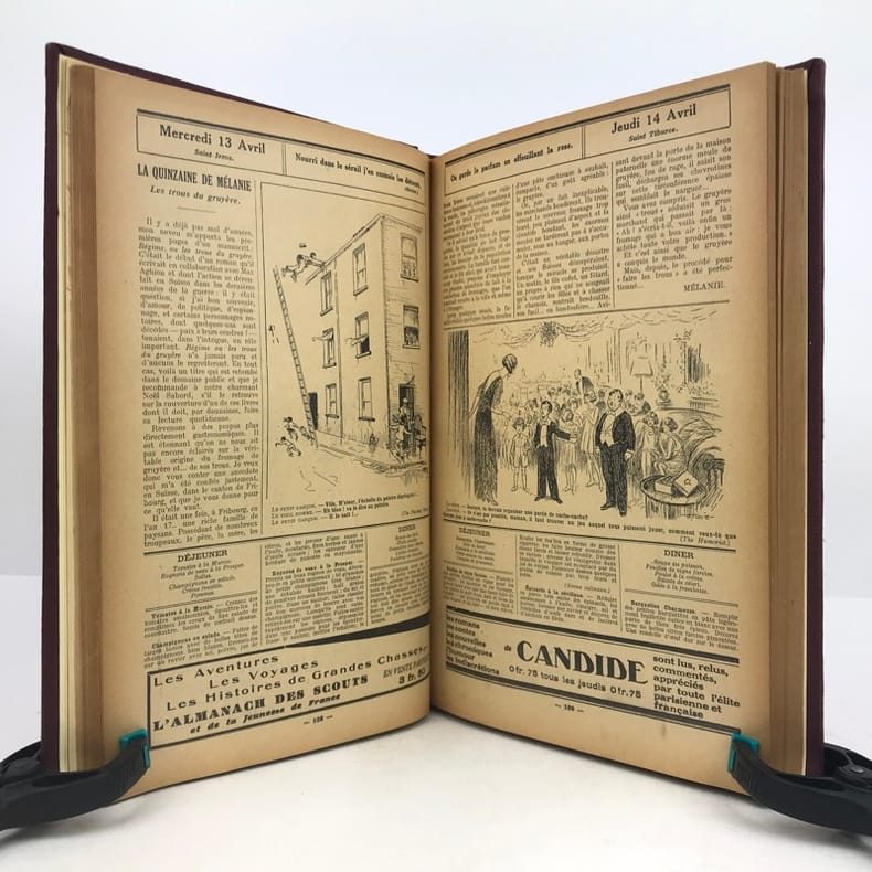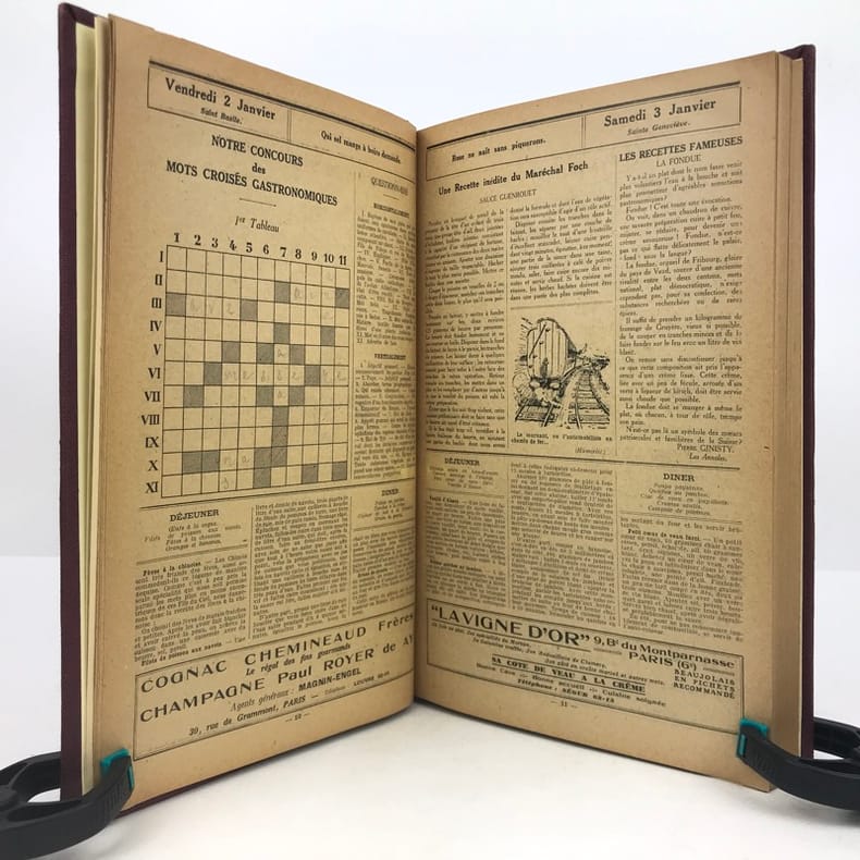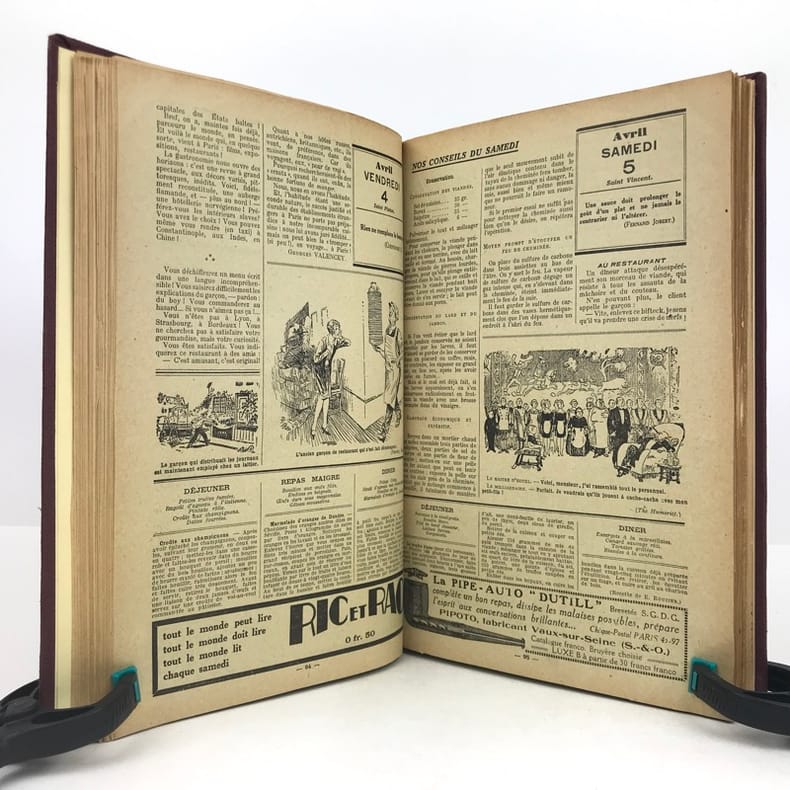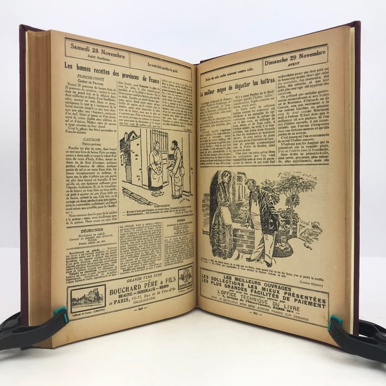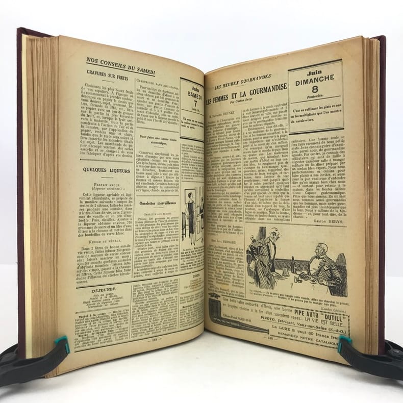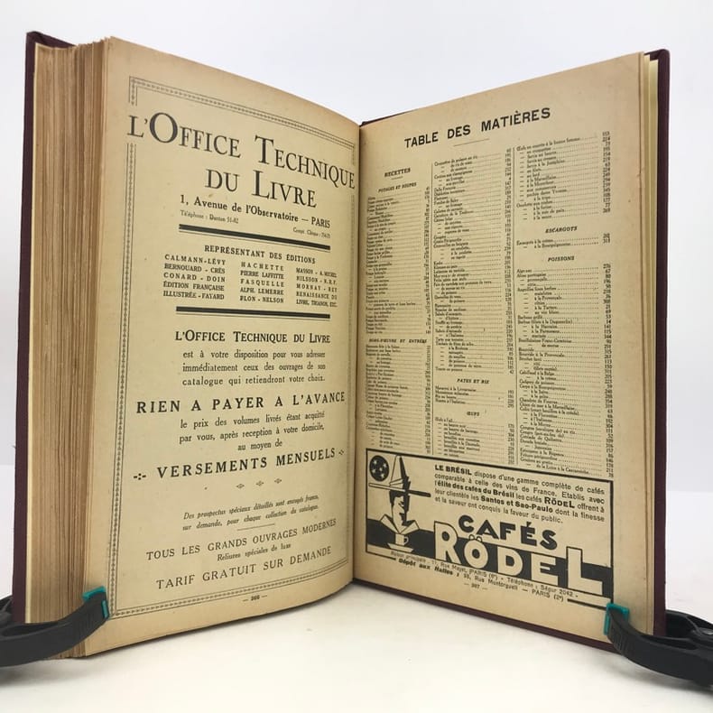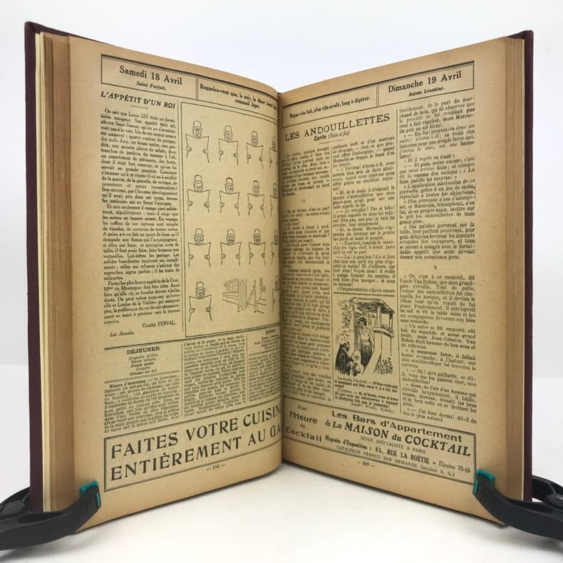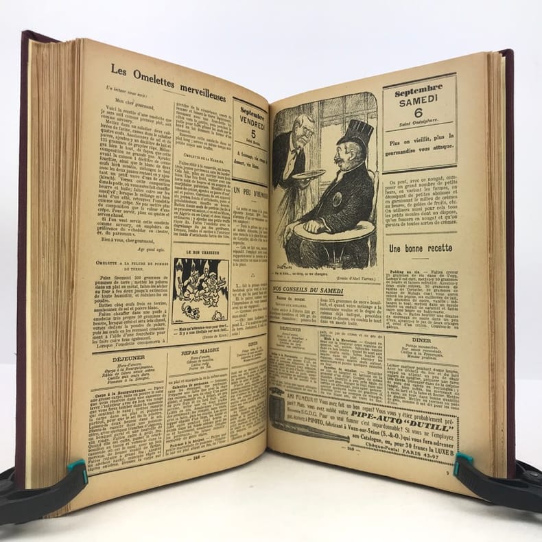 4 volumes in-4 (27 x 18 cm), bradel toile lie-de-vin (reliure moderne), pièces de titre noires, premières de couvertures illustrées conservées. x-373-[1] ; [2]-viii-374 ; 383-[1] ; 378 pages (paraît bien complet). 2 couvertures restaurées et doublées, ainsi que quelques feuillets restaurés dans les marges avec petits manques marginaux et angulaires, un cahier en double dans l’album n°3, plusieurs feuillets brunis. État très correct. Collection complète de ces almanachs consacrés à la cuisine, aux boissons et à l’humour, composés de nombreux articles par Ali-Bab, Des Ombiaux, Derys, Curnonsky, Pomiane, Montagné, Elder, etc., et de très nombreuses recettes de cuisine. Nombreuses caricatures in-texte par Dubout, Chas Laborde, Falké, Benjamin Rabier, Hellé, Faivre, etc. Bel exemplaire.