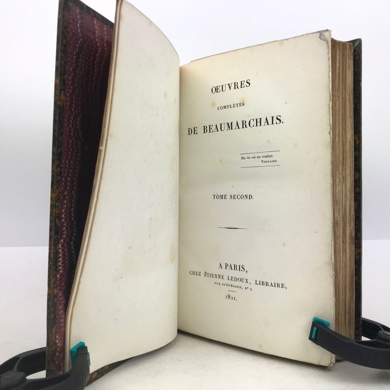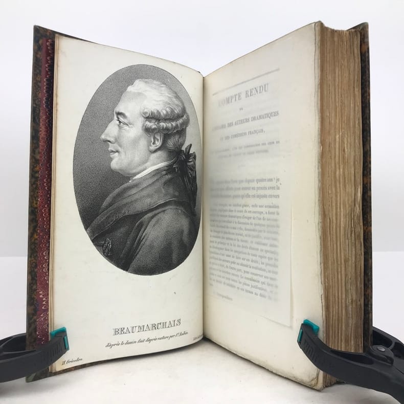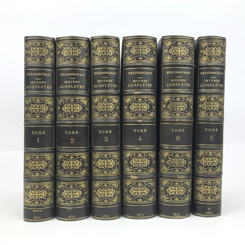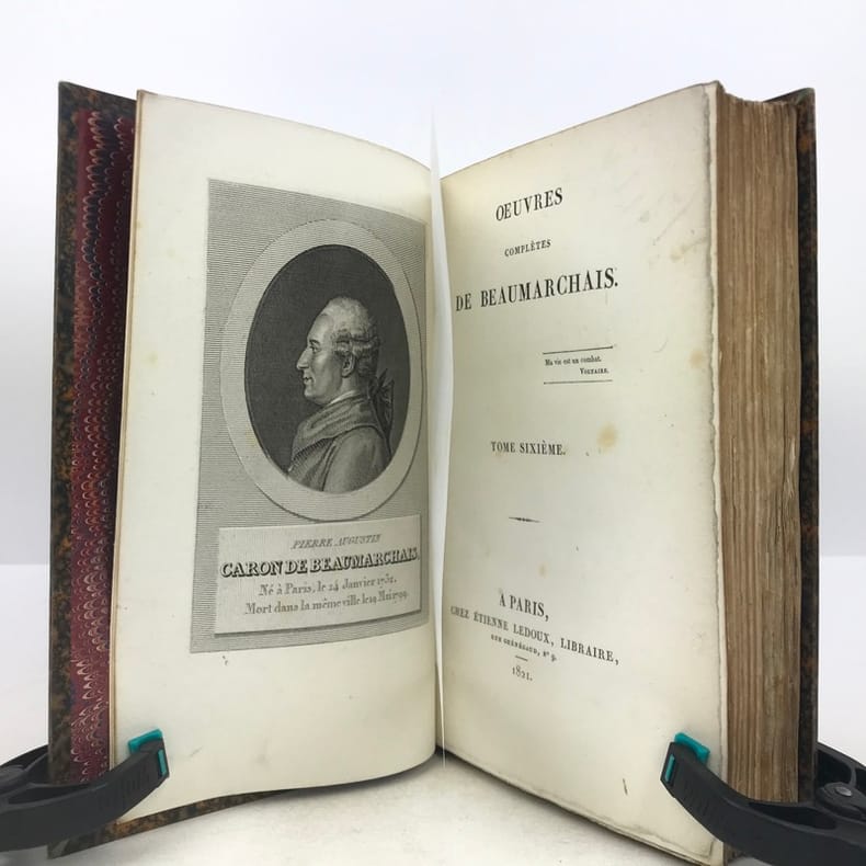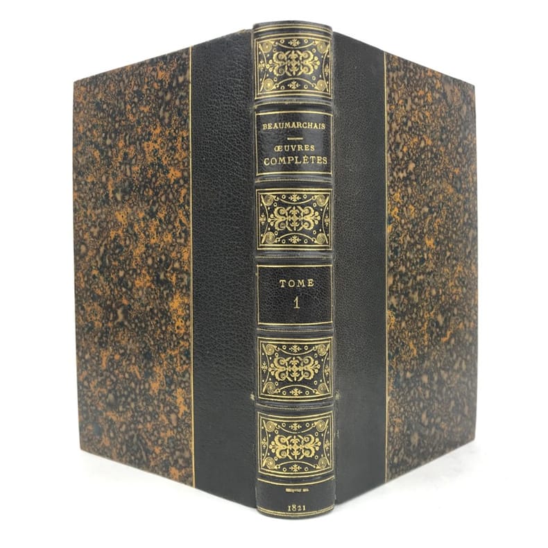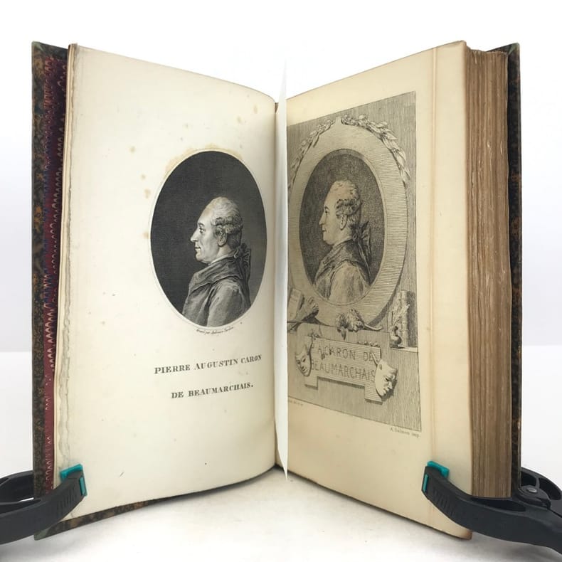 6 volumes in-8 (20,5 x 13,5 cm), demi maroquin noir (reliure de l’époque signée Becquet), dos à nerfs orné, tranche de tête dorée, tranches non ébarbées, xii-451-[1] ; [4]-521-[1] ; [4]-496-[2] ; [4]-610 ; [4]-462-[2] ; [4]-555-[1] pages (complet). Quelques rousseurs. État très correct tout de même. Nouvelle édition, illustrée de 12 portraits de l’auteur, placés en frontispice et de 14 gravures hors-texte. Pierre-Augustin Caron de Beaumarchais (1732-1799), plus souvent désigné comme Beaumarchais, est un écrivain, dramaturge, musicien et homme d'affaires français. Ces œuvres, principalement du théâtre, sont connues à travers le célèbre Mariage de Figaro, ou encore Le Barbier de Séville. Bel exemplaire.