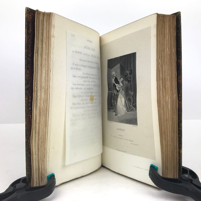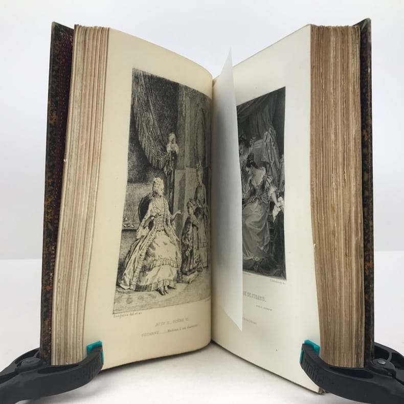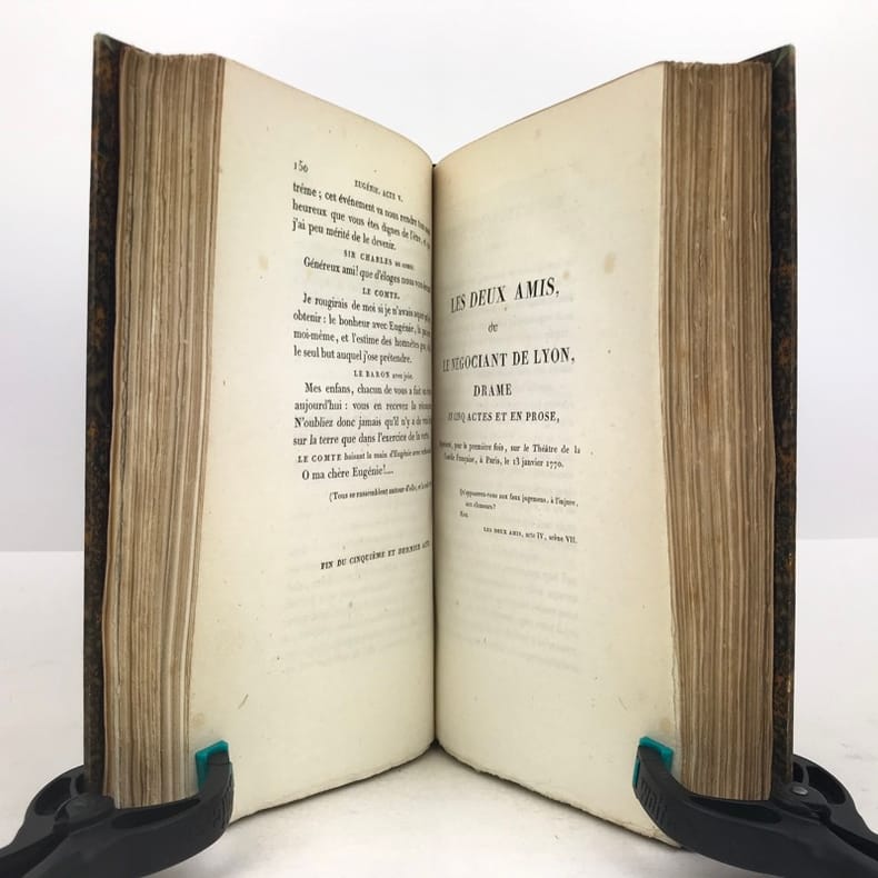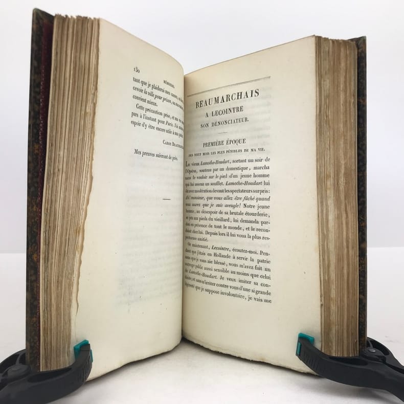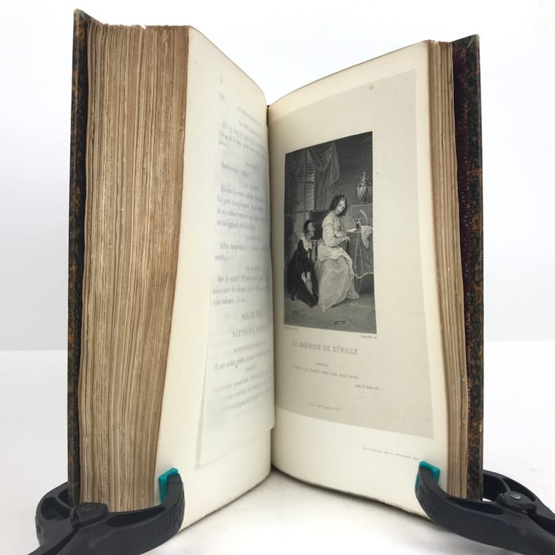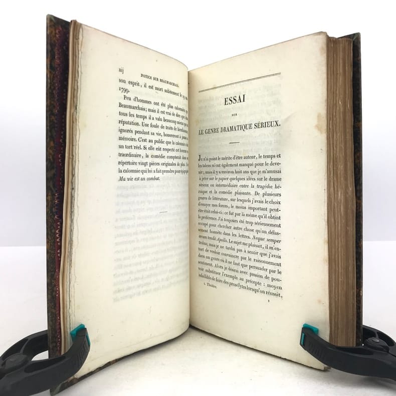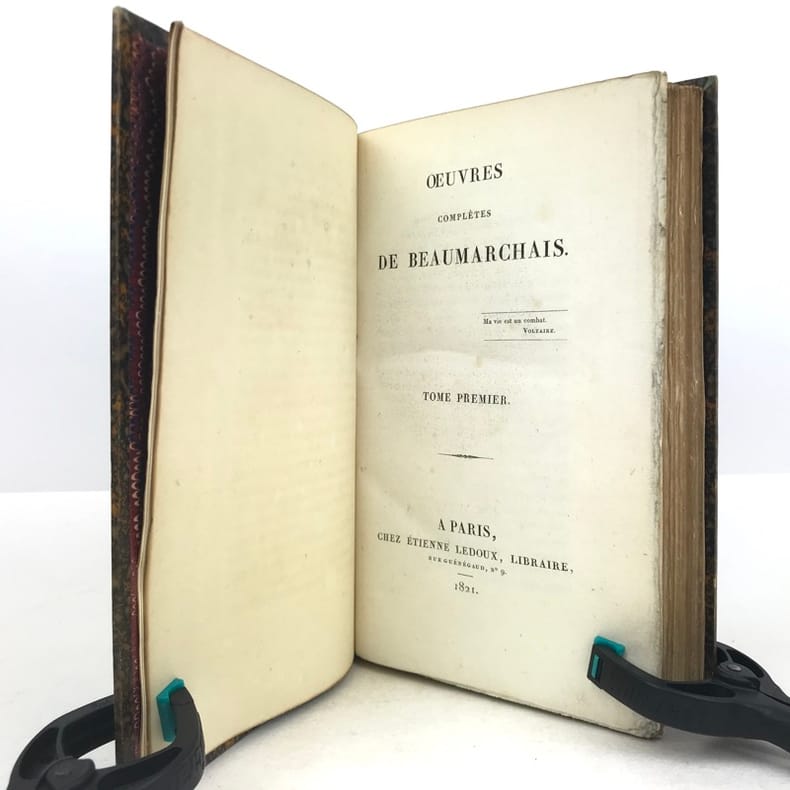 6 volumes in-8 (20,5 x 13,5 cm), demi maroquin noir (reliure de l’époque signée Becquet), dos à nerfs orné, tranche de tête dorée, tranches non ébarbées, xii-451-[1] ; [4]-521-[1] ; [4]-496-[2] ; [4]-610 ; [4]-462-[2] ; [4]-555-[1] pages (complet). Quelques rousseurs. État très correct tout de même. Nouvelle édition, illustrée de 12 portraits de l’auteur, placés en frontispice et de 14 gravures hors-texte. Pierre-Augustin Caron de Beaumarchais (1732-1799), plus souvent désigné comme Beaumarchais, est un écrivain, dramaturge, musicien et homme d'affaires français. Ces œuvres, principalement du théâtre, sont connues à travers le célèbre Mariage de Figaro, ou encore Le Barbier de Séville. Bel exemplaire.