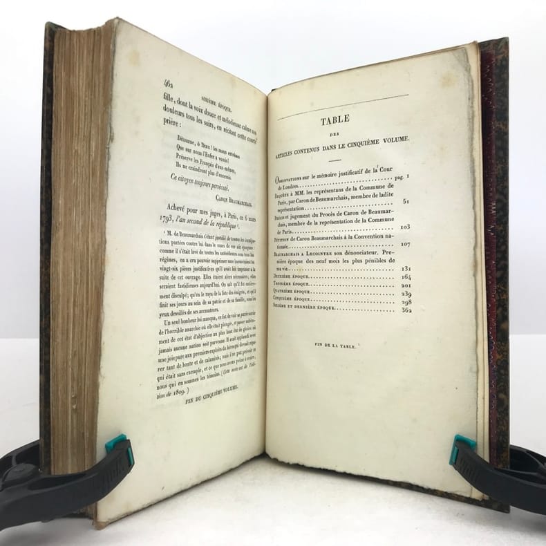 "Ouvrage présentant une notice sur sa vie et ses ouvrage, toute son œuvre théâtrale, mais aussi les mémoires de l'affaire judiciaire qui l'opposa au juge Goezman, ceux de l'affaire qui 'opposa au comte de .La Blache, l'affaire qui l'opposa à Kornmann, son affaire sur la vente d'armes aux américains, sa requête aux représentants de la commune de Paris pour l'incendie de deux maisons, et des problème qu'il eut lors de la révolution française, ainsi que une correspondance de 53 lettres et diverses chansons, poésies etc..."