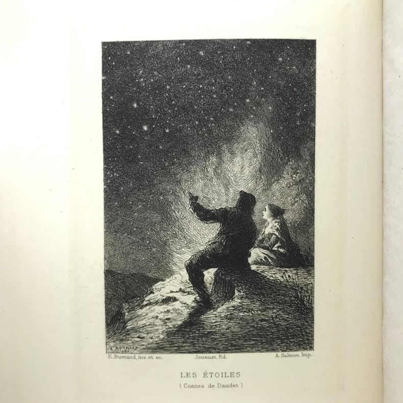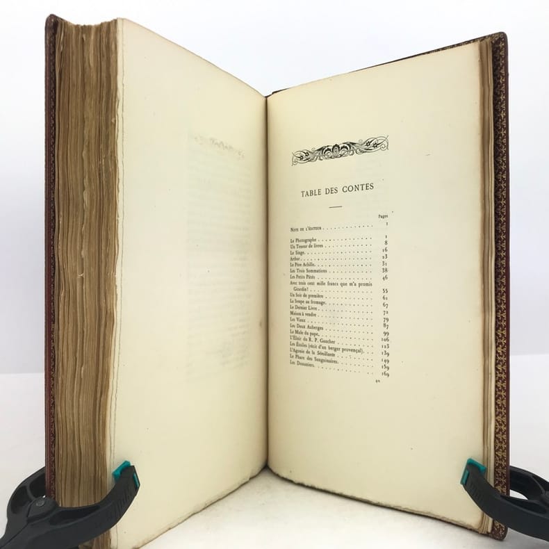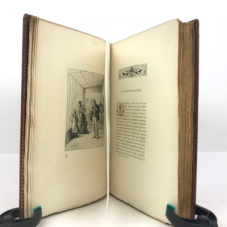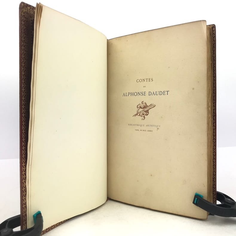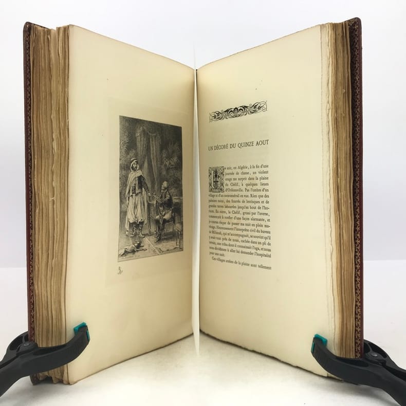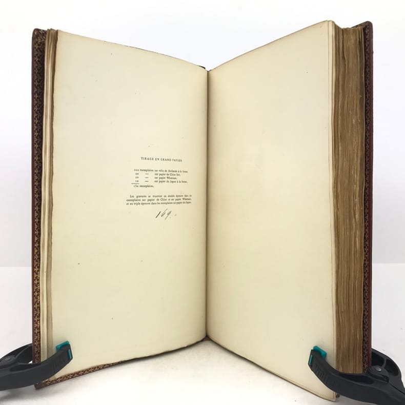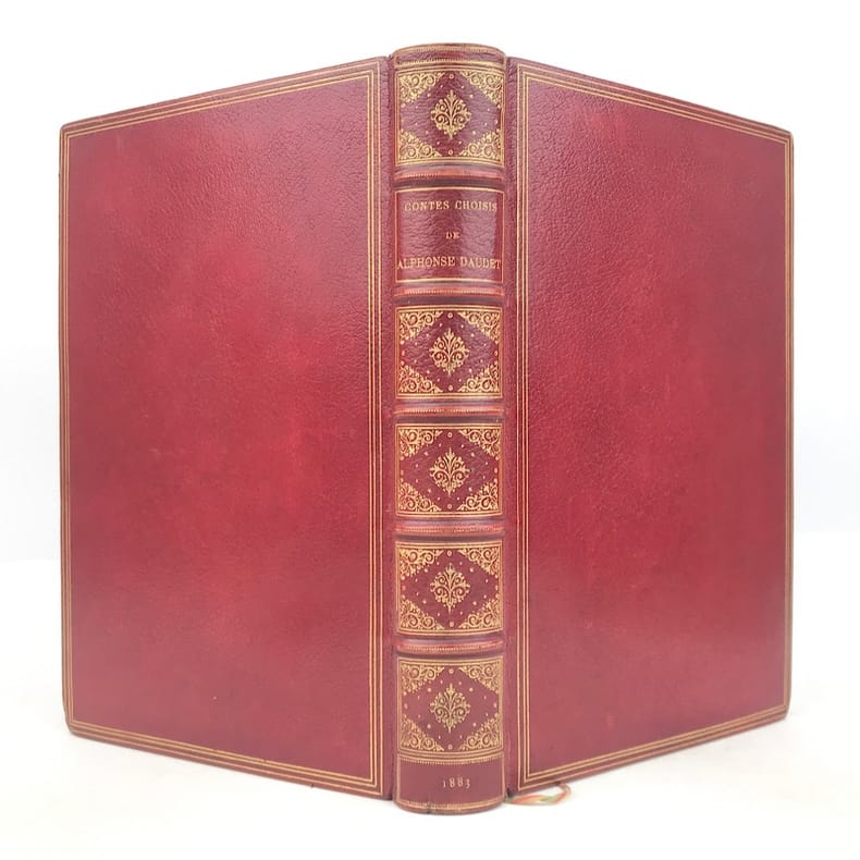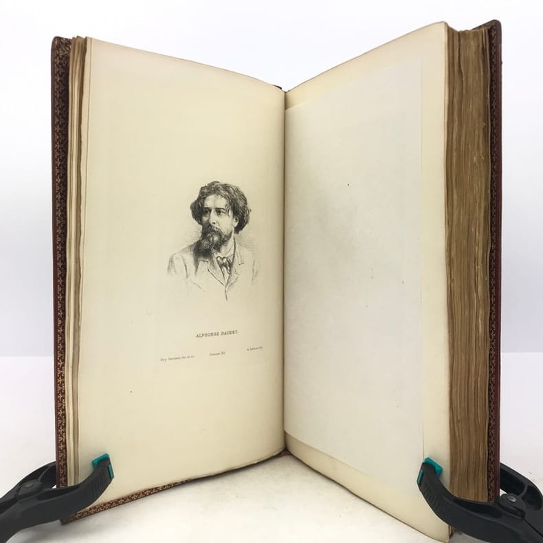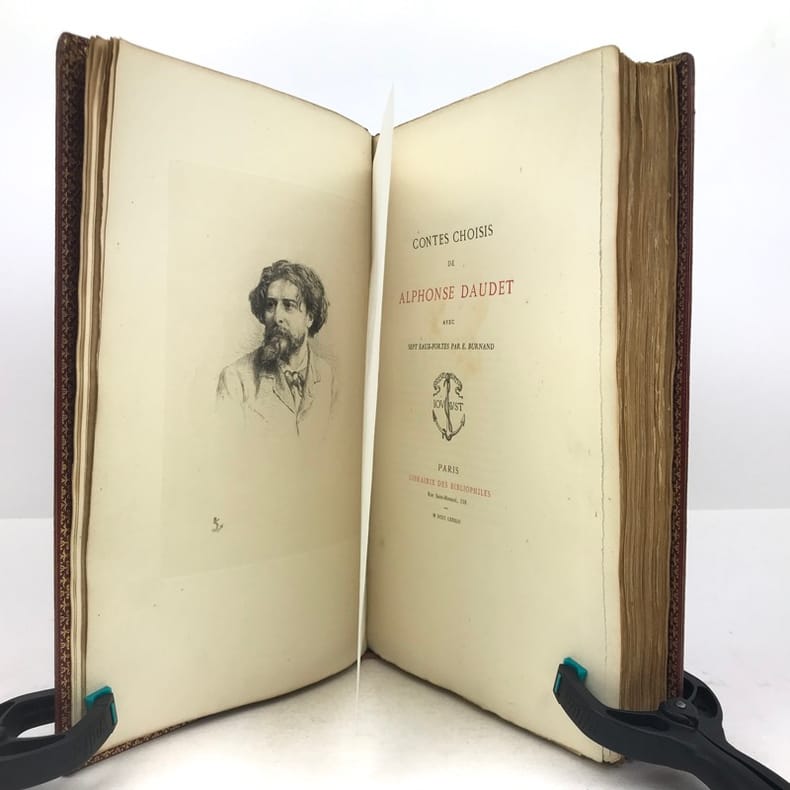 1 volume in-4 (25,5 cm x 16 cm), maroquin rouge (reliure de l’époque), dos à nerfs orné de motifs dorés, triple filet doré en encadrement des plats, dentelle intérieure dorée, couverture conservée. [4]-iii-1 bl.-314-[2] pages (complet). Reliure immaculée, piqûres. Bon état. Nouvelle édition illustrée d’un portrait et de 6 planches hors texte gravés à l'eau-forte par Burnan. Tirage à 250 exemplaires, celui-ci 1/200 sur vélin de Hollande à la forme, (n°169), ici ENRICHI d'un état supplémentaire pour les 7 eaux-fortes (état noir avant la lettre, avec remarques). Alphonse Daudet, (1840-1897), est un écrivain et auteur dramatique français notamment connu pour sa pièce de théâtre La Dernière Idole et son livre Lettres de mon moulin qui contient plusieurs histoires courtes connues, comme La Chèvre de monsieur Seguin. De nombreux textes popularisés par Daudet ont été écrits en collaboration avec d'autres auteurs, notamment Paul Arène, Léon Allard, Blanchot de Brenas et Julia Daudet son épouse. Bel exemplaire.