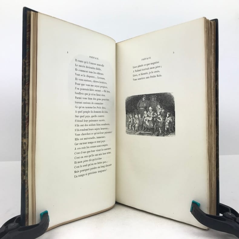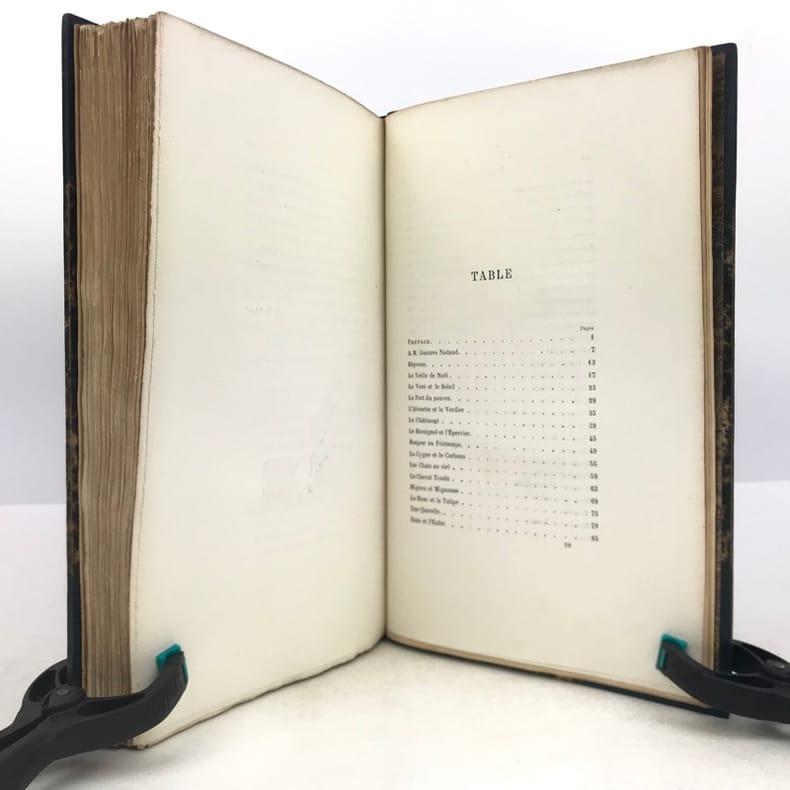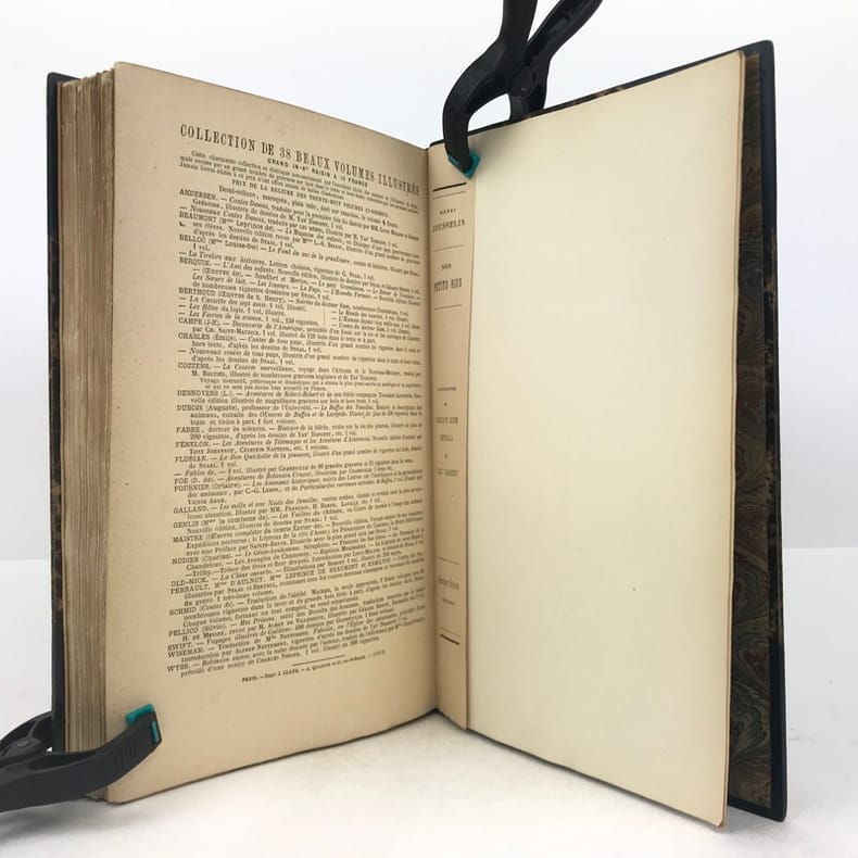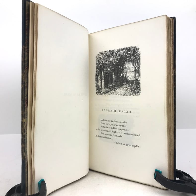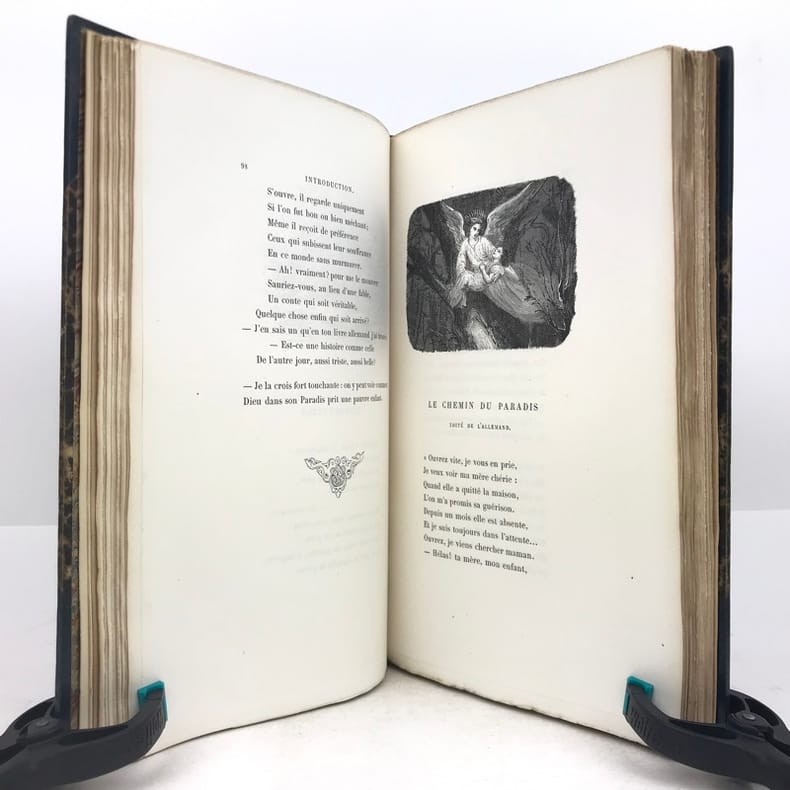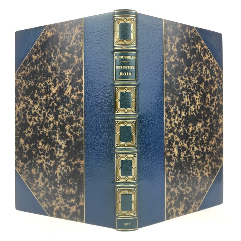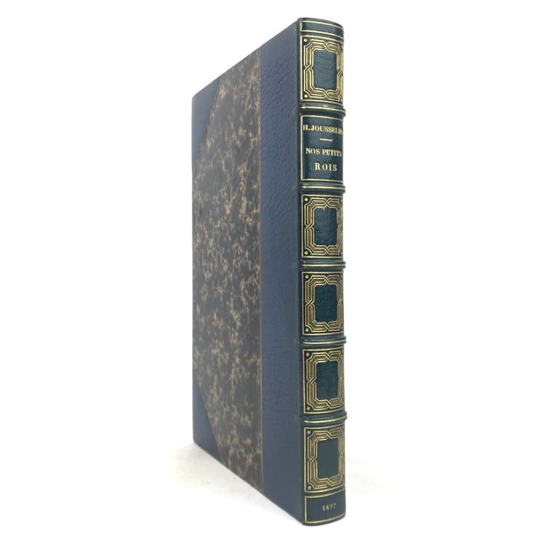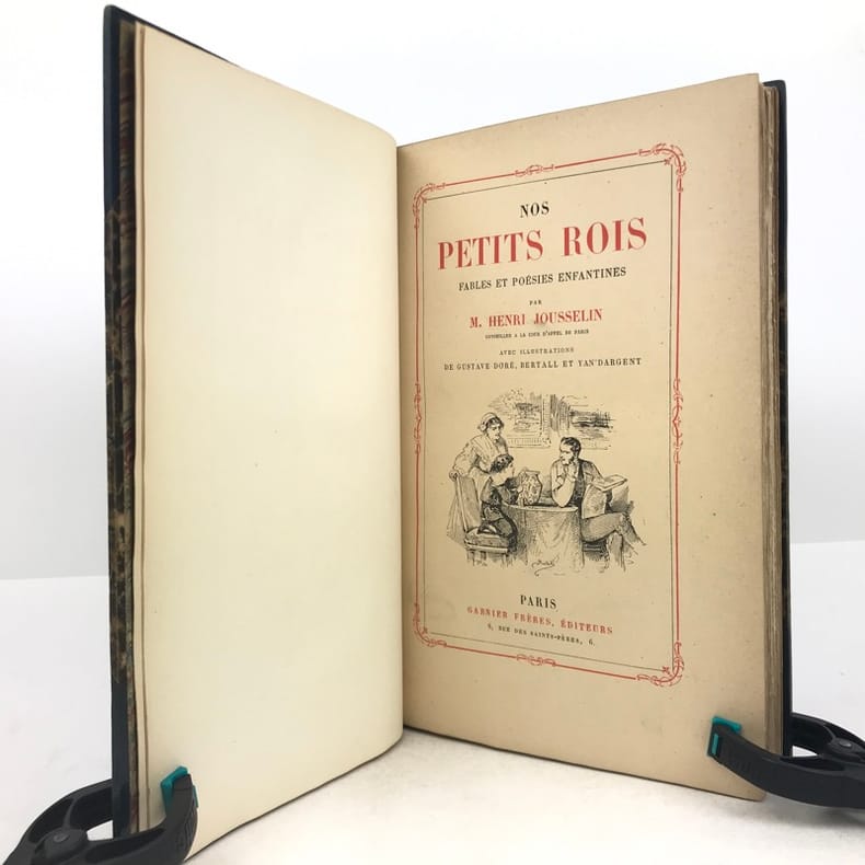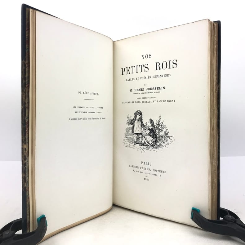 1 volume in-4 (25,5 cm x 15,5 cm), demi-maroquin bleu à coins (reliure de l’époque signée Champs), dos à nerfs orné de filets dorés, et de liserés mosaïqués de veau blond, 2 ex-libris contrecollés sur le contreplat, couverture conservée. [4]-307-1 bl. pages (complet). Reliure immaculée. Bon état. ÉDITION ORIGINALE illustrée de nombreuses gravures in-texte par Gustave Doré, Bertall et Yan' Dargent. Henri Jousselin fut procureur au tribunal d’Étampes puis conseiller à la cour d’appel de Paris. Il est l'auteur de plusieurs ouvrages destinés aux enfants et a laissé aussi des traductions françaises des “Mélodies Irlandaises” de Thomas Moore en 1869 et de “Demain”, suivi de “Mourad le malheureux” de “Maria Edgeworth” en 1877. Bel exemplaire.