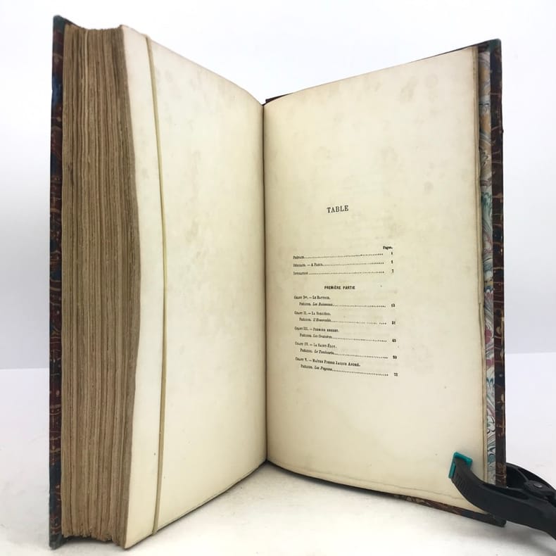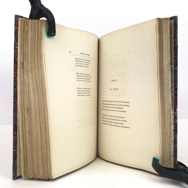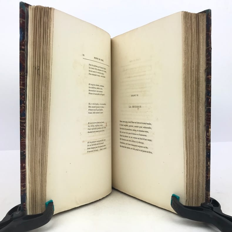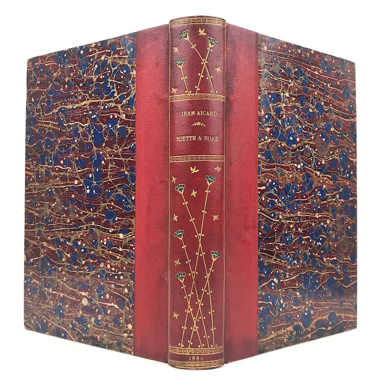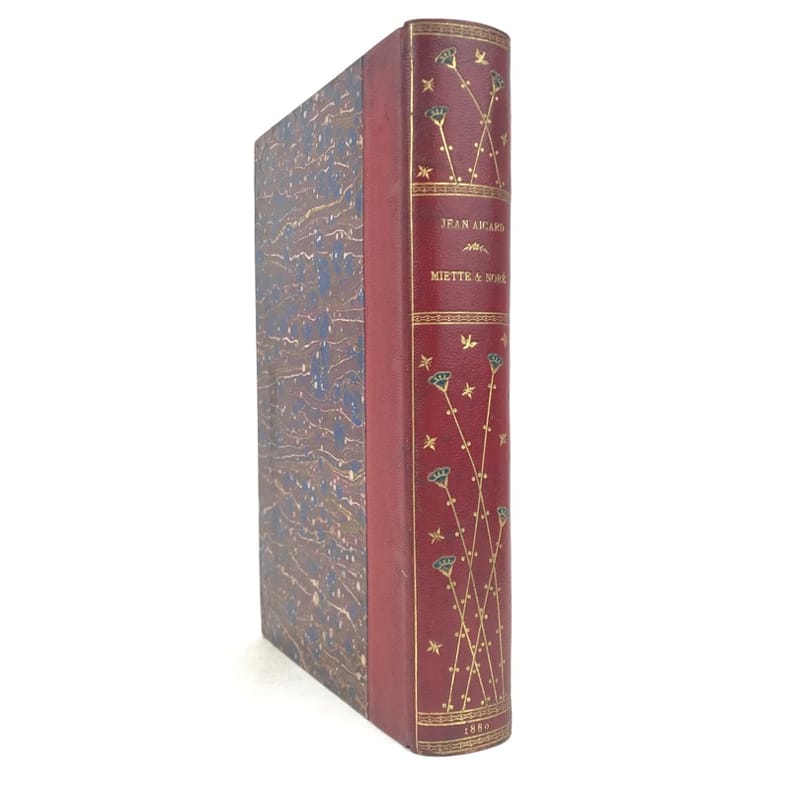 1 volume grand in-8 (25 cm x 15,5 cm), demi-chagrin rouge (reliure d’époque), dos lisse orné d'un décor floral composé de fers dorés, mosaïqués en bleu, tête dorée. [8]-xxxii-413-1 bl. pages (complet). Reliure noircie, rousseurs éparses. État très correct tout de même. Édition publiée la même année que l'originale au format in-12. L'édition au format in-8 comporte en plus, une préface de l'auteur et une pièce de vers, "Après le travail". Tirage à 220 exemplaires sur papier de Hollande au format in-8, dont 70 ont été mis dans le commerce, (n°195). Jean François Victor Aicard, (1848-1921), est un poète, romancier et dramaturge français. En 1874, il publie Poèmes de Provence, qui font de lui le poète de cette région. En 1876, il collabore au troisième recueil du Parnasse contemporain. Les deux romans qui lui valent la reconnaissance sont Maurin des Maures (1908) et L'illustre Maurin. D'une façon générale, l'enfance incarne une source d'inspiration prédominante dans son œuvre. Agréable exemplaire.