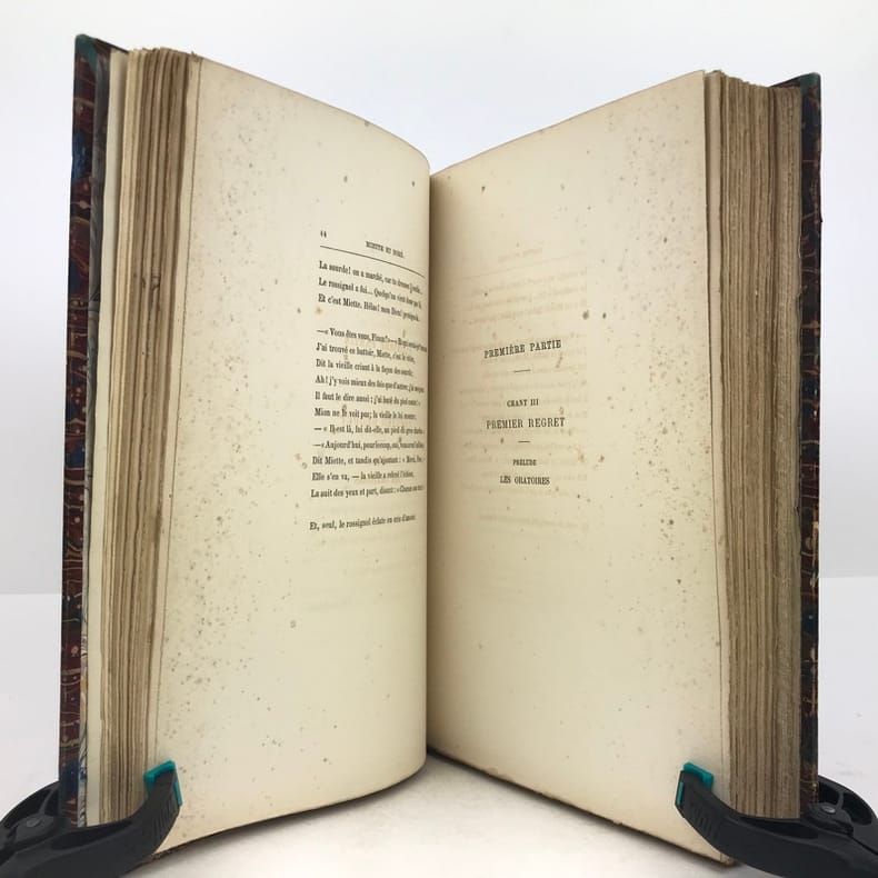Paul Ollendorff, Paris. 1885. In-12. Relié. Etat passable, Plats abîmés, Dos satisfaisant, Fortes mouillures. 413 pages. Auteur, titre, fleuron et filets dorés sur le dos. Etiquette de code sur la couverture. Quelques tampons de bibliothèque. Couverture défraîchie. Manques sur les plats (surface). Quelques rousseurs.. . . . Classification Dewey : 841-Poésie