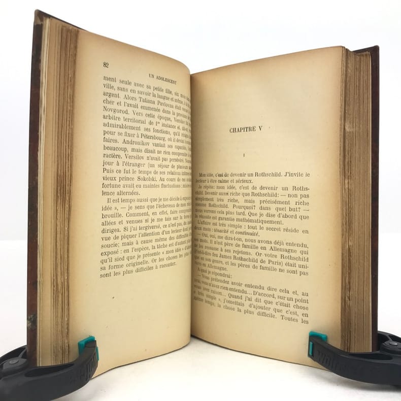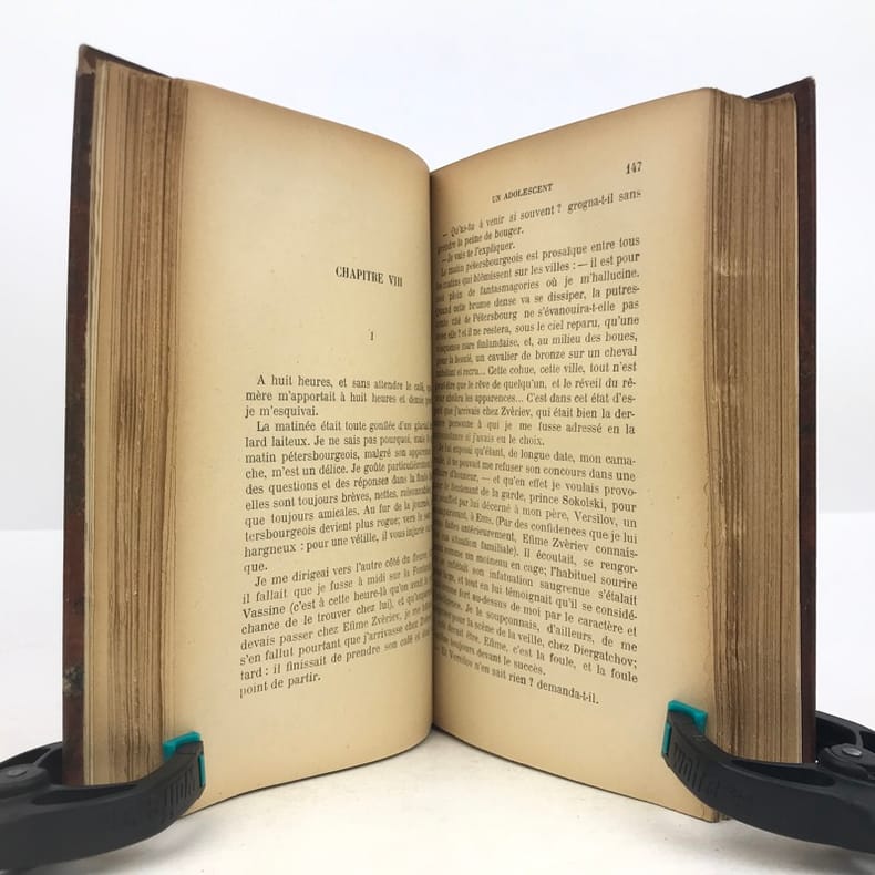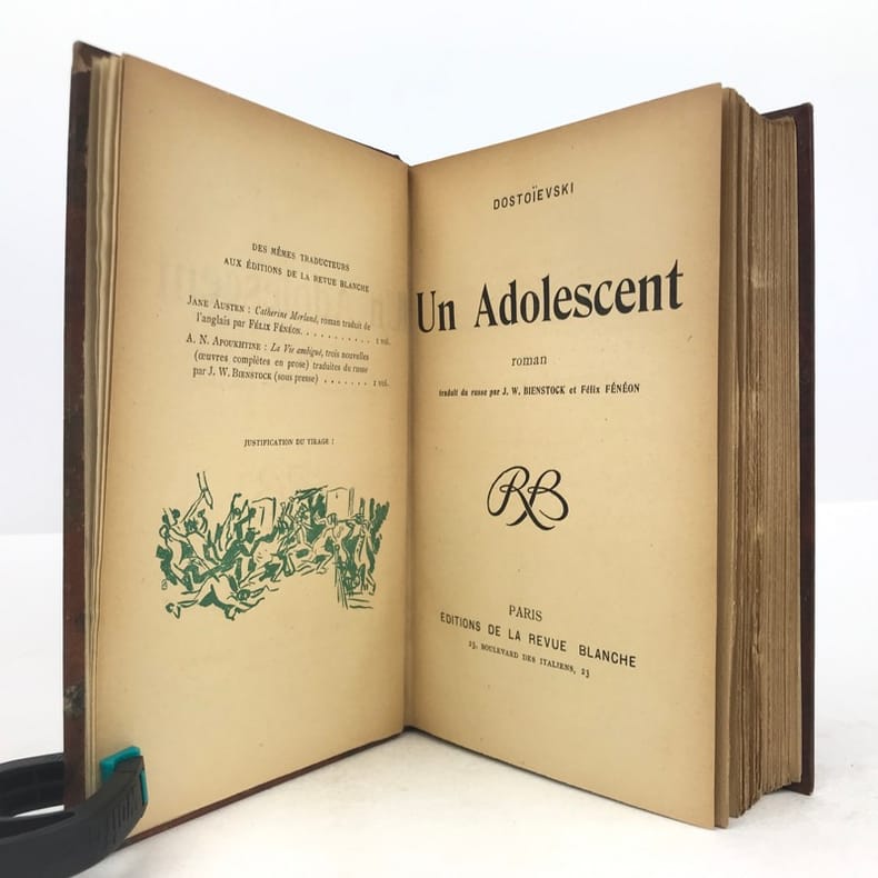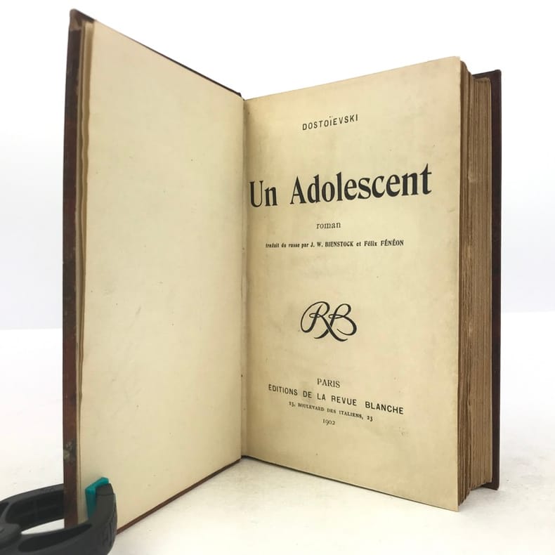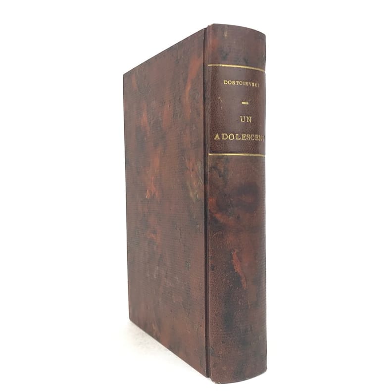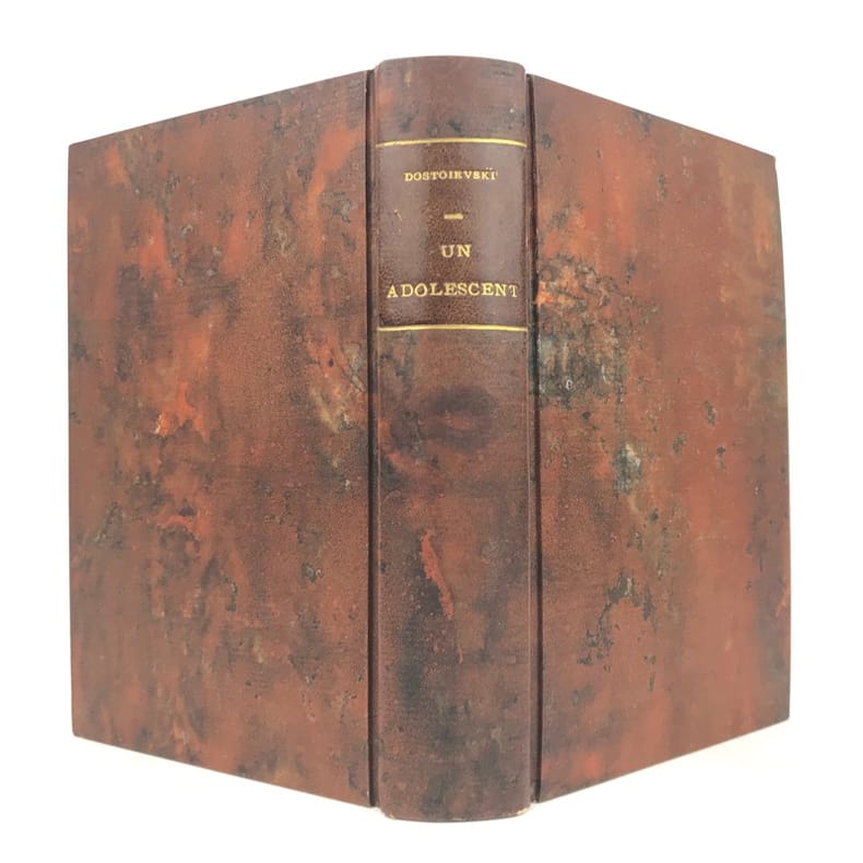 1 volume in-12 (18 x 11,5 cm), bradel papier (reliure moderne), couverture et dos conservés, dos lisse, pièce de titre en maroquin fauve avec titre doré, tranche de tête dorée, ex-libris manuscrit, [4]-620 pages (complet). Bon état. Première édition de la traduction française, réalisée par J.-Wladimir Bienstock (1868-1933), avocat, écrivain et traducteur franco-russe. Il est notamment l’un des premiers traducteurs de Tolstoï et Dostoïevski en langue française. Fiodor Dostoïevski (1821-1881) est un écrivain russe, considéré comme l’un des plus grands romanciers russes aux côtés de Léon Tolstoï. Il rédige ici son avant-dernier roman en 1876, avant les célèbres Frères Karamazov parus en 1879. Il y présente, en quelques semaines, les pensées et la vie d'Arkadi Makarovitch Dolgorouki, fils illégitime d’un aristocrate russe. Plaisant exemplaire.
