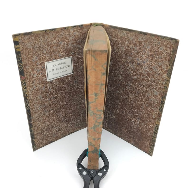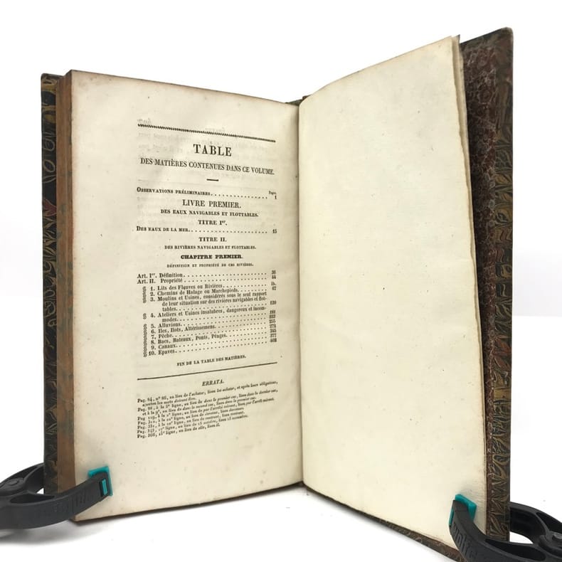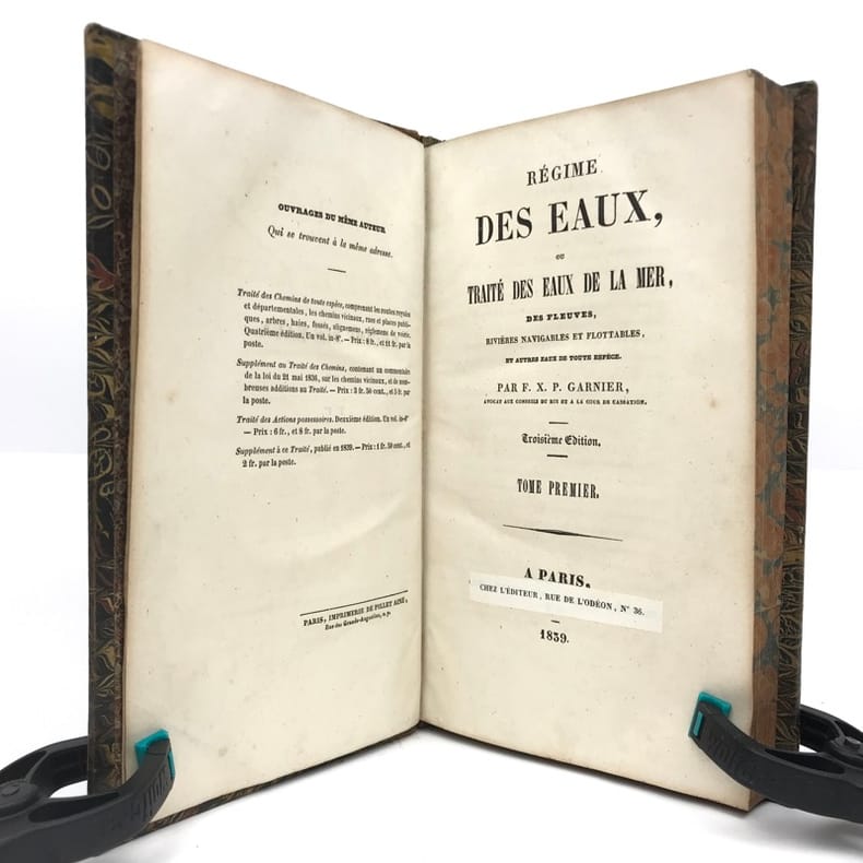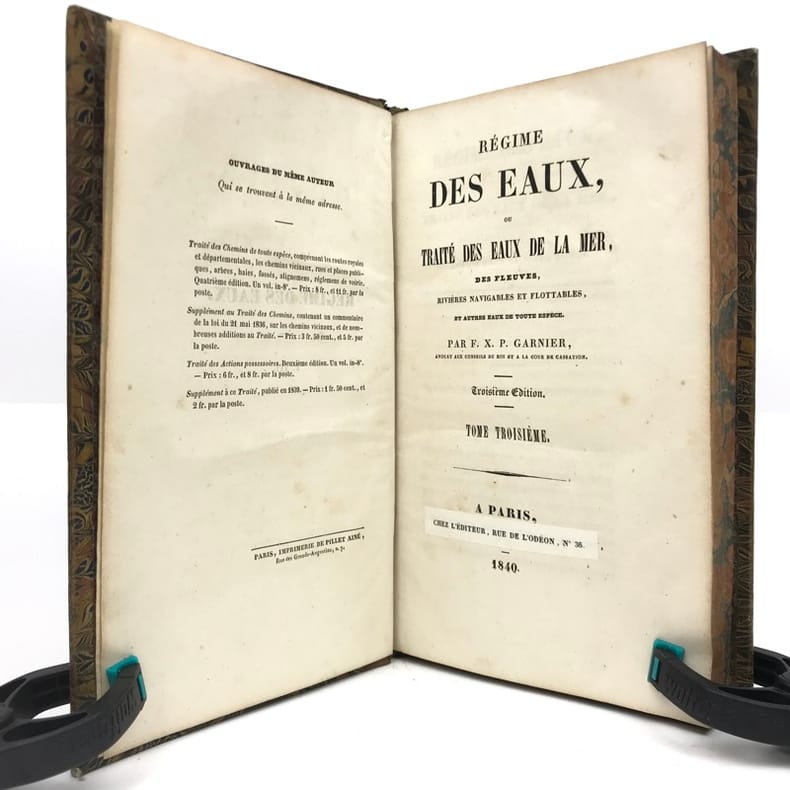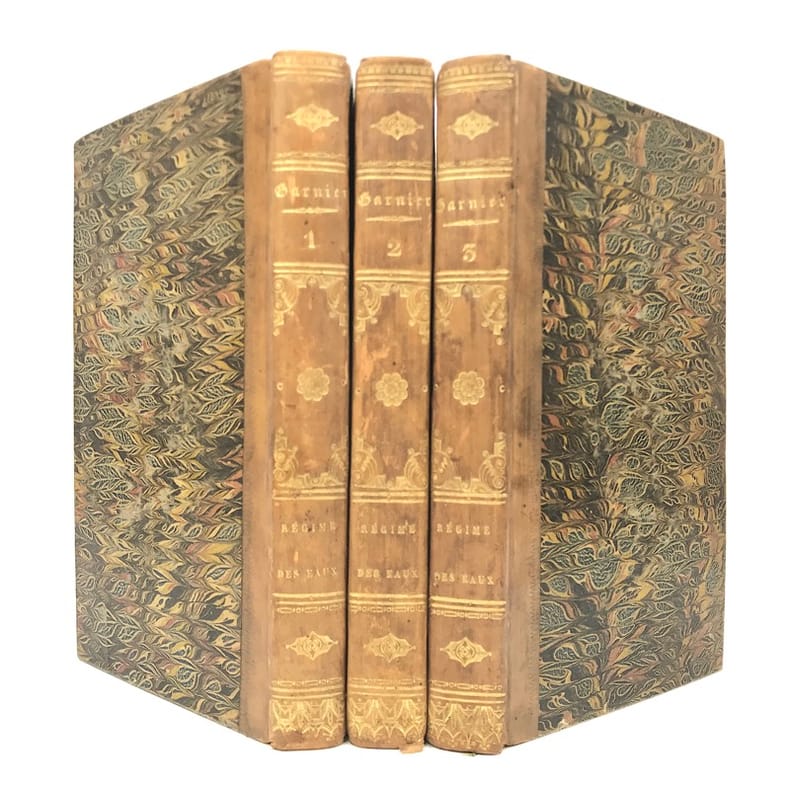 3 volumes (sur 5) in-8 (21,5 x 13 cm), demi veau blond bordé d’une roulette à froid (reliure de l’époque), dos lisse orné, tranches marbrées, [6]-427-[1]; [4]-426-[2]; [4]-430 pages. Trois premiers tomes seuls, dos frottés, très rares rousseurs. État très correct. Troisième édition de cet ouvrage à la fois juridique et technique. On y trouve toutes les lois relatives aux chemins de halage, aux canaux, aux bateaux, à la pêche, de très nombreux arrêts et jurisprudences, les sources minérales et thermales, etc. François Garnier (1793-1879) est un inspecteur général des mines, auteur de nombreux ouvrages juridiques et descriptifs, notamment un remarqué Traité des chemins (1823). Provenance : de la bibliothèque de M. Charles Delzons, Président du Tribunal d’Aurillac (1838-1930), avec son ex-libris sur les contreplats. Bon exemplaire.
