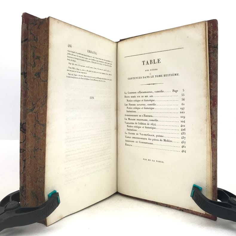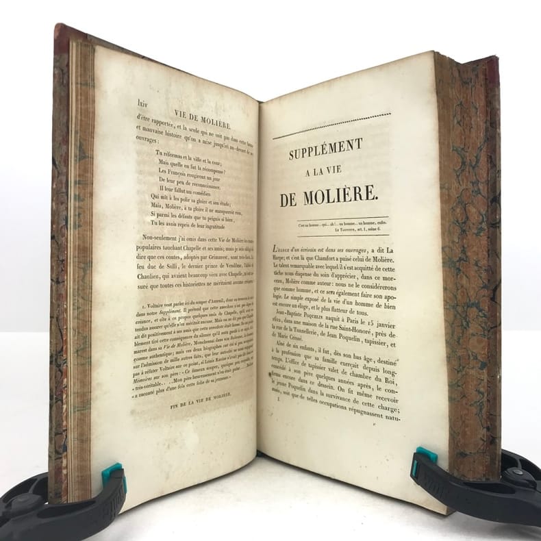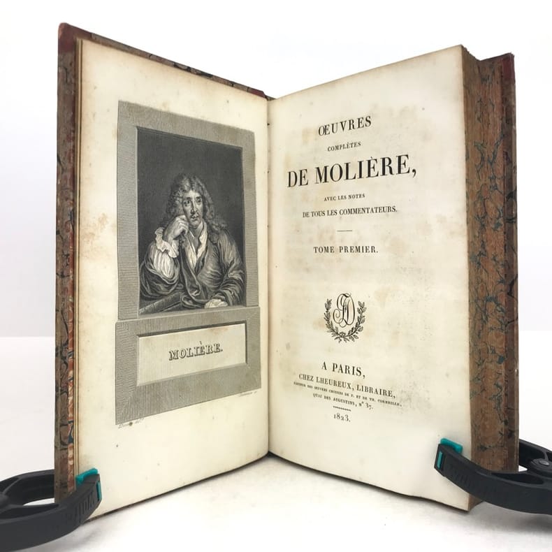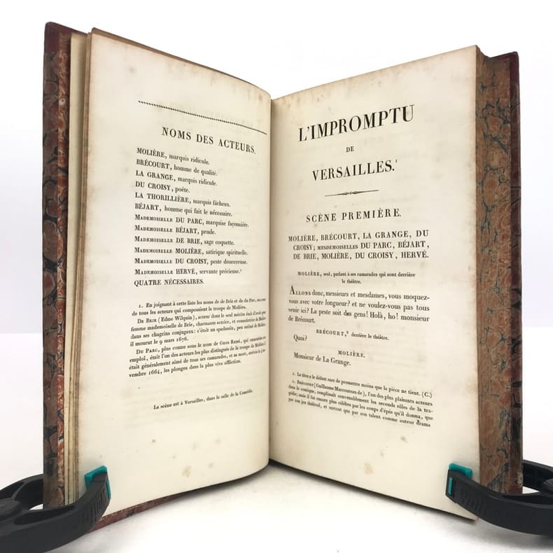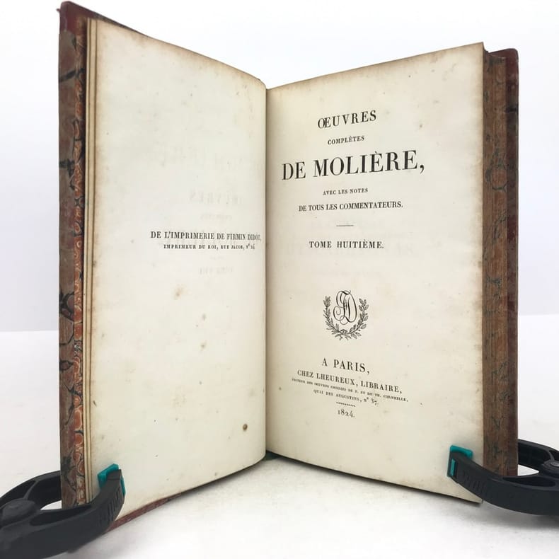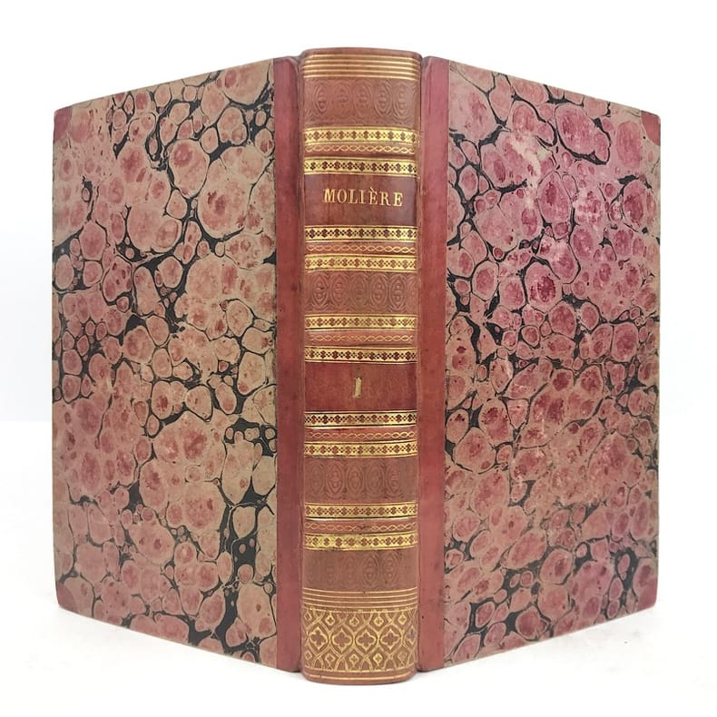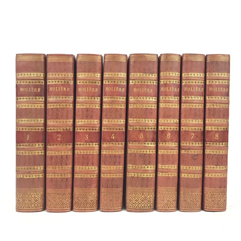 8 volumes in-8 (20 x 12,5 cm), demi-veau framboise à coins (reliure de l’époque), dos à nerfs orné, tranches marbrées, cxxiv-454-[4] ; [4]-506 ; [4]-476 ; 420-[2] ; [4]-578-[2] ; 402-[2] ; [4]-438-[2] ; 466-[2] pages (complet). Erreurs de pagination au tome III, rousseurs. État correct. Nouvelle édition, illustrée d’un portrait en frontispice. Selon l’ouvrage de Paul Lacroix, Bibliographie moliéresque, nous avons ici une “édition critique très-remarquable, pour laquelle le savant éditeur, qui préparait alors son Histoire de la vie et des ouvrages de Molière, a fait usage des nombreux matériaux que lui fournissant la riche bibliothèque de M. de Soleinne”. Agréable exemplaire.