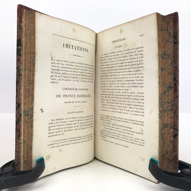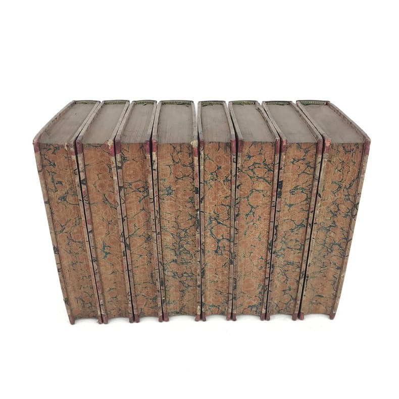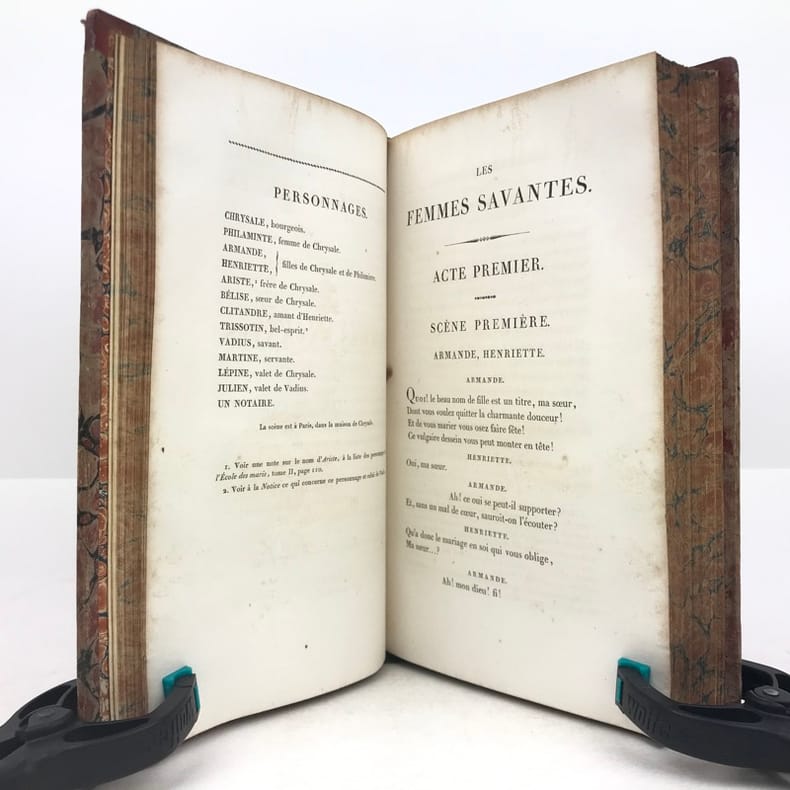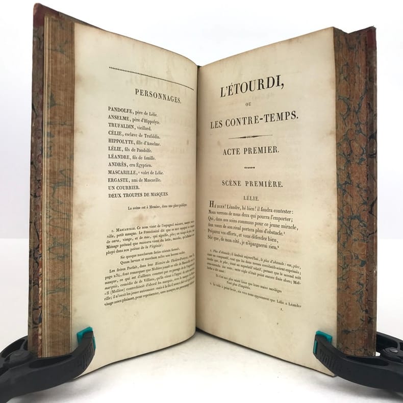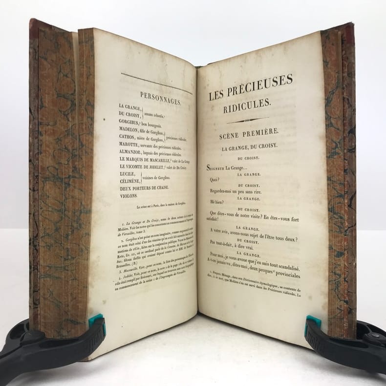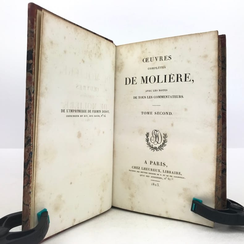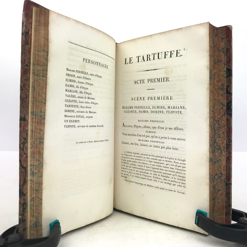 8 volumes in-8 (20 x 12,5 cm), demi-veau framboise à coins (reliure de l’époque), dos à nerfs orné, tranches marbrées, cxxiv-454-[4] ; [4]-506 ; [4]-476 ; 420-[2] ; [4]-578-[2] ; 402-[2] ; [4]-438-[2] ; 466-[2] pages (complet). Erreurs de pagination au tome III, rousseurs. État correct. Nouvelle édition, illustrée d’un portrait en frontispice. Selon l’ouvrage de Paul Lacroix, Bibliographie moliéresque, nous avons ici une “édition critique très-remarquable, pour laquelle le savant éditeur, qui préparait alors son Histoire de la vie et des ouvrages de Molière, a fait usage des nombreux matériaux que lui fournissant la riche bibliothèque de M. de Soleinne”. Agréable exemplaire.