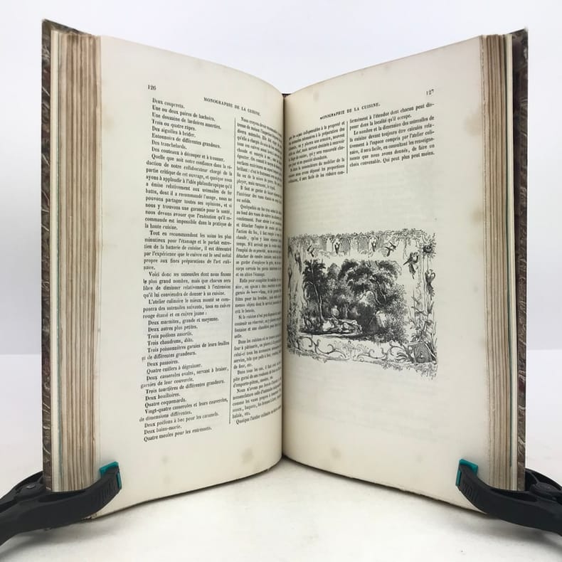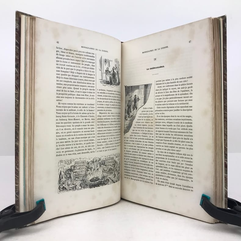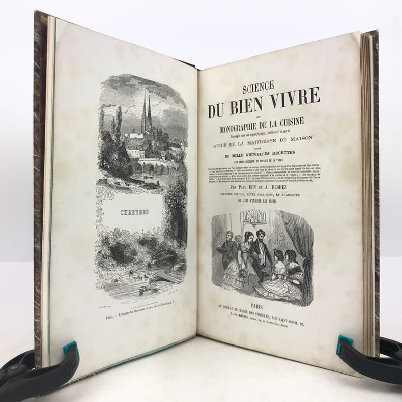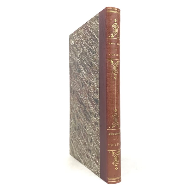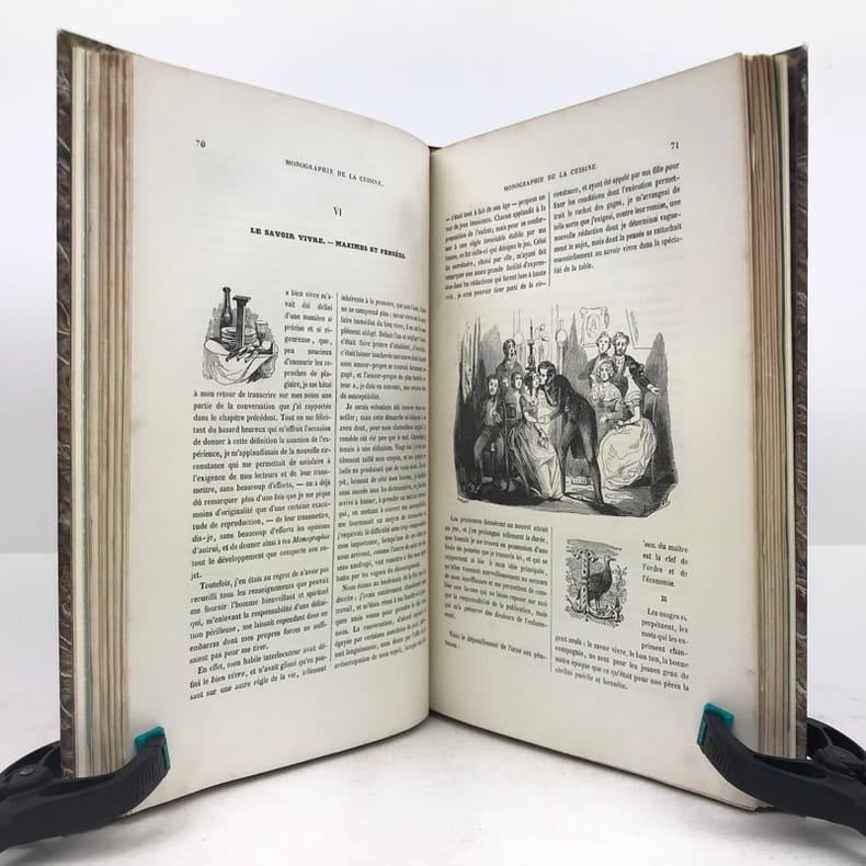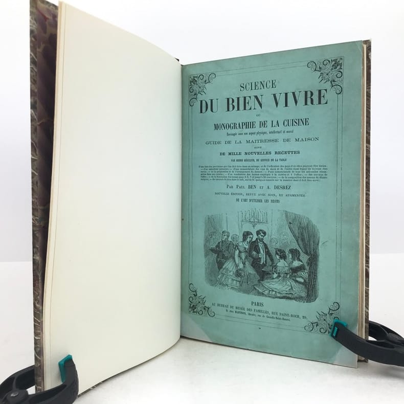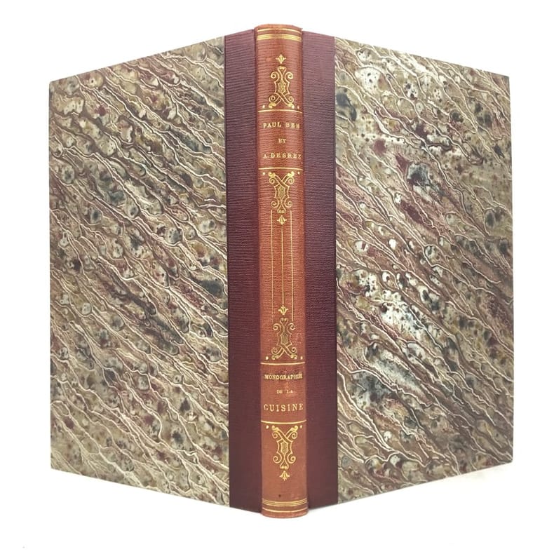 4 ff.n.ch., 225 pp., 7 pp.n.ch. de table, texte sur deux colonnes, nombreuses illustrations sur bois dans le texte.Vicaire 82. Oberlé, "Fastes", 207. Bitting, 35. Ce bel ouvrage romantique a paru au départ en 1844 en 14 livraisons à 2 colonnes. D'après Quérard, Paul Ben serait le pseudonyme du publiciste Paul-Benjamin Chareau (1792-1872). Illustré de nombreuses vignettes gravées sur bois, dans le texte ou à pleine page comprises dans la pagination."Le livre est dédié "au secrétaire de feu Antonin Carême" (pseudonyme de Frédéric Fayot), qui publia entre autres les Classiques de la Table. (…) Calendrier culinaire, nomenclature des vins, échelle graduée des fonctions culinaires, moeurs et usages des cuisines, chansons de table (avec musique notée), savoir-vivre, maximes diverses, l'art culinaire en Europe, le thé et les soirées dansantes, la vaisselle…"