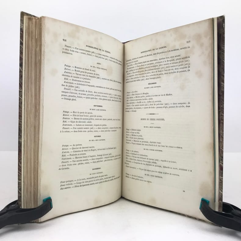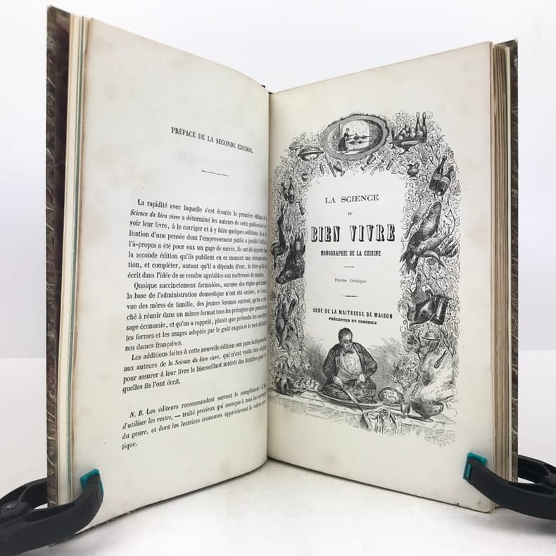 Paris, Au Bureau du Musée des Familles, Paris, Au Bureau du Musée des Familless.d. (1864) ; in-8, broché, couverture verte illustrée. 4 ff. n. ch., 225 pp., 2 ff. n. ch. (table) - Illustré de nombreuses gravures romantiques dans le texte.Édition imprimée sur deux colonnes, “revue avec soin, et augmentée de l’Art d’utiliser les restes”. Cet ouvrage est dédié à “M. le secrétaire de feu Antonin Carême”, pseudonyme de Frédéric Fayot éditeur des fameux Classiques de la Table. Il comporte une Partie critique : Code de la Maîtresse de Maison, preceptes et conseils ; et une Partie pratique : travaux de la cuisine et de l’office. - Vicaire, 82 - Bitting, 35.Exemplaire non coupé, à l’état de parution, qq. pâles rousseurs.