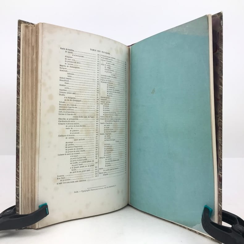 1 volume in-8 (24,5 x 16 cm), demi-maroquin brun à long grain (reliure moderne, signée Ardouin), dos lisse orné en long de filets et fers dorés, couverture bleue illustrée conservée, texte sur double colonne. [8]-225-[7] pages (complet). Reliure avec le dos insolé, couverture restaurée avec manques angulaires, 3 premiers feuillets avec coins restaurés, rousseurs éparses sans gêne de lecture. État très correct tout de même. Nouvelle édition, en partie originale, augmentée “De l’art d’utiliser les restes”; illustrée d'un frontispice et de nombreuses gravures sur bois in-texte, certaines à pleine page. Bon exemplaire.