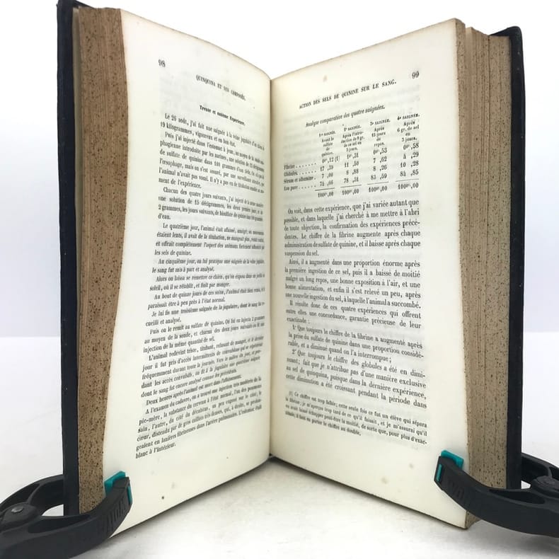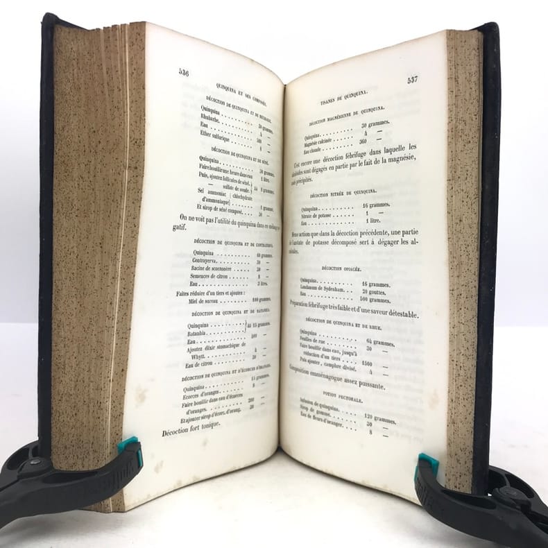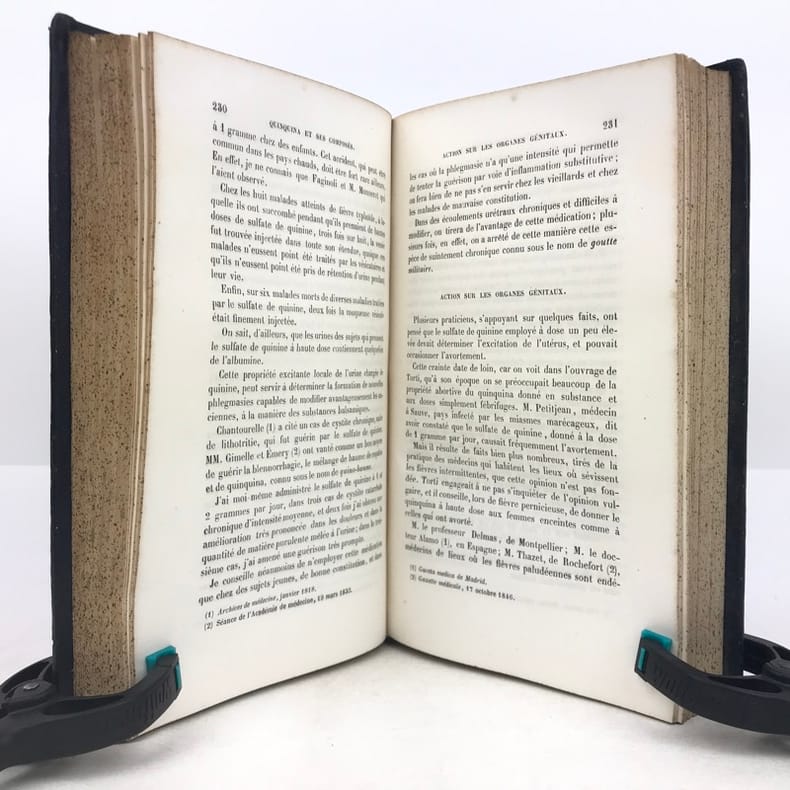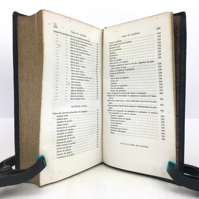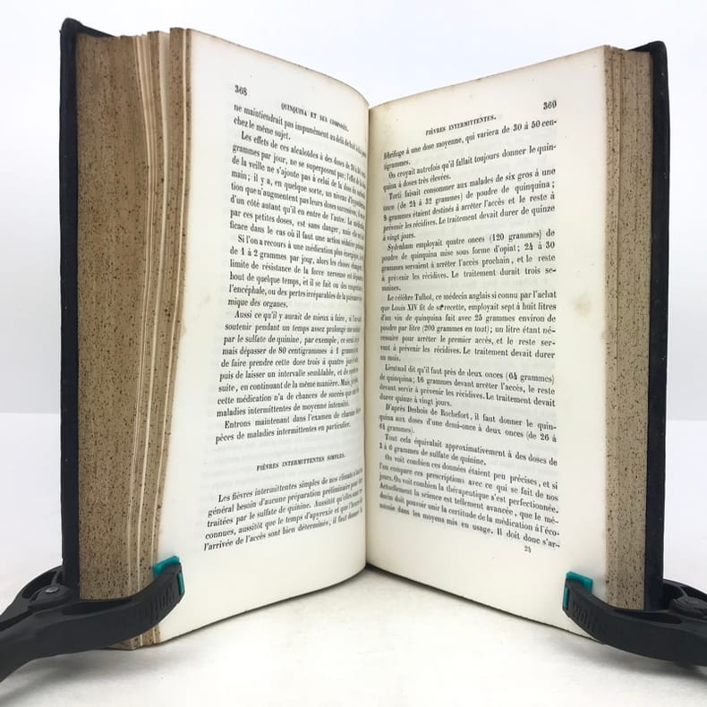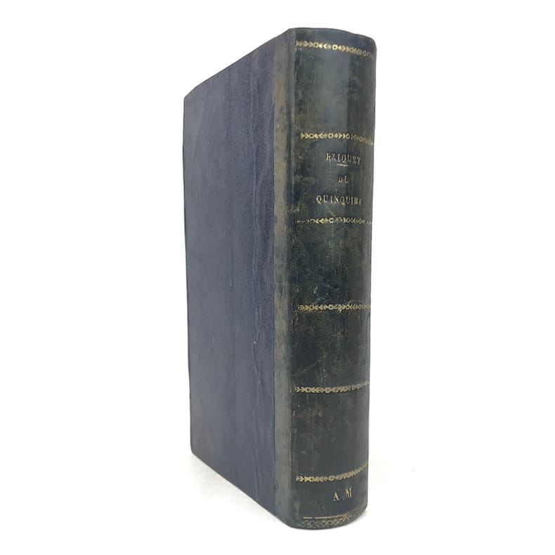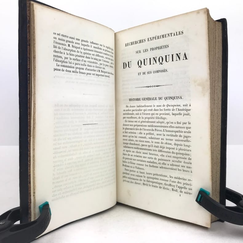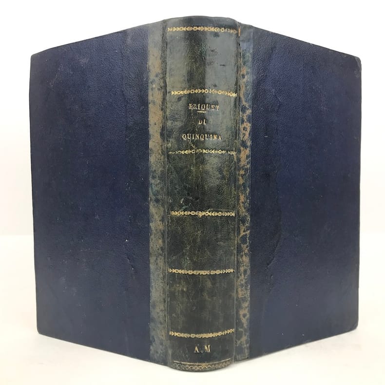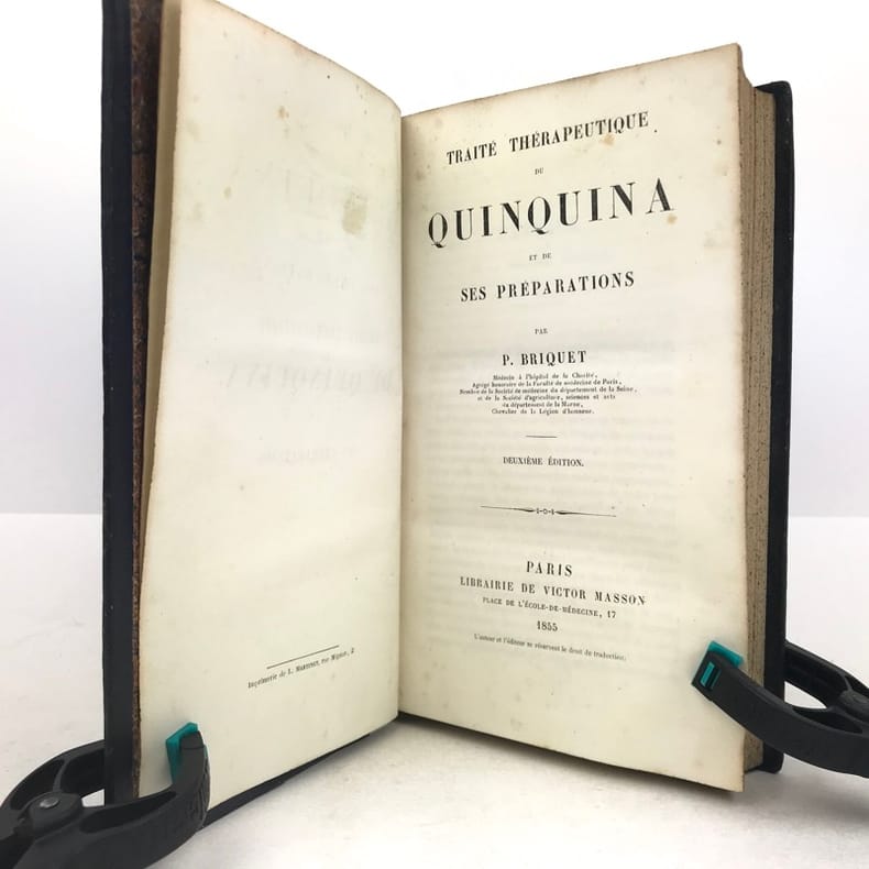1 volume in-8 (21 x 13 cm), demi-basane bleu marine (reliure de l’époque), dos lisse orné de roulettes dorées et du monogramme A.M. doré en pied, tranches mouchetées, cachet et ex-libris sur les premiers feuillets. ix-[3]-661-1bl. pages (complet). Dos de la reliure inégalement insolé avec 2 mors un peu fragiles, quelques rousseurs marginales, parfois avec atteinte au texte, mais sans gêne de lecture. État correct. Seconde édition de ce texte de Pierre Briquet (1796-1881), médecin à l'Hôpital Cochin et à la Charité de Paris, membre de l'Académie nationale de médecine. Rare et importante étude sur le quinquina : ''L'ouvrage ne constitue pas seulement l'étude du sulfate de quinine à haute dose, mais bien un traité complet, tant physiologique que thérapeutique, sur l'action de l'écorce du Pérou et de ses préparations, administrées à toutes les doses. Après avoir constaté les effets du quinquina et de ses préparations sur les divers organes et appareils de l'économie, je suis arrivé à établir la nature de leur influence sur l'organisation et ai fini par en déduire des rapports physiologiques entre l'action du quinquina et le phénomène de l'intermittence ; construisant ainsi une théorie qui rend raison de la spécificité de cette substance''. Préface de l’édition originale de 1853. Des bibliothèques du docteur Alcide Meunier avec son monogramme doré sur le dos de la reliure et son étiquette de bibliothèque imprimée et contrecollée sur le faux-titre; et Deuzel avec son cachet “Collection Deuzel livres et gravures sur la gastronomie”. Bon exemplaire.