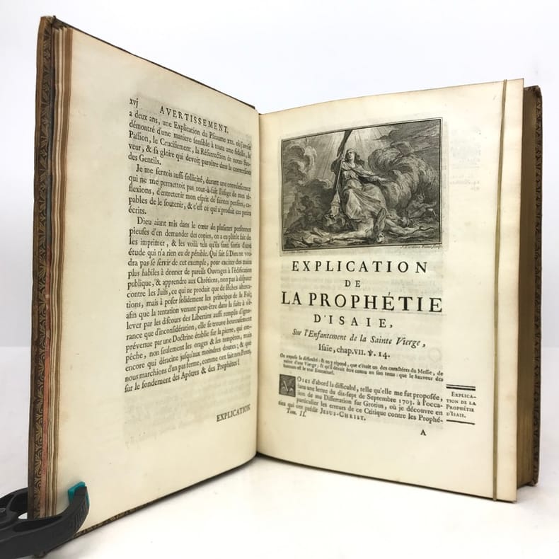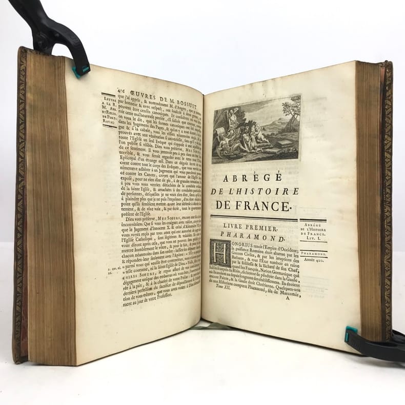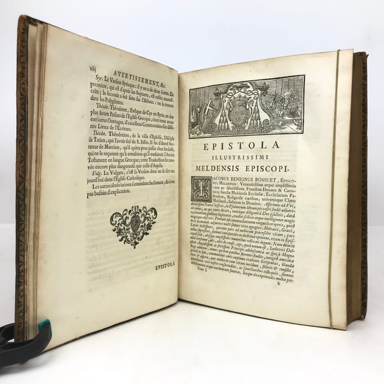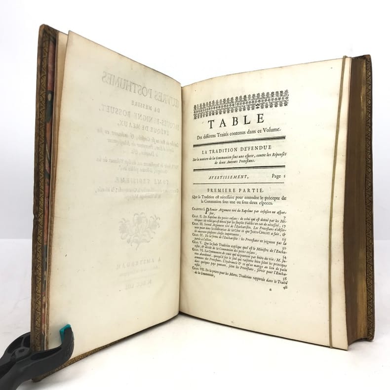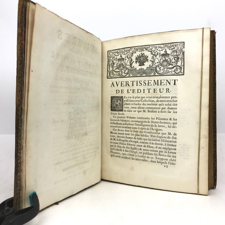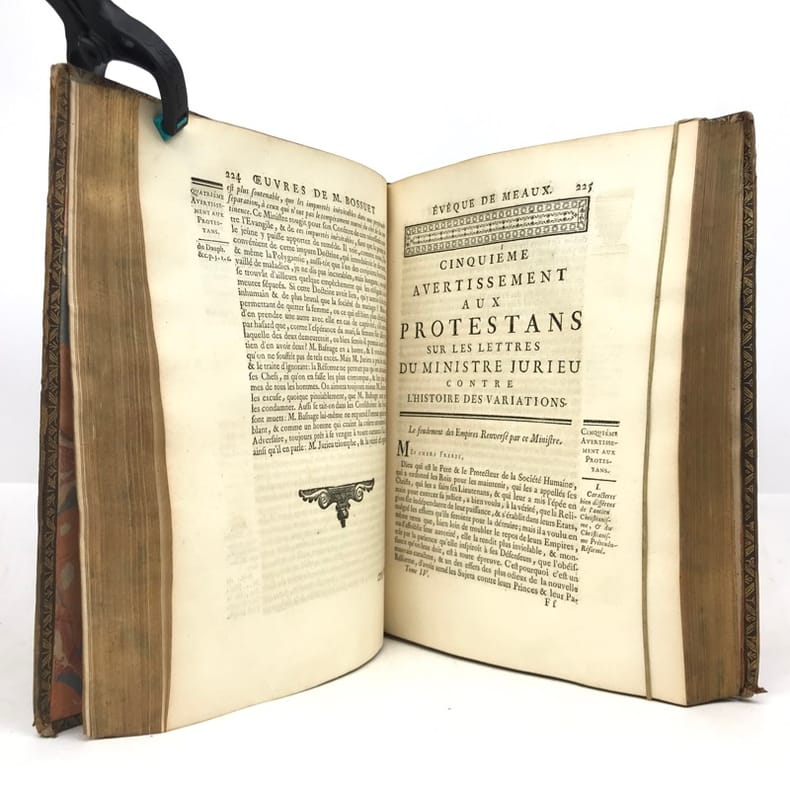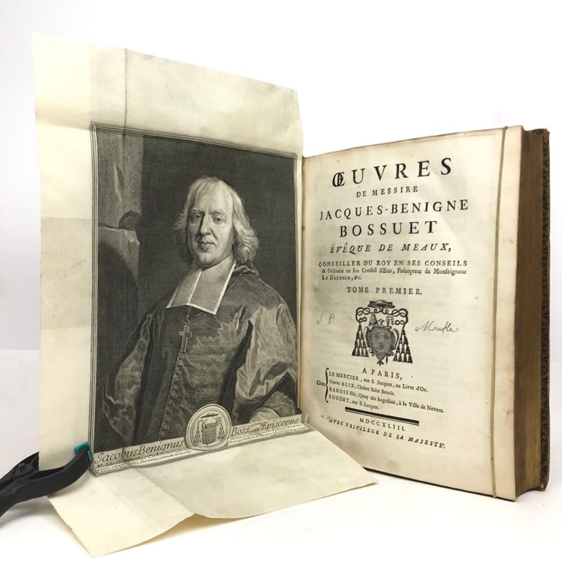 15 volumes in-4 (25,5 cm x 20 cm), veau marbré (reliure de l’époque), dos à nerfs joliment ornés de motifs dorés, roulettes légèrement différentes sur les 3 derniers volumes, pièces de titre et de tomaison en maroquin rouge, triple filet doré en encadrement, roulette dorée intérieure, tranches dorées sur marbrure, ex-libris imprimé avec monogramme S contrecollé sur les premiers contreplats, ex-libris manuscrit sur 6 titres, de [Simon Petrus Moufle], le tome 13 contient quelques notes manuscrites anciennes dans les marges ; xlx (au lieu de l)-[2]-820 ; xvi-940 ; 16-xxviii-707-1bl. ; xxiii-[1]-632 ; [2]-xxxii-724 ; xxxv-[1]-767-1bl. ; lii-696 ; xxvii-[1]-584 ; [2]-xii-651-1 bl. ; xxiii-[1]-695-1bl. ; [2]-xxiv-406-258 ; [2]-259 à 856-[106] ; [4]-lxxvi-[2]-556 ; [4]-xxvi-648-[2] ; [4]-x-494-238-[2] pages (complet). Frottements aux reliures, sur les dos, les charnières, les chants, et sur les coiffes, certaines avec petit accident, 2 charnières en partie fendues, quelques coins émoussés certains avec manque de cuir avec atteinte à un plat (t.4), dernier volume un peu taché sur le dos, quelques feuillets brunis sans gêne de lecture, pâles rousseurs éparses et mouillures marginales à quelques feuillets. État très correct. Première édition collective illustrée d'un portrait de l'auteur dépliant en frontispice gravé par le chevalier Edelinck d’après Rigault, et de 12 bandeaux gravés par Cochin et Tardieu. Pour les 12 premiers volumes, la pagination est légèrement différente à celle donnée par Tchemerzine; tandis que les 3 derniers volumes, publiés par l’abbé Leroy, sont conformes à la pagination de Tchemerzine. Pour être totalement complètes, à ces œuvres, furent publiés également 5 autres volumes Défense de la Déclaration, en 1745. Homme d’envergure nationale et personnage central du Grand Siècle, Jacques Bénigne Bossuet devient académicien en 1671 et évêque de Meaux en 1681. Prédicateur influent et orateur de talent, il rédige de nombreux traités sur l’histoire et la religion. Louis XIV le désigne notamment comme précepteur du Grand Dauphin. Il travailla longtemps à la réunion des églises catholique et protestante mais n’y parviendra jamais. Bel exemplaire.