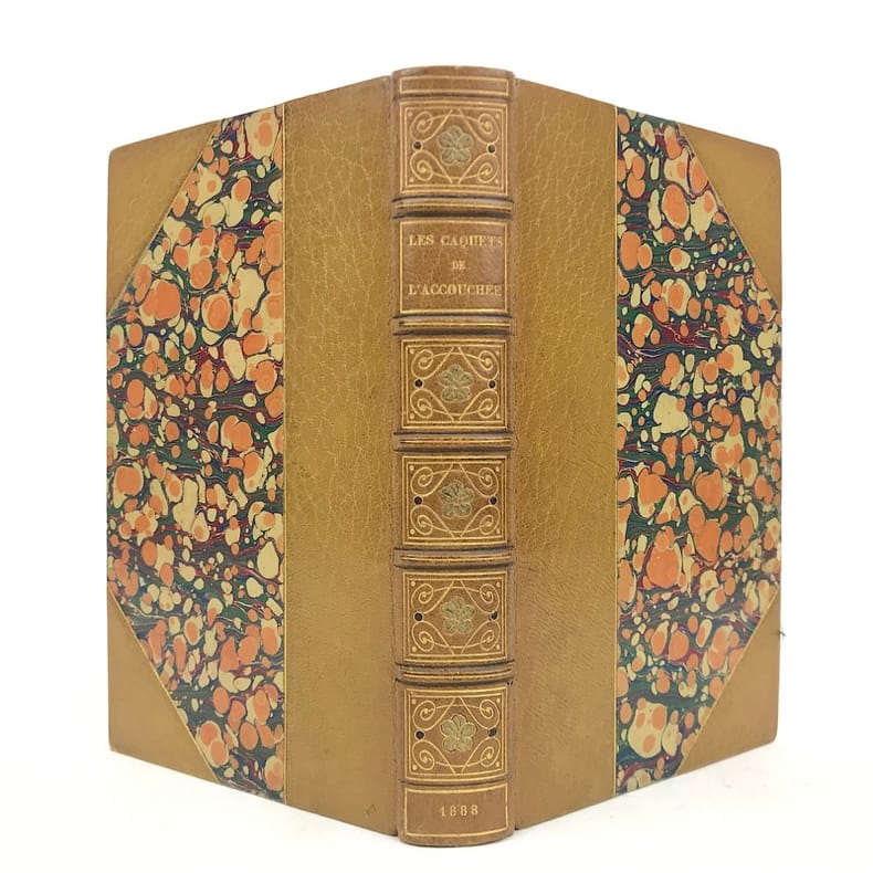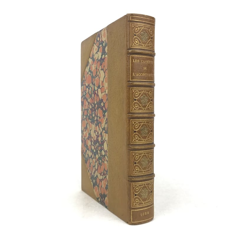 1 volume in-12 (17,5 x 10,5 cm), demi-maroquin citron à coins (reliure de l’époque, signée Stroobants), couverture et dos conservés, dos à nerfs orné, avec COQUELICOTS mosaïqués, filet doré en bordure, titre en rouge et noir, ex-libris de J. L. et C. Pierron, [4]-xxx-[2]-226-[2] pages (complet). Bon état. Nouvelle édition, illustrée de 14 vignettes in-texte gravées à l'eau-forte par Adolphe Lalauze. Les Caquets de l'accouchée, dont le titre fait référence aux visites effectuées par l’entourage d’une nouvelle mère à son chevet peu de temps après son accouchement, est une satire anonyme, publiée pour la première fois en 1622 en plusieurs feuilles volantes. Cette satire rencontre dès sa parution un grand succès, et connaîtra de nombreuses rééditions. Bel exemplaire, dans une fine reliure de Stroobants. Vendu 02/10/2025