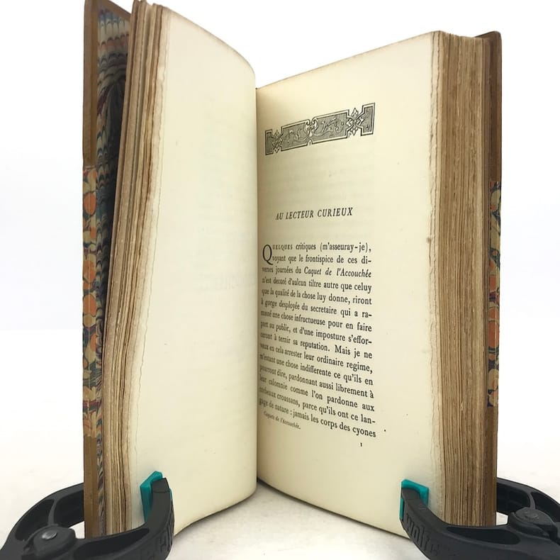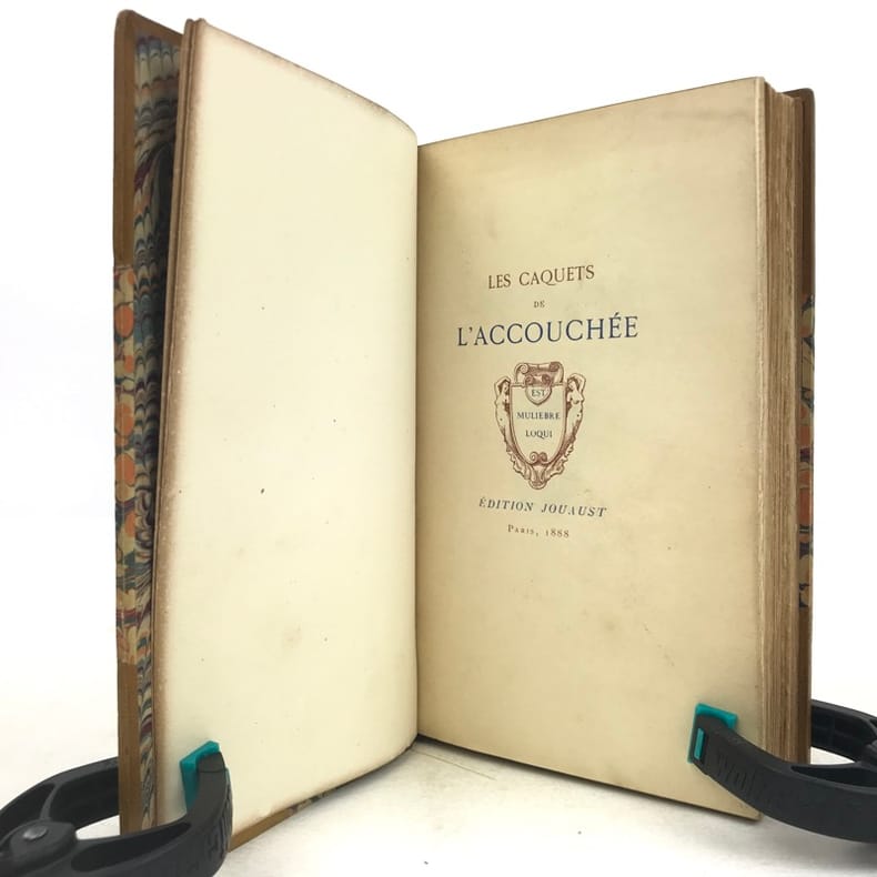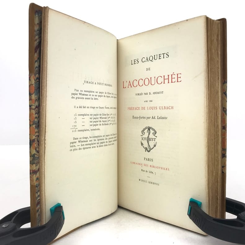 Jolie réimpression de cette satire anonyme du XVIIe siècle. Sur les conseils de son médecin, un Parisien en convalescence choisit de se distraire en assistant aux « caquets de l'accouchée » : à chaque naissance bourgeoise, voisines et nourrices visitaient l'accouchée dans une ambiance propice aux commérages et aux plaisanteries. Tirage limité à 76 exemplaires, celui-ci un des 66 sur papier vergé. Cette édition était faite pour compléter la collection des Joyeusetes, faceties et folastres imaginations de Téchener, au format et au tirage identiques. Bel exemplaire relié par Capé. Coins un peu écrasés.