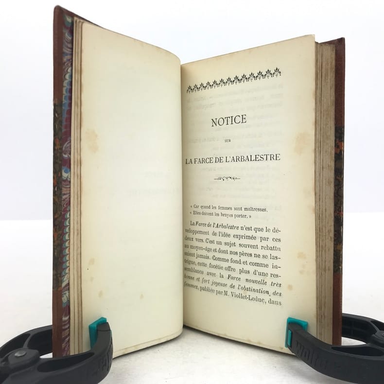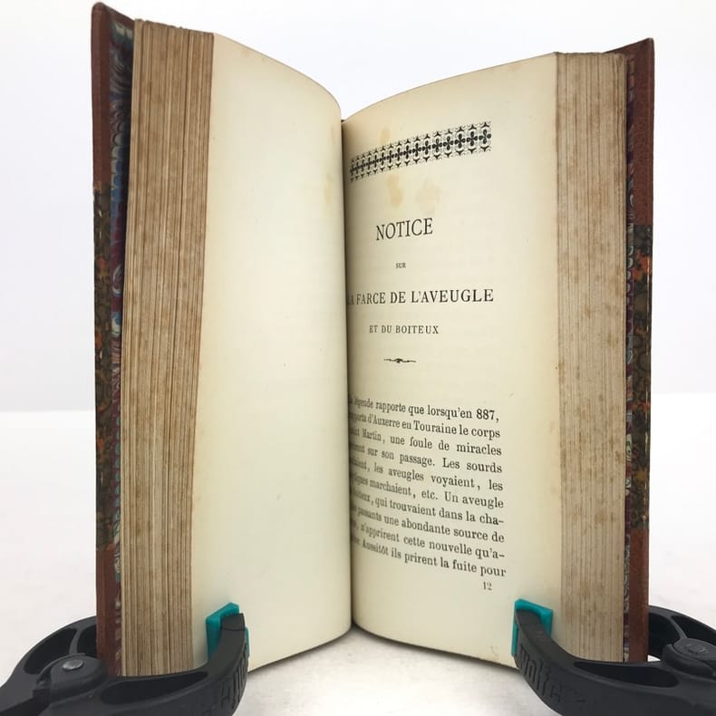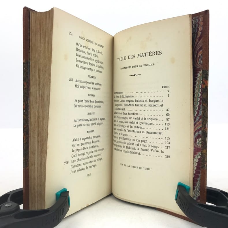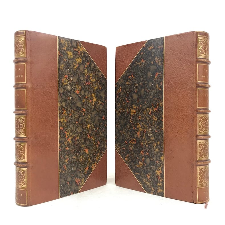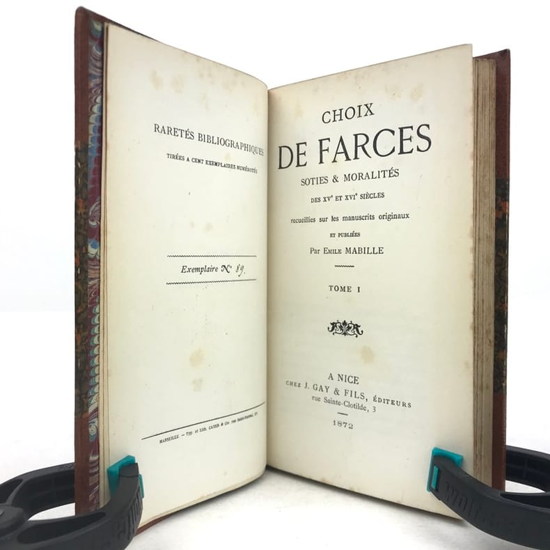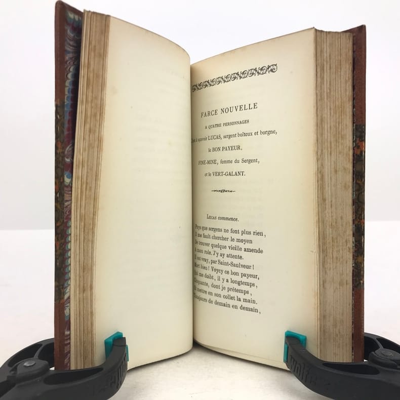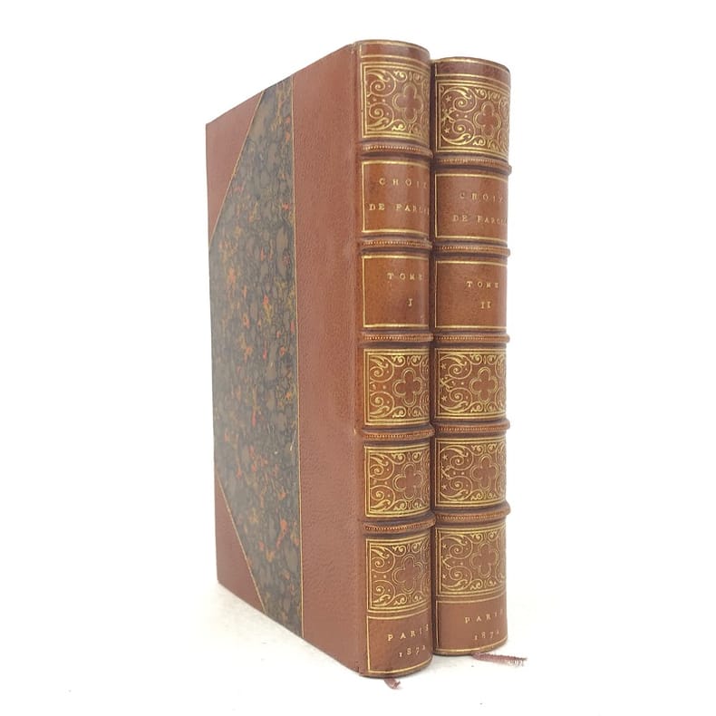 2 volumes in-16 (15 x 9 cm), demi-maroquin ocre à coins (reliure de l’époque signée Smeers), dos à nerfs joliment orné, filet doré en bordure, tranche de tête dorée, xi-[1]-274-[2] ; 315-[3] pages (complet). Rousseurs éparses. État très correct. ÉDITION ORIGINALE. Tirage fut limité à 100 exemplaires, (n°89). Émile Mabille (1828-1874) est un archiviste-paléographe, employé au département des manuscrits de la bibliothèque nationale. Il rédige ce recueil à partir de manuscrits originaux des XVe et XVIe siècles. Agréable exemplaire.