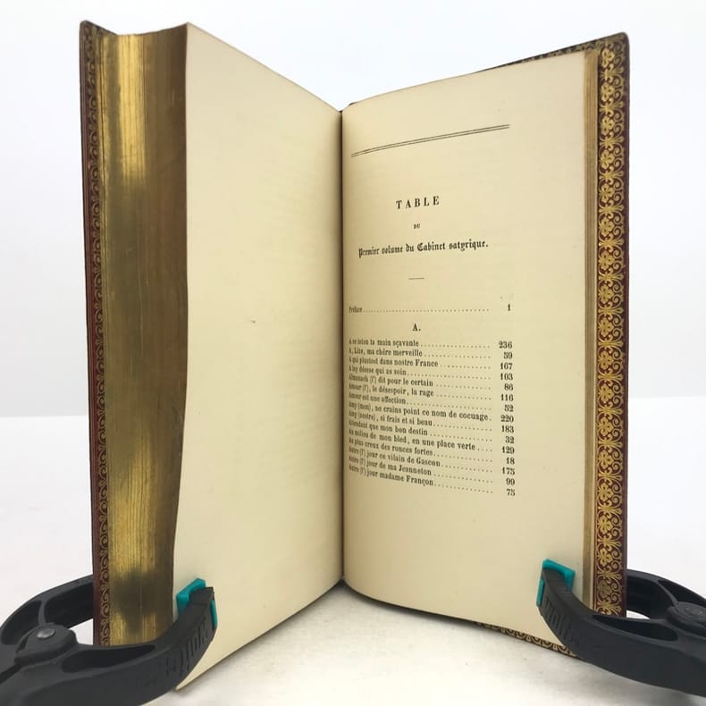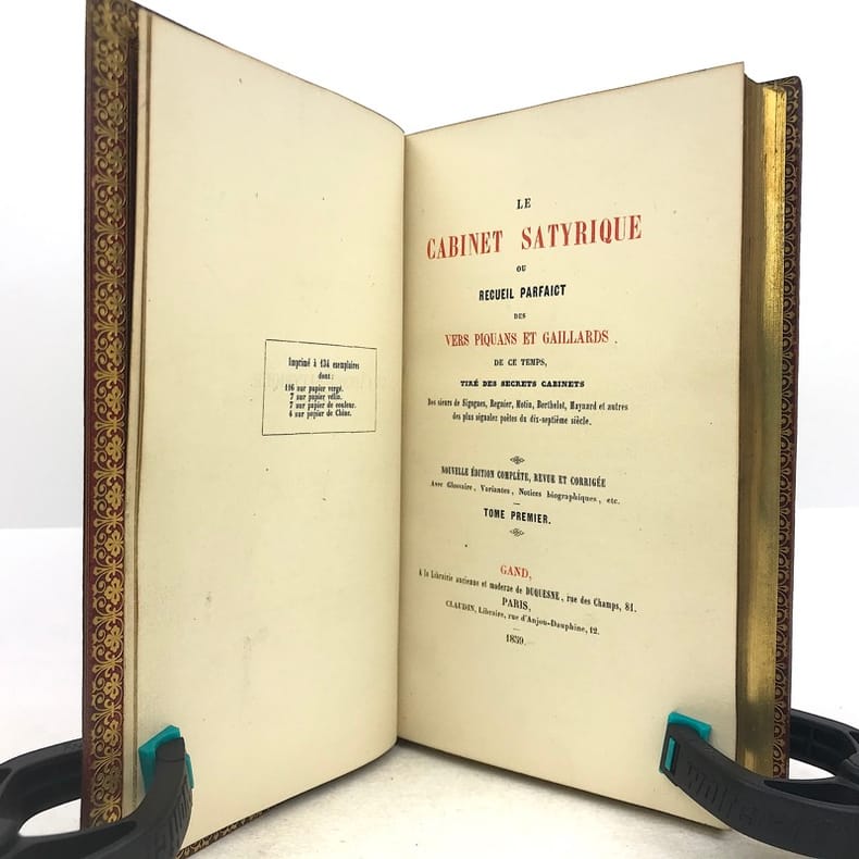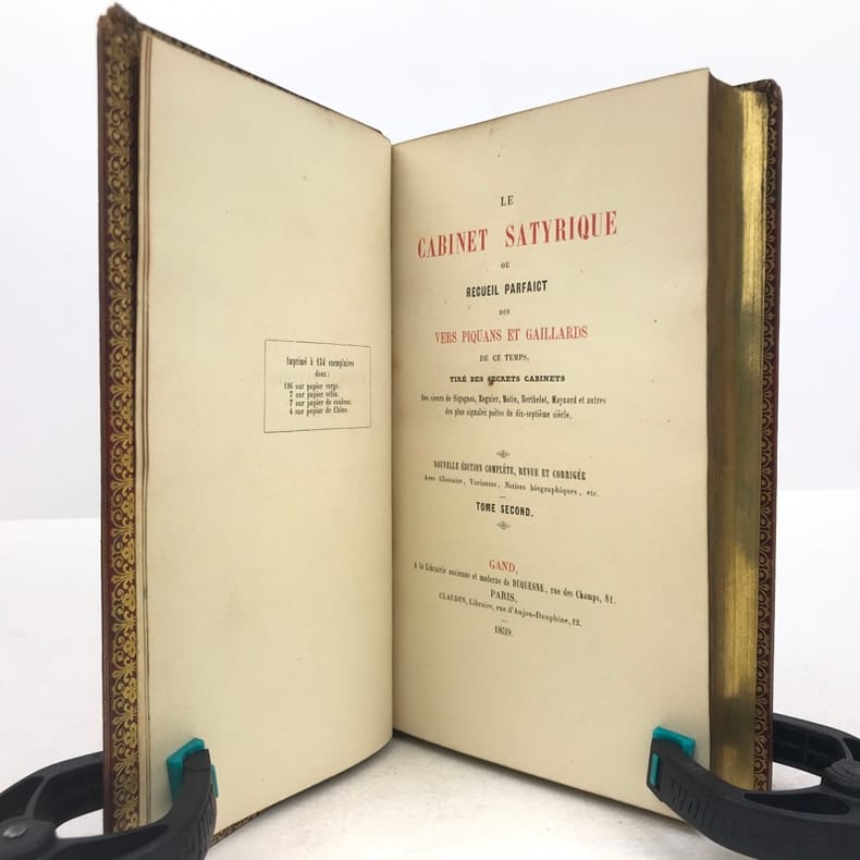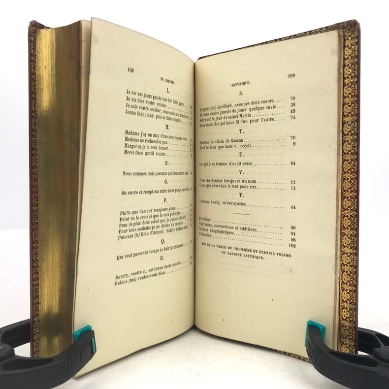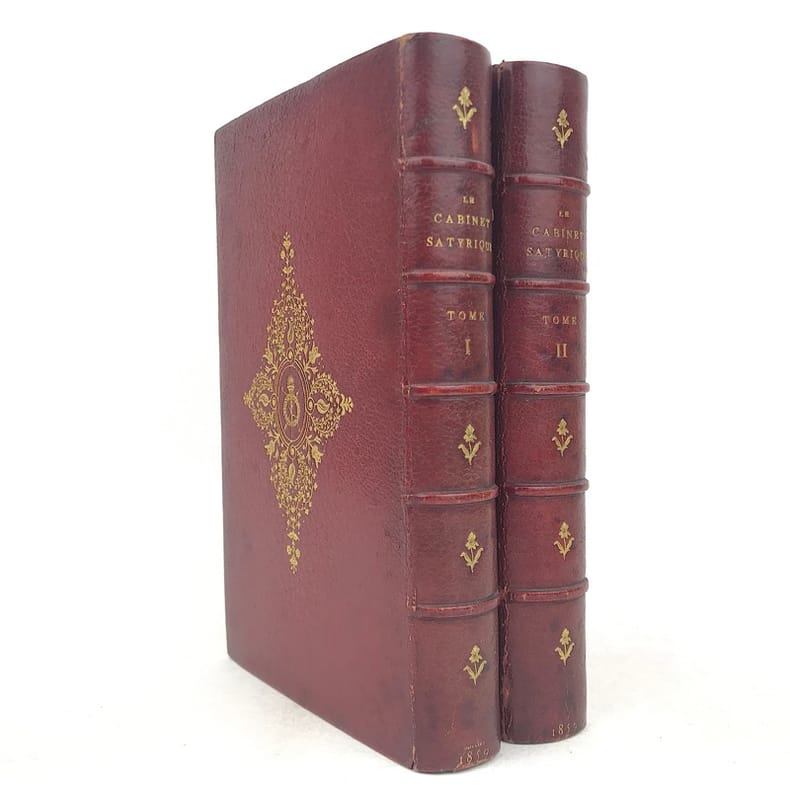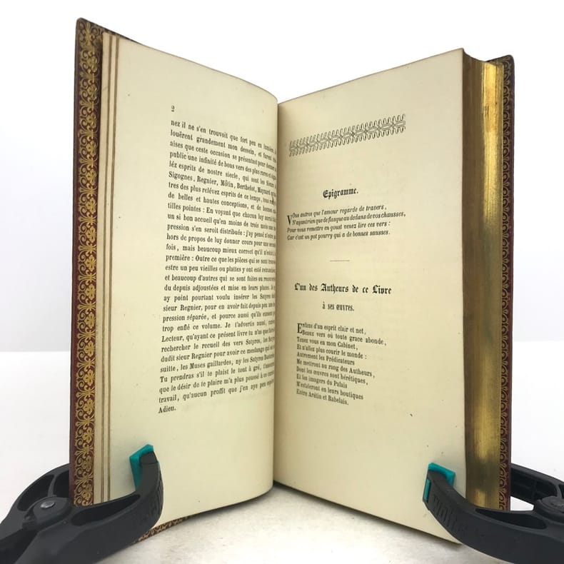 3 tomes en 2 volumes in-12 (17 x 10,5 cm), maroquin rouge (reliure de l’époque signée Gaillard), dos à nerfs orné, médaillon doré au centre des plats, double filet doré sur les coupes, dentelle dorée sur les chasses, tranches dorées sur marbrures, titre en rouge et noir, [4]-335-[1] ; [4]-324-[4]-viii-9 à 112 pages (complet). Taches sur les plats, mors et coins frottés, rousseurs éparses. État correct. Recueil collectif de divers textes licencieux, fortement inspiré du célèbre Parnasse satyrique, publié pour la première fois en 1622, à Paris, et condamné dès l’année suivante. Les auteurs ici présents sont du XVIIe siècle. Étiquette d’ex-libris aux armes sur une garde supérieure : “Ex museo Van der Helle”. Agréable exemplaire.