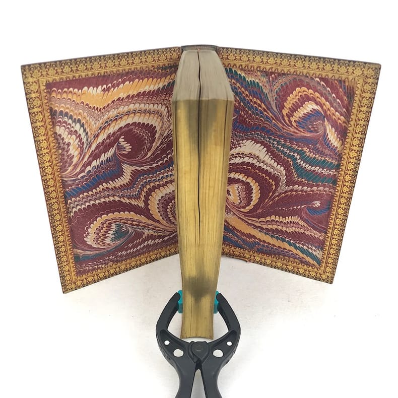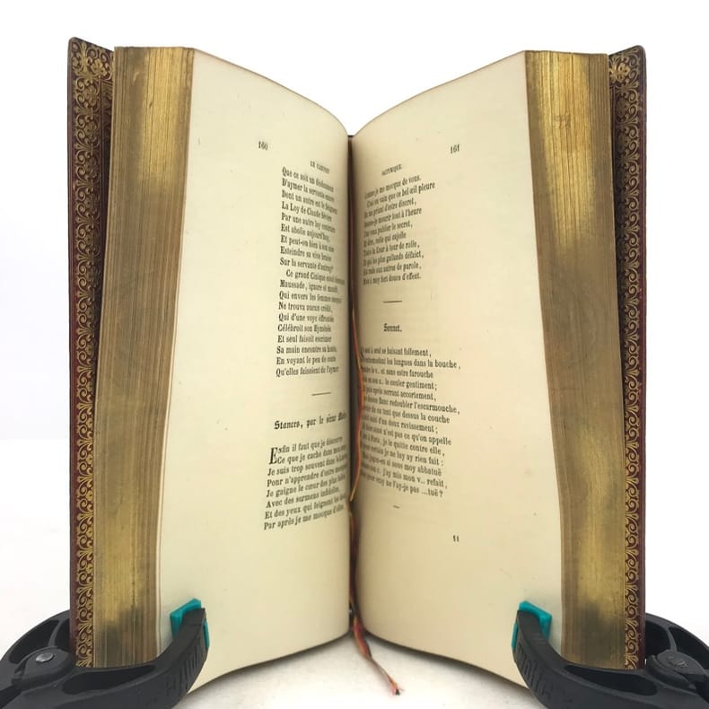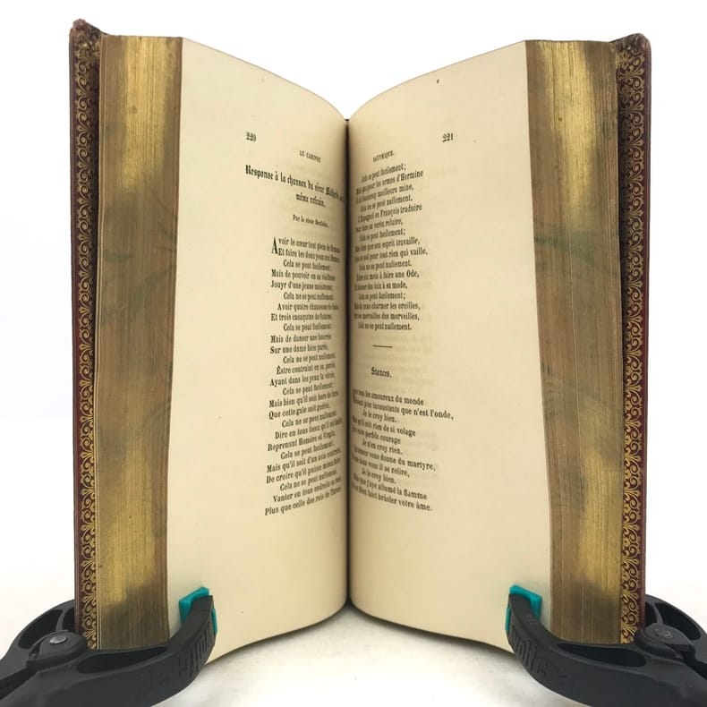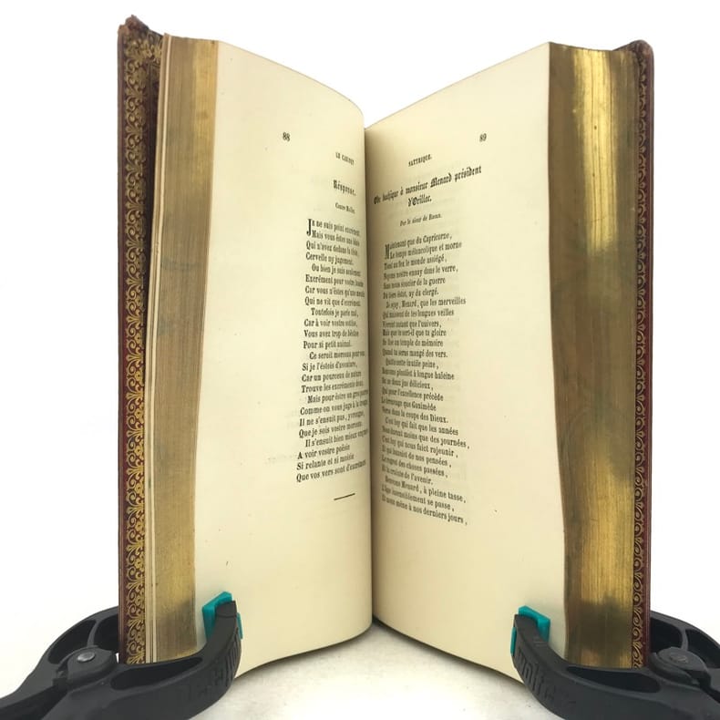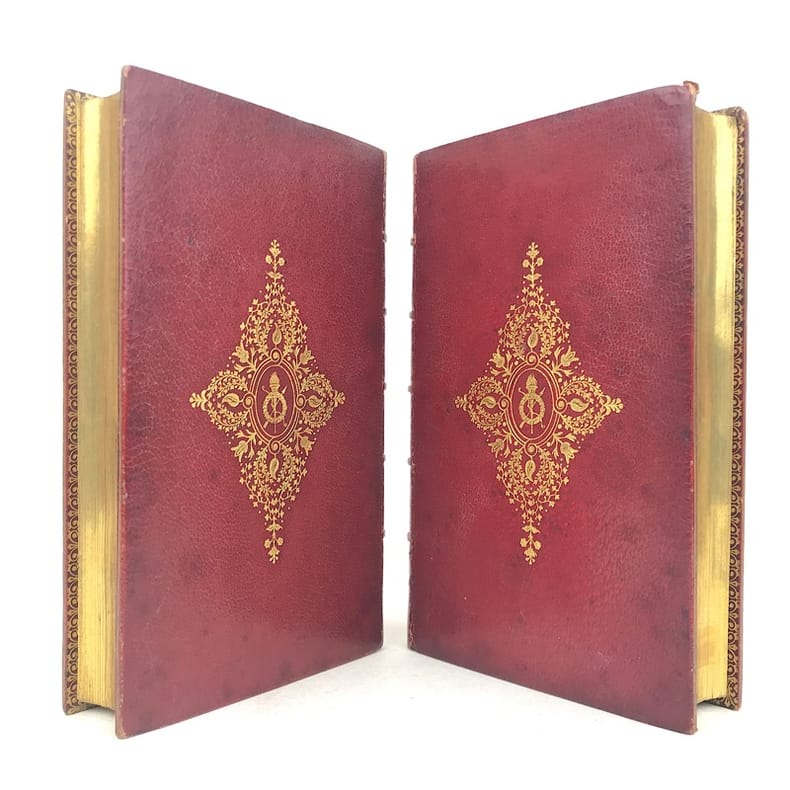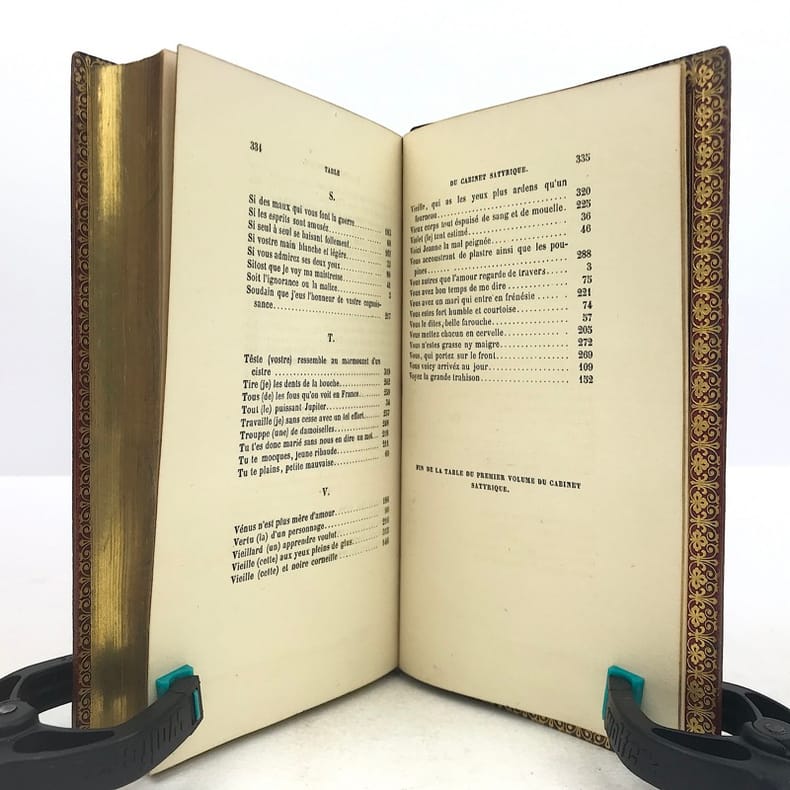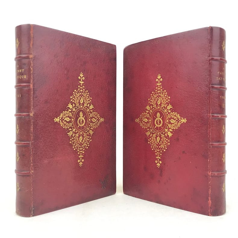 3 tomes en 2 volumes in-12 (17 x 10,5 cm), maroquin rouge (reliure de l’époque signée Gaillard), dos à nerfs orné, médaillon doré au centre des plats, double filet doré sur les coupes, dentelle dorée sur les chasses, tranches dorées sur marbrures, titre en rouge et noir, [4]-335-[1] ; [4]-324-[4]-viii-9 à 112 pages (complet). Taches sur les plats, mors et coins frottés, rousseurs éparses. État correct. Recueil collectif de divers textes licencieux, fortement inspiré du célèbre Parnasse satyrique, publié pour la première fois en 1622, à Paris, et condamné dès l’année suivante. Les auteurs ici présents sont du XVIIe siècle. Étiquette d’ex-libris aux armes sur une garde supérieure : “Ex museo Van der Helle”. Agréable exemplaire.