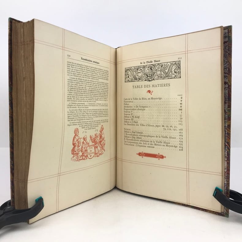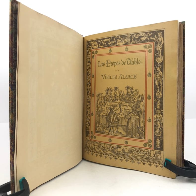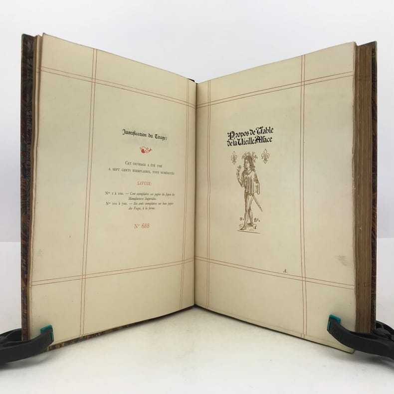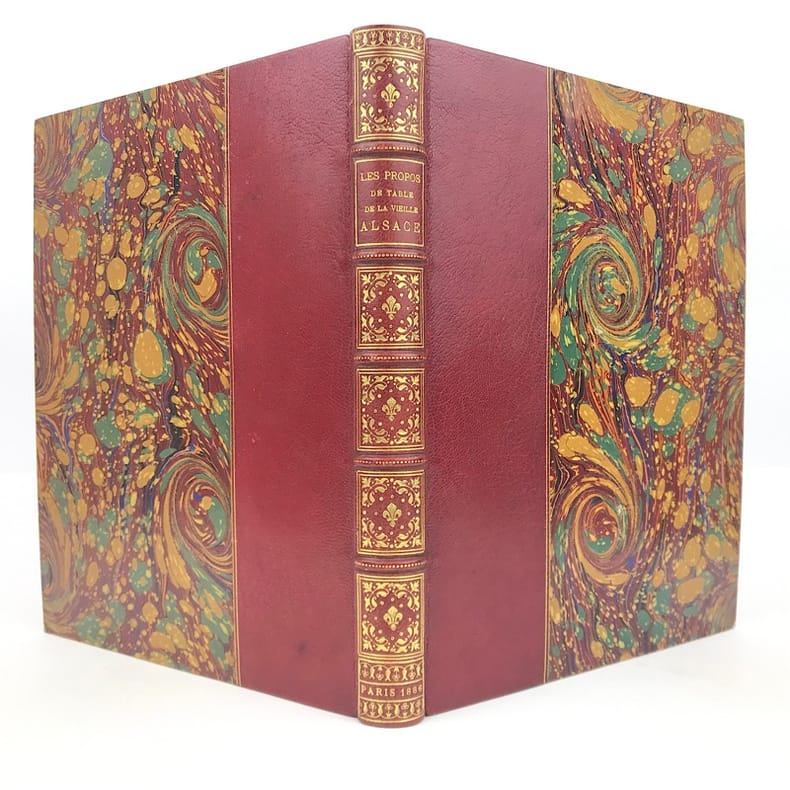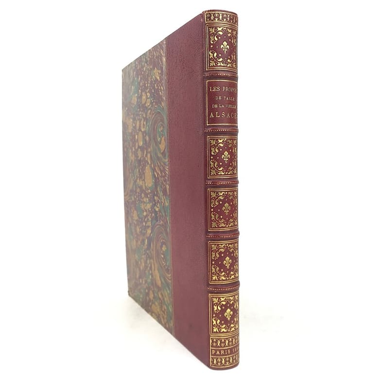 R. Engelmann Paris 1886 Les propos de table de la vieille Alsace. Illustrés tout au long de Dessins originaux des anciens Maîtres alsaciens. Oeuvre de Réconfort ajustée à l'heure présente. Traduite, annotée et enrichie de Compositions nouvelles. Par Émile REIBER, Alsacien Maître ès Arts en la bonne ville de Paris.In-4 carré ( 270 X 210 mm ) de 2ffnch.-XVI-231 pages, demi-chagrin fauve, dos à nerfs janséniste, couvertures illustrées conservées. Frontispice, portraits et nombreux dessins tirés en bistre, dans et hors texte, bandeaux, lettrines et culs-de-lampe rouges, encadrement en double filet rouge du texte. Très bel exemplaire, bien relié de cette édition à tirage limité, numéroté sur beau papier des Vosges à la forme.