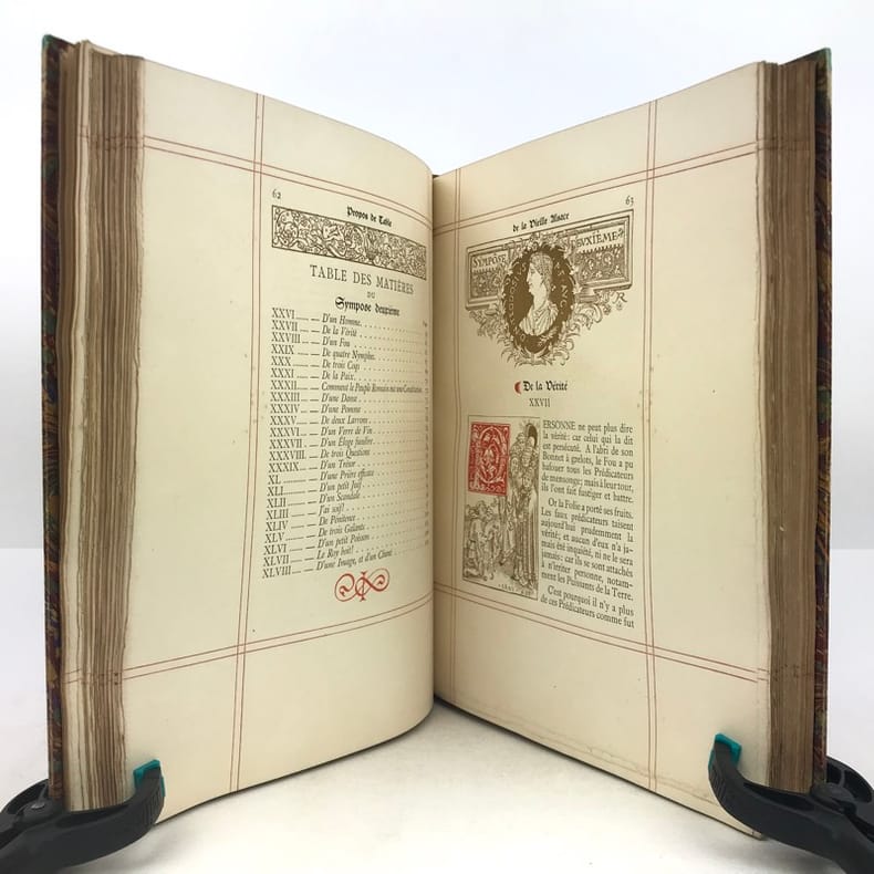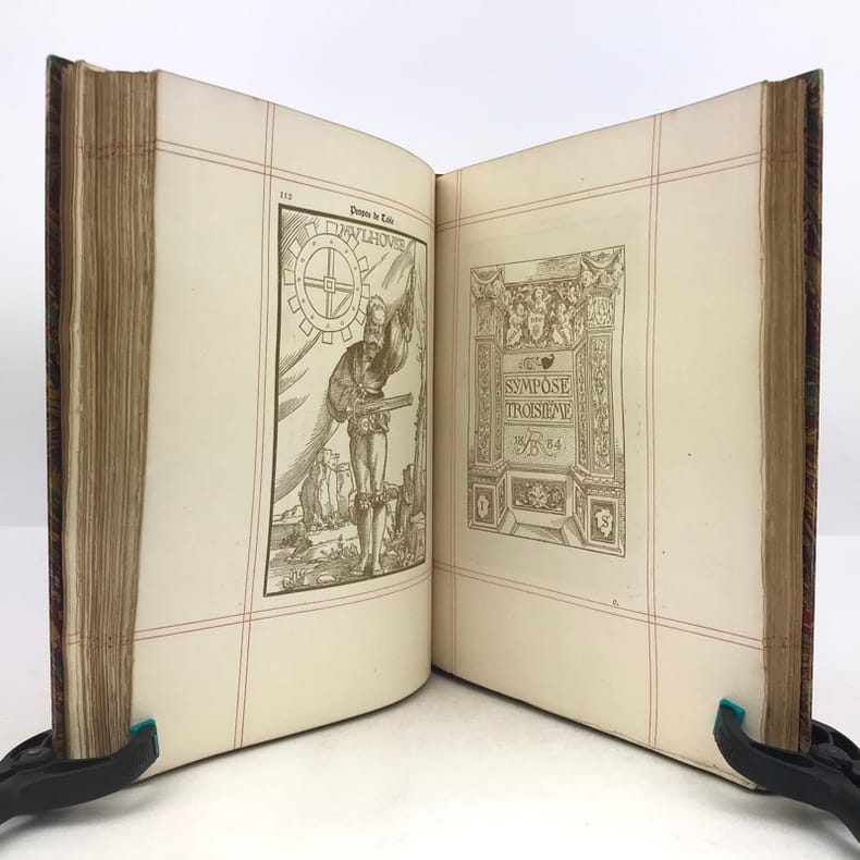Illustrés tout au long de Dessins originaux des anciens Maîtres alsaciens. Oeuvre de Réconfort ajustée à l'heure présente. Traduite, annotée et enrichie de Compositions nouvelles. Par Émile REIBER, Alsacien Maître ès Arts en la bonne ville de Paris. Paris. Engelmann. 1886. In-4 (216 x 270mm) demi-chagrin bleu nuit à coins, dos à 5 nerfs ornés de filets et fleurons or, plats marbrés, gardes jaspées, tête dorée, plats de couverture conservés, 2ff., XVI, 231 pages et 1f. Frontispice, portraits et nombreux dessins tirés en bistre, dans et hors texte, bandeaux, lettrines et culs-de-lampe rouges, encadrement en double filet rouge. 1er plat de couverture illustré en bistre, rouge et or d'une belle scène de repas. Tiré à 700 exemplaires dont 100 sur Japon, celui-ci n°443/600 sur beau papier des Vosges à la forme. Petits défauts sans gravité à la reliure, des rousseurs assez pâles mais bon exemplaire, bien relié de ce séduisant et rare ouvrage. Vicaire, 736.