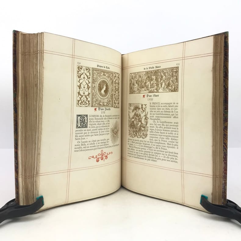 1 volume in-4 (26 x 21 cm), demi-maroquin rouge (reliure moderne, signée A. Meyer), dos à nerfs orné d’un décor doré fleurdelisé, tête dorée, couverture illustrée conservée, texte encadré d’un double filet rouge. [4]-xvi-231-[5] pages (complet). Très bon état. Recueil imprimé par Engelmann en 3 couleurs et entièrement illustré in-texte de dessins des anciens maîtres alsaciens, certains à pleine page. Tirage limité à 700 exemplaires, celui-ci 1/600 sur beau papier des Vosges, à la forme, (n°688), second papier après 100 sur papier du Japon. Émile Auguste Reiber (1826-1893), dessinateur d'objets d'art et architecte français. Bel exemplaire.