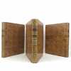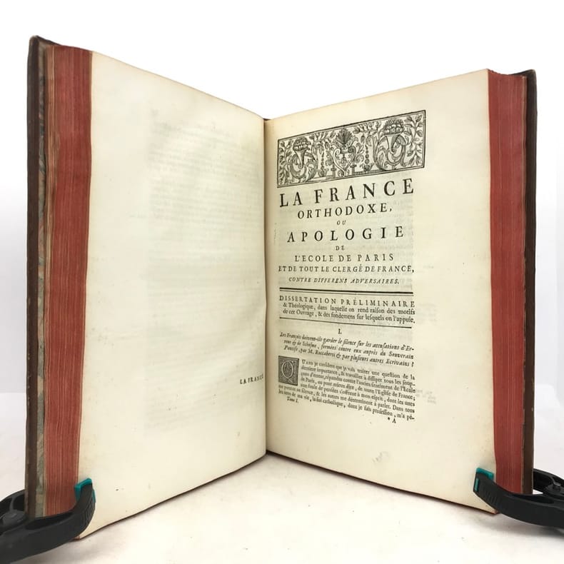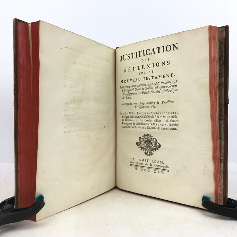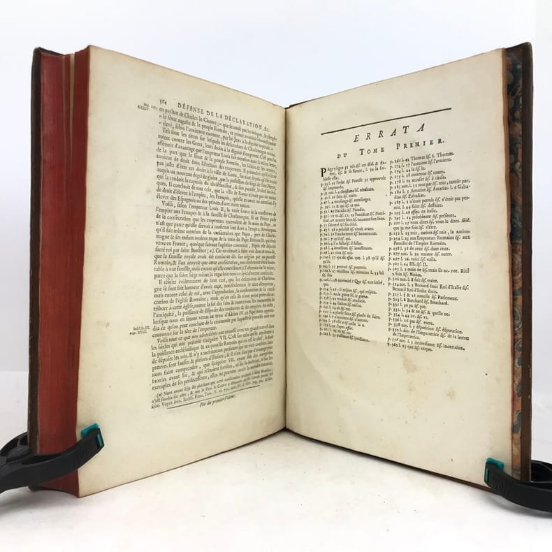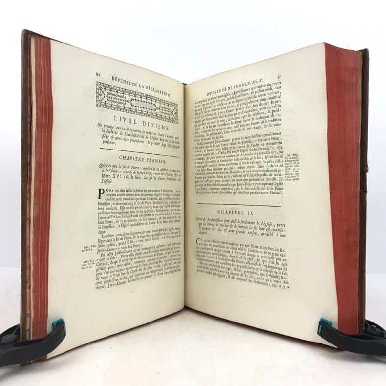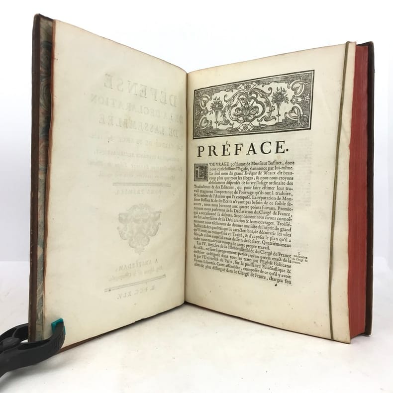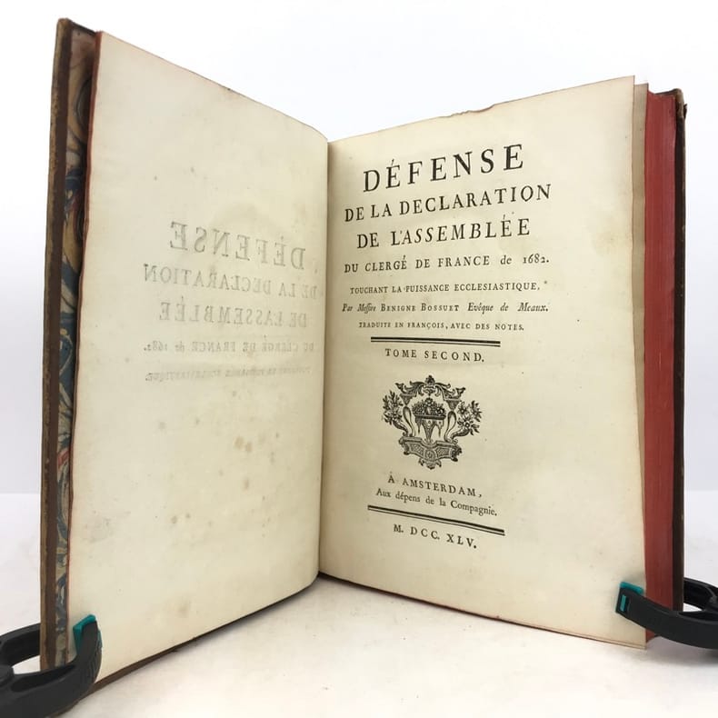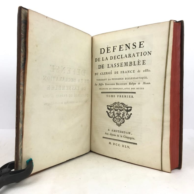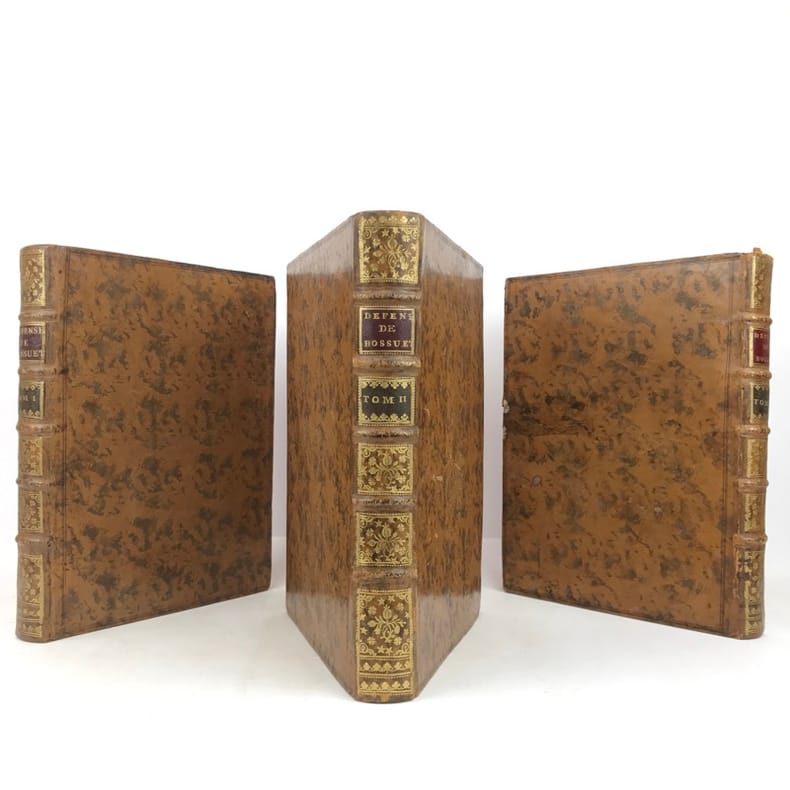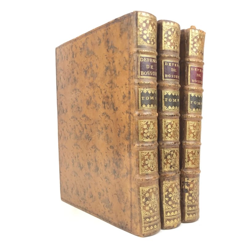 3 volumes in-4 (25,5 x 19 cm), plein veau blond marbré (reliure de l’époque), dos à nerfs ornés et caissons fleuronnés, pièces de titre de maroquin rouge et de tomaison olive, filet double sur les coupes, tranches rouges, [4]-xxxvii-1 bl.-14-[2]-85-1 bl.-364-[2] ; [4]-491-1 bl.-[2] ; [4]-418-2 bl.-[2]-xx-47-[1] pages (complet). Petits frottements angulaires, léger accident à une coiffe, deux coins émoussés, petit accroc intérieur clair. Bon état. Intéressante traduction française faite par l’abbé Leroy, dans laquelle parurent pour la première fois la Dissertation préliminaire, la Préface et les trois premiers livres du travail de Bossuet, composés en 1685 (Verlaque, p.82). Édition illustrée d’une vignette de titre, de jolis bandeaux et culs-de-lampe. Exemplaire bien complet des feuillets d’errata dans chaque volume. Le premier contient le Mémoire de Bossuet présenté au Roi et termine avec la Justification (pas toujours présente selon Brunet). En 1682, Bossuet répond à l’appel de Louis XIV par l’établissement de l’« église gallicane », favorisant l’absolutisme, en opposition au pape Innocent XI et à l’Affaire de la régale. Plusieurs États européens verront dans le principe de prépondérance des Conciles, la possibilité de se détacher de la tutelle du Saint-Siège. Le pape, piquant : « si les conciles sont supérieurs aux papes qui tirent leur pouvoir de Dieu, les états généraux devraient avoir loisir de formuler la même revendication à l'encontre du roi. » Agréable exemplaire.