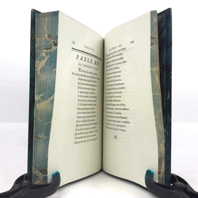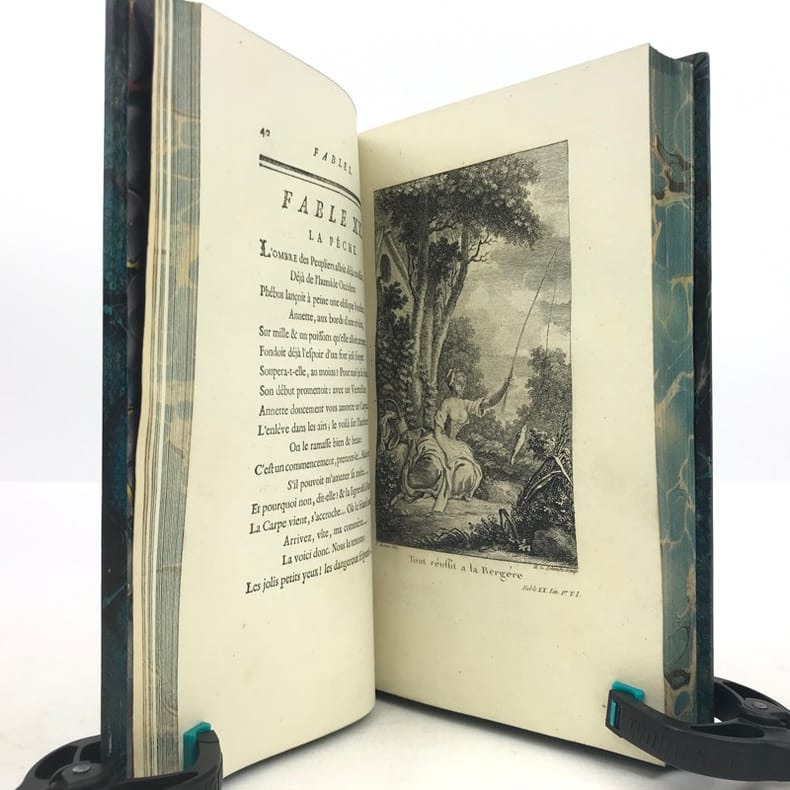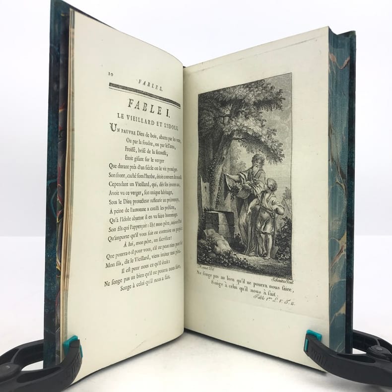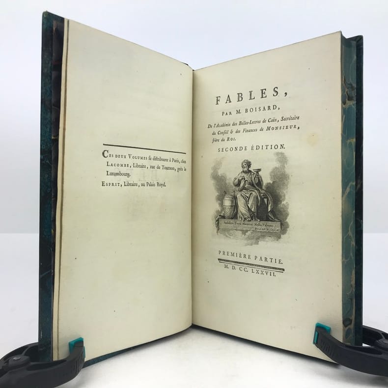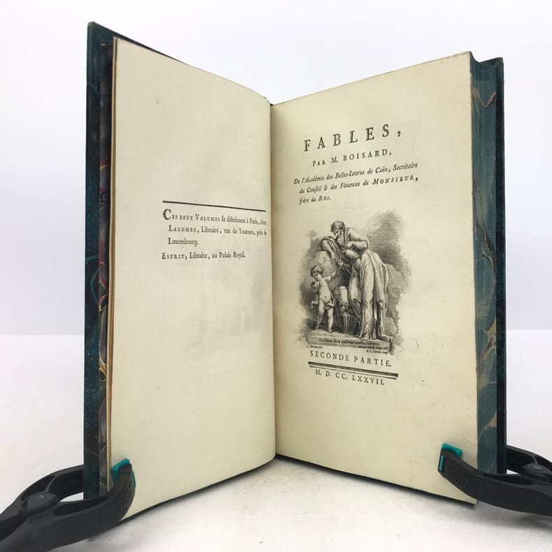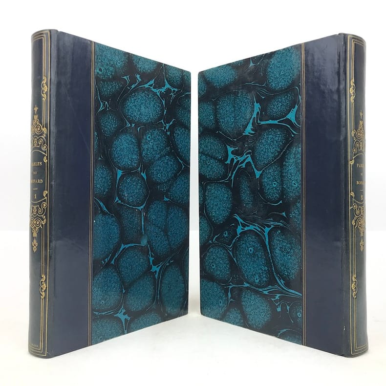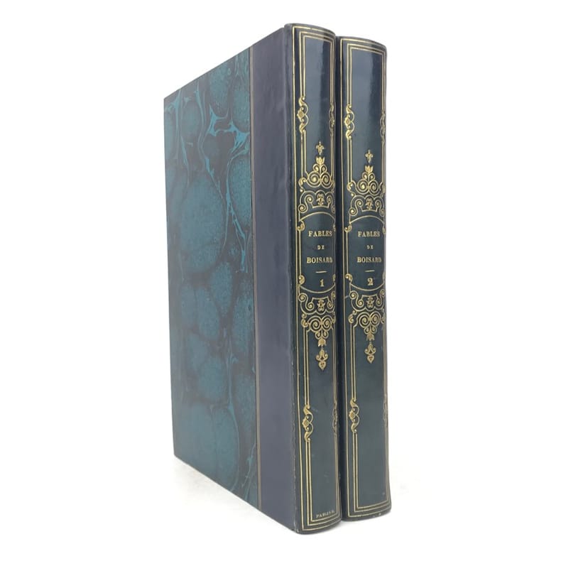 2 volumes in-8 (21,5 x 13,5 cm), demi-veau bleu glacé (reliure postérieure du XIXe siècle), dos lisse romantique doré par Paulin avec sa signature dorée en pied du premier tome, double filet doré en bordure, tranches marbrées, ex-libris de R. Chardey, viii-9 à 220-[2] ; 307-[1] pages (complet). Gardes brunies. Bon état. Nouvelle édition, illustrée de 9 gravures hors-texte, réalisées par Monnet et Saint-Aubin. Jean-Jacques Boisard (1744-1833) est un fabuliste français. Très appréciées au XVIIIe siècle, les fables sont un moyen pour l'auteur de rencontrer un franc succès dès leur première parution en 1764. Bel exemplaire.