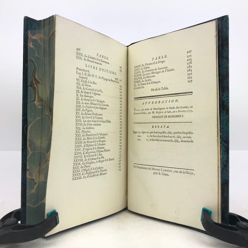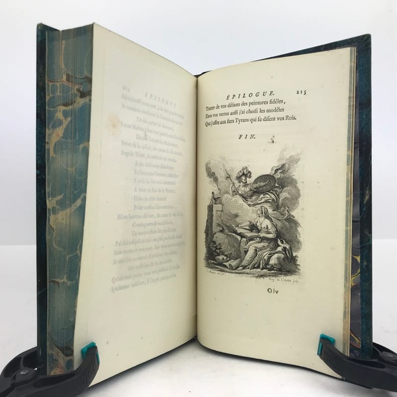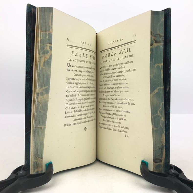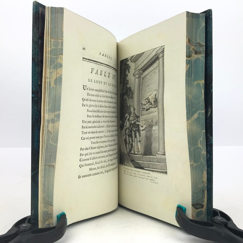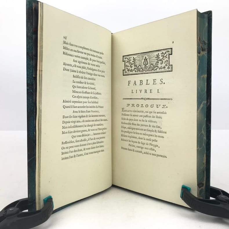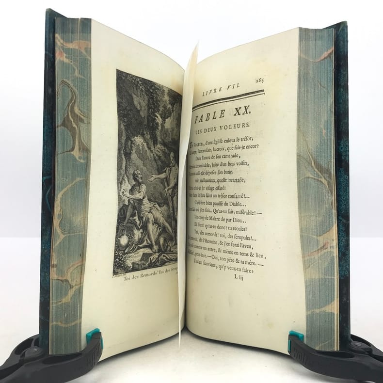 Elle comprend 120 Fables en édition originale. Paris, Denis Thierry et Claude Barbin, 1678-1679-1694. 5 volumes, nombreuses figures de F. Chauveau, gravées sur cuivre et tirées à mi-page. Ensemble 5 volumes in-12. Plein maroquin bleu nuit, triple filet doré autour des plats, dos à nerfs richement ornés, double filet or sur les coupes, roulette intérieure, tranches dorées sur marbrures. Reliure signée de Belz-Niédrée vers 1865. Tome I : 57 gravures dans le texte, relié sans le f. d’errata puisque les fautes mentionnées ont été corrigées dans notre exemplaire ; Tome II : 60 gravures dans le texte ; Tome III : 44 gravures dans le texte ; Tome IV : 43 gravures dans le texte ; Tome V : 31 gravures dans le texte. Pte. déchirure anciennement restaurée pp. 91 et 221 du tome IV. 159 x 88 mm.